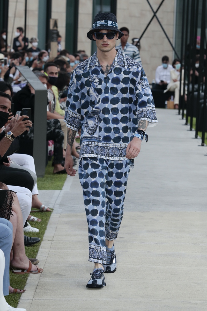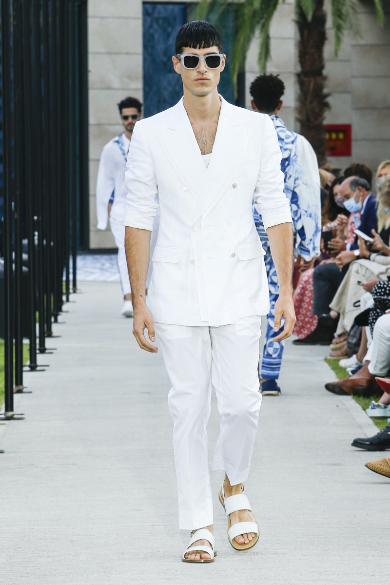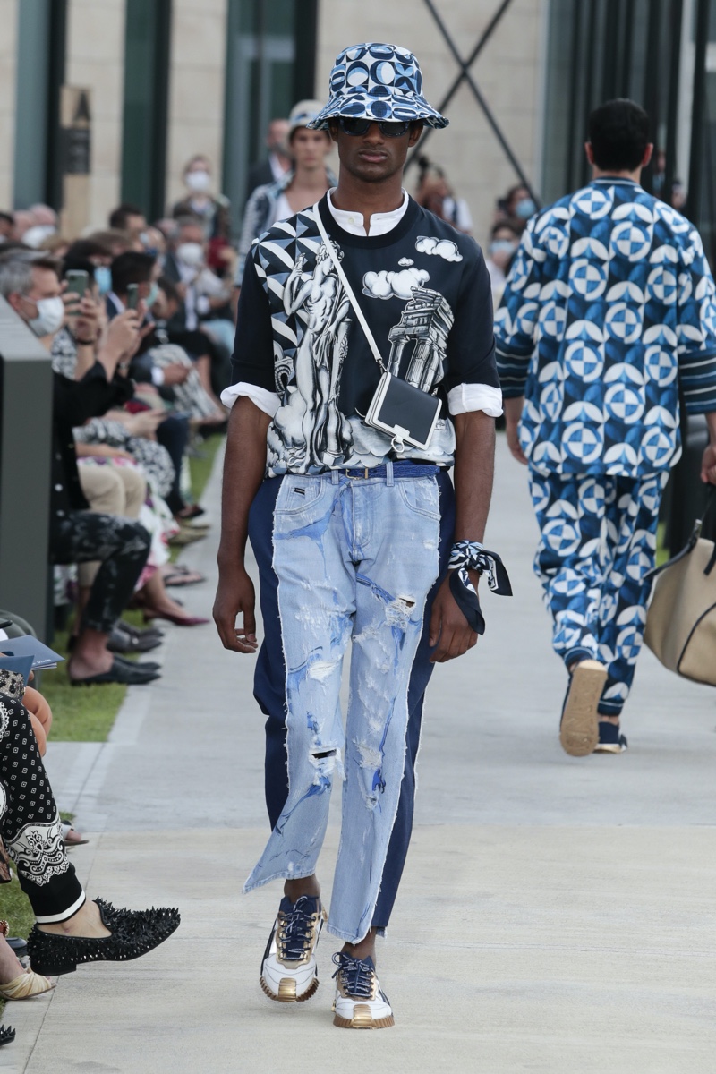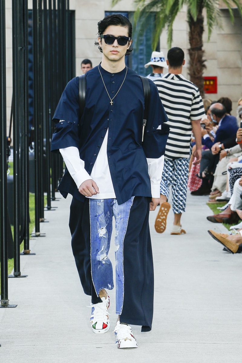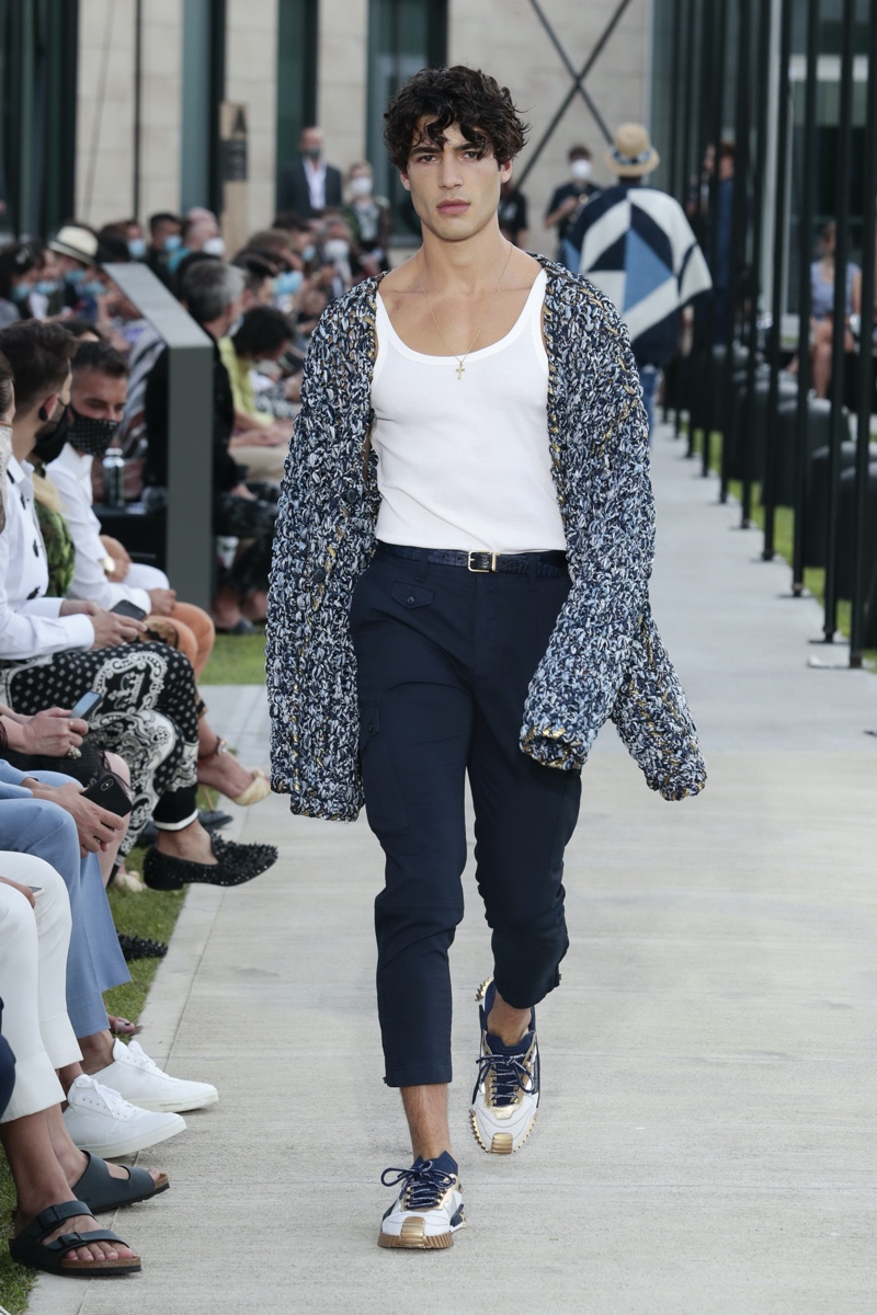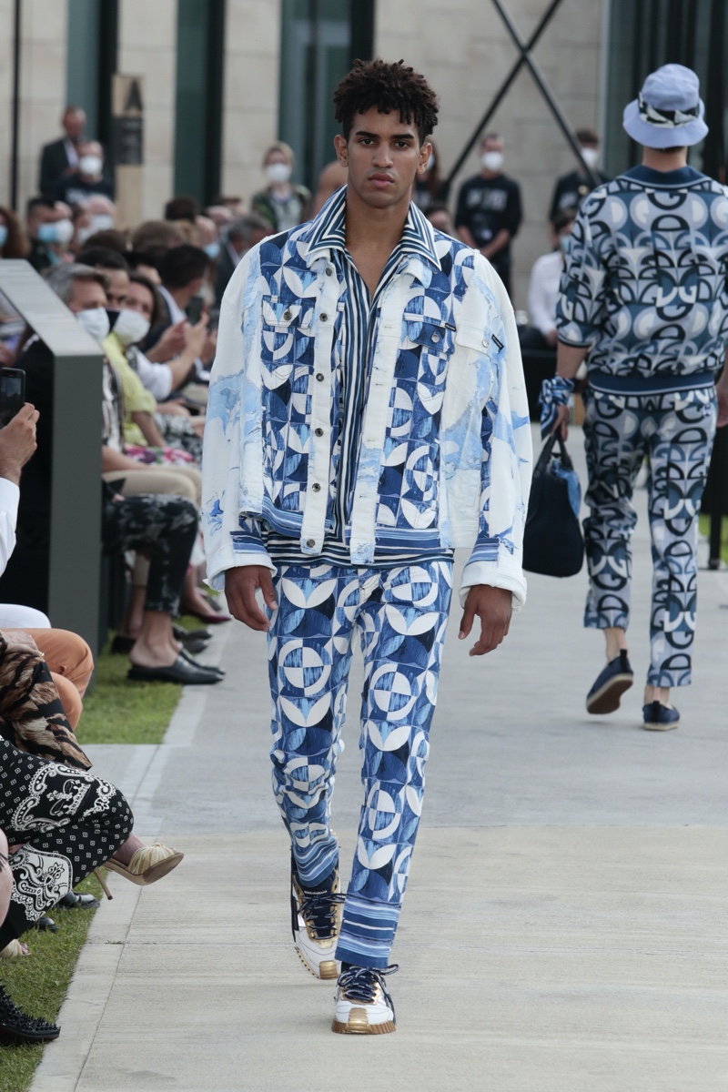 There’s no better time than now for a healthy dose of escapism and Dolce & Gabbana serves just that with its spring-summer 2021 collection. The Italian fashion house imagines a summer holiday in Sorrento for its latest outing. Relaxed shapes define the range as Domenico Dolce and Stefano Gabbana deliver a varied lineup of blue fashions inspired by the sea. Offset by white, the collection’s pieces range from graphic, boxy shirts and billowing trousers to white tunics. In addition to deconstructed denim and tailoring, Dolce & Gabbana offers a streamlined approach to accessories for the season. Classic shades come together with berets, bucket hats, leather sandals, and loafers.