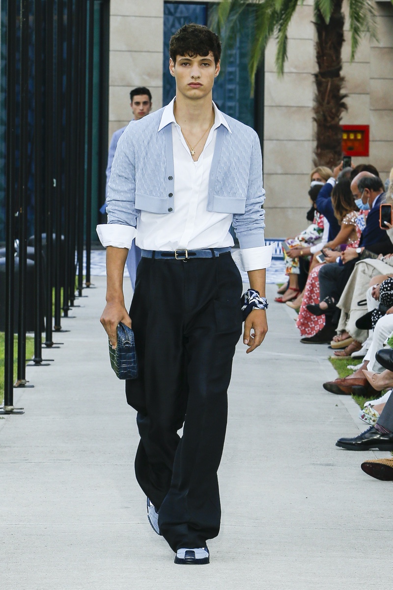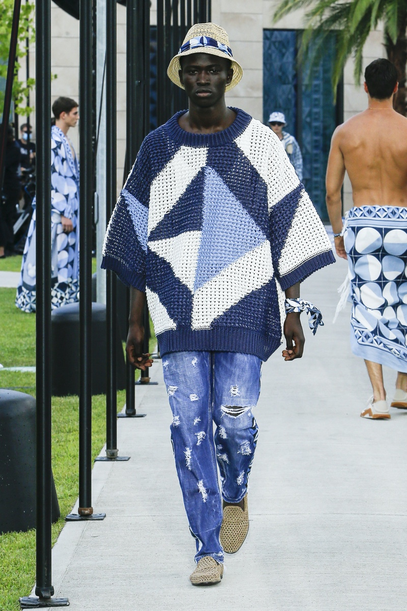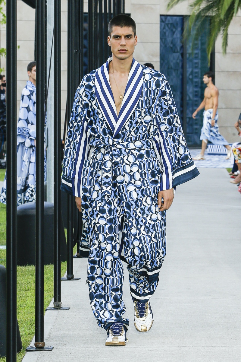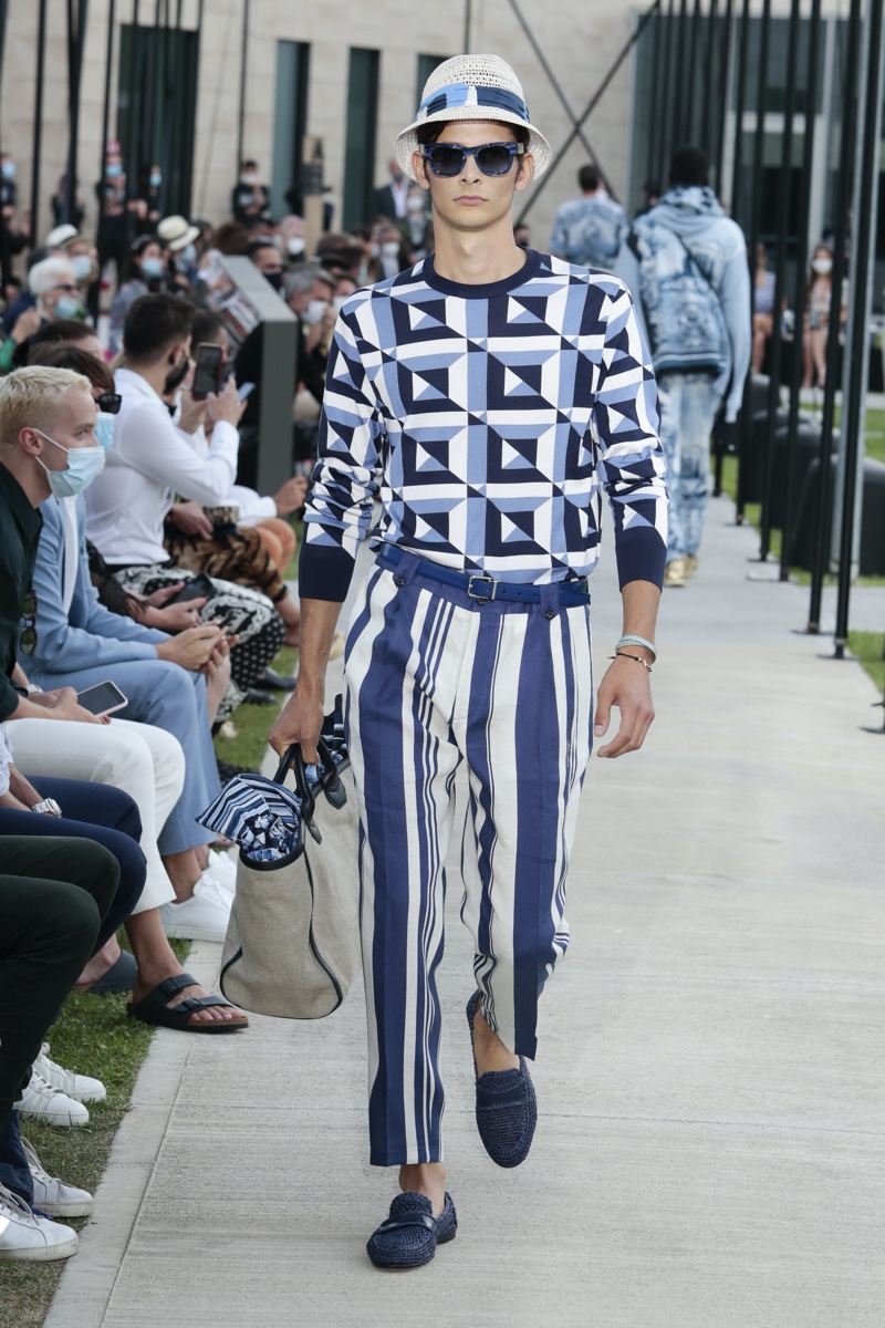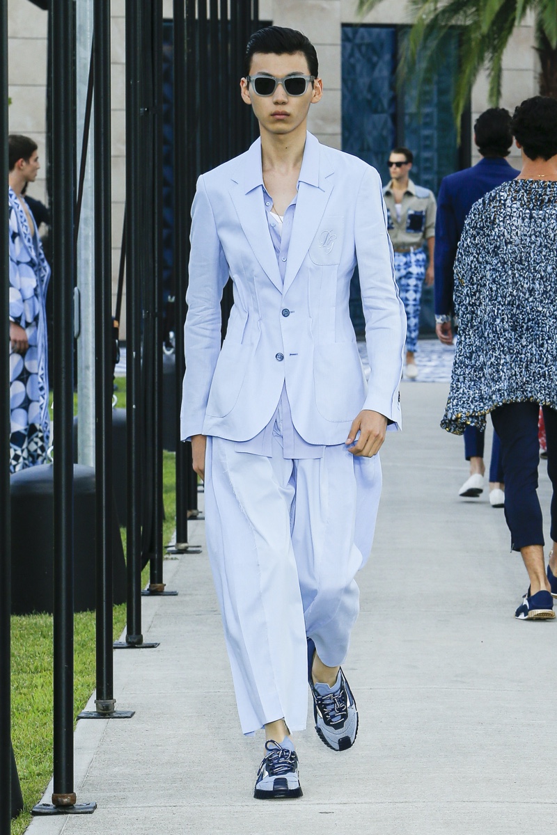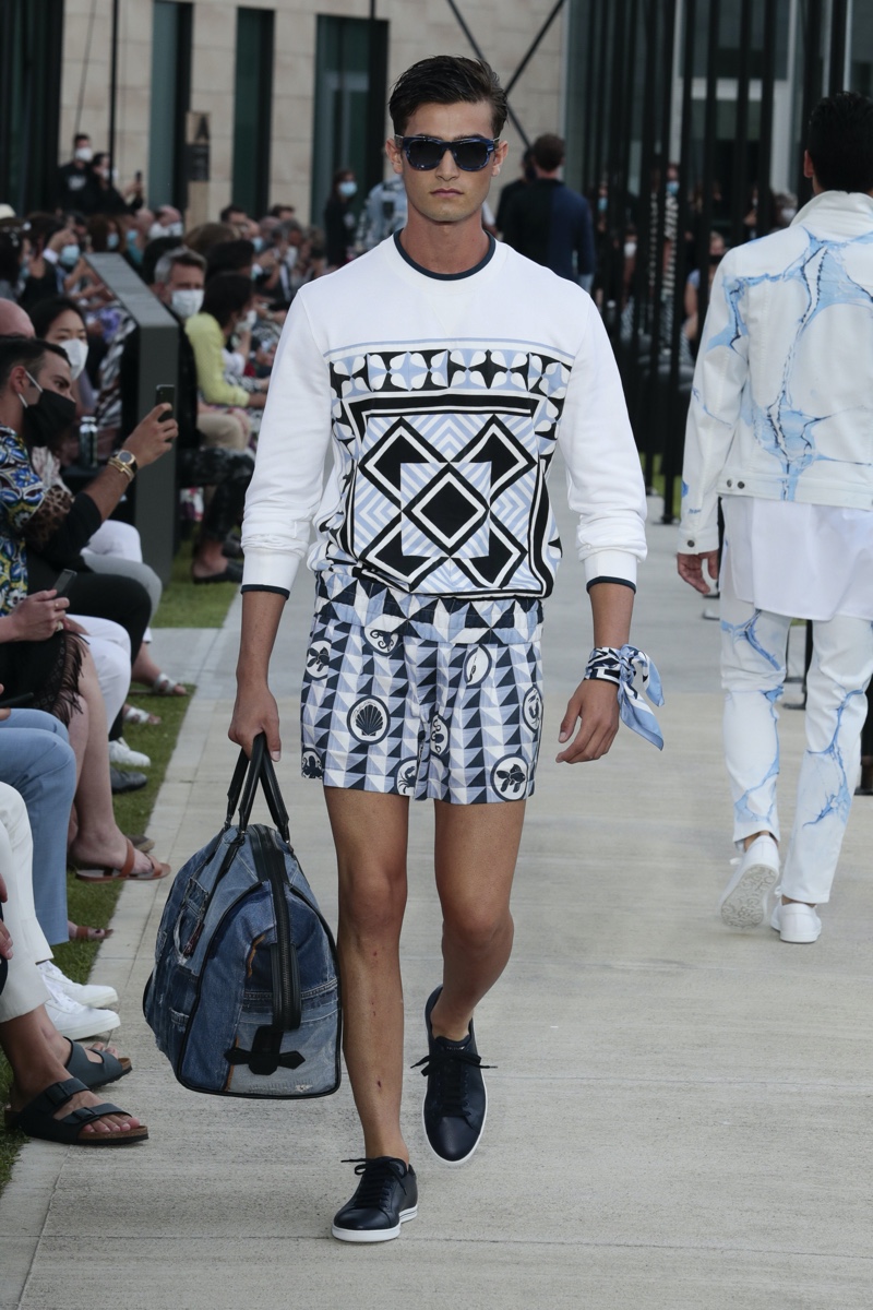 There’s no better time than now for a healthy dose of escapism and Dolce & Gabbana serves just that with its spring-summer 2021 collection. The Italian fashion house imagines a summer holiday in Sorrento for its latest outing. Relaxed shapes define the range as Domenico Dolce and Stefano Gabbana deliver a varied lineup of blue fashions inspired by the sea. Offset by white, the collection’s pieces range from graphic, boxy shirts and billowing trousers to white tunics. In addition to deconstructed denim and tailoring, Dolce & Gabbana offers a streamlined approach to accessories for the season. Classic shades come together with berets, bucket hats, leather sandals, and loafers.
