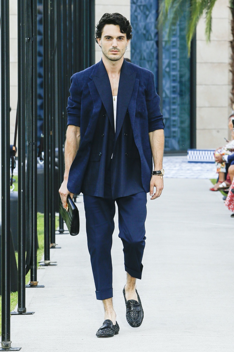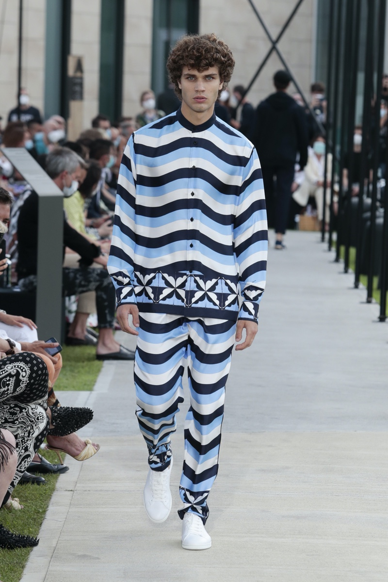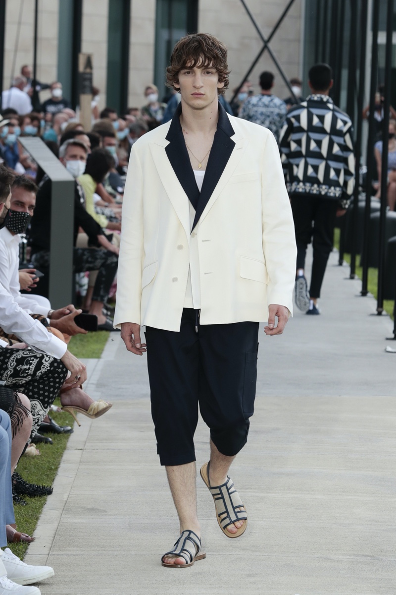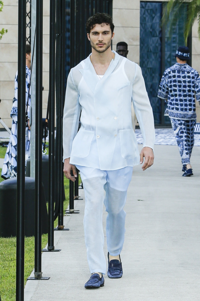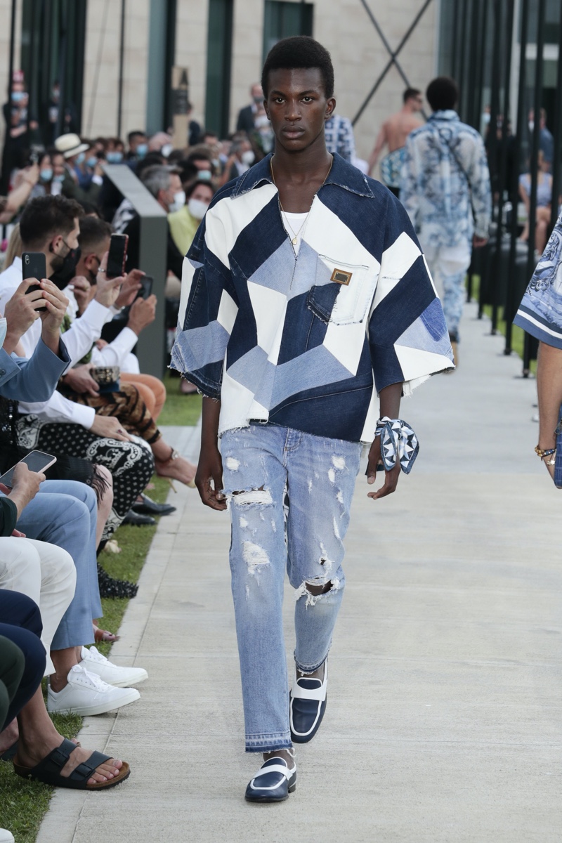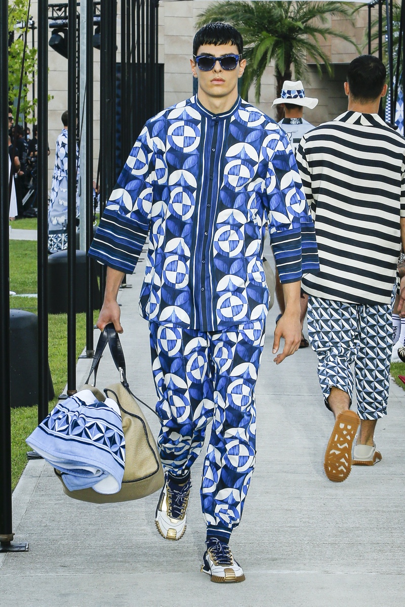 There’s no better time than now for a healthy dose of escapism and Dolce & Gabbana serves just that with its spring-summer 2021 collection. The Italian fashion house imagines a summer holiday in Sorrento for its latest outing. Relaxed shapes define the range as Domenico Dolce and Stefano Gabbana deliver a varied lineup of blue fashions inspired by the sea. Offset by white, the collection’s pieces range from graphic, boxy shirts and billowing trousers to white tunics. In addition to deconstructed denim and tailoring, Dolce & Gabbana offers a streamlined approach to accessories for the season. Classic shades come together with berets, bucket hats, leather sandals, and loafers.