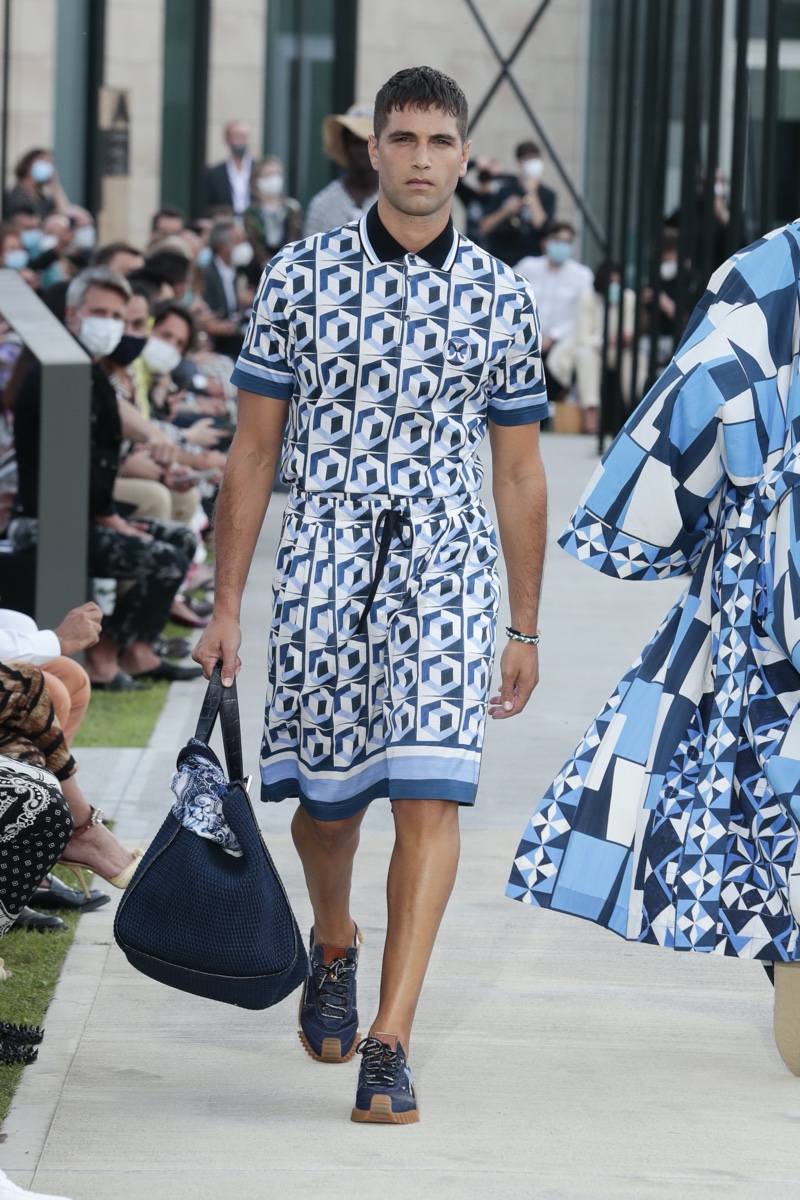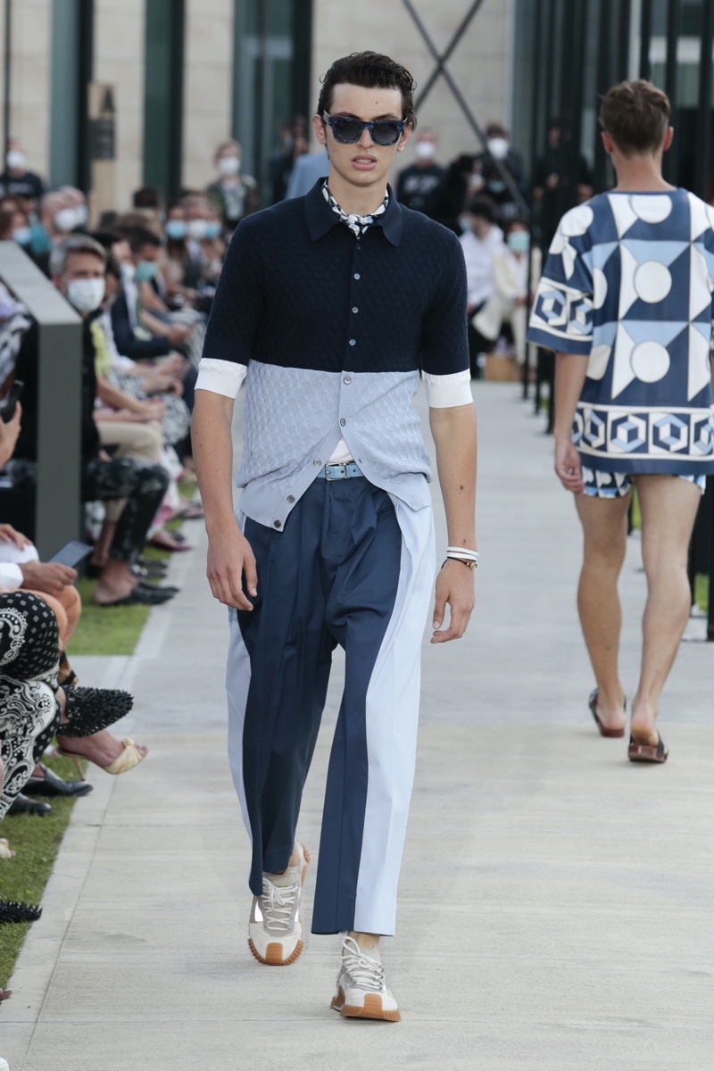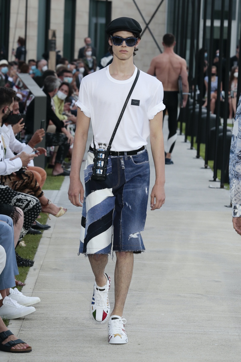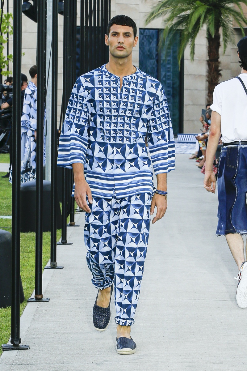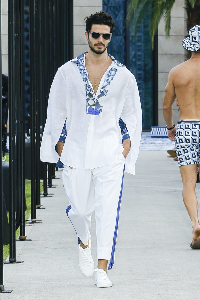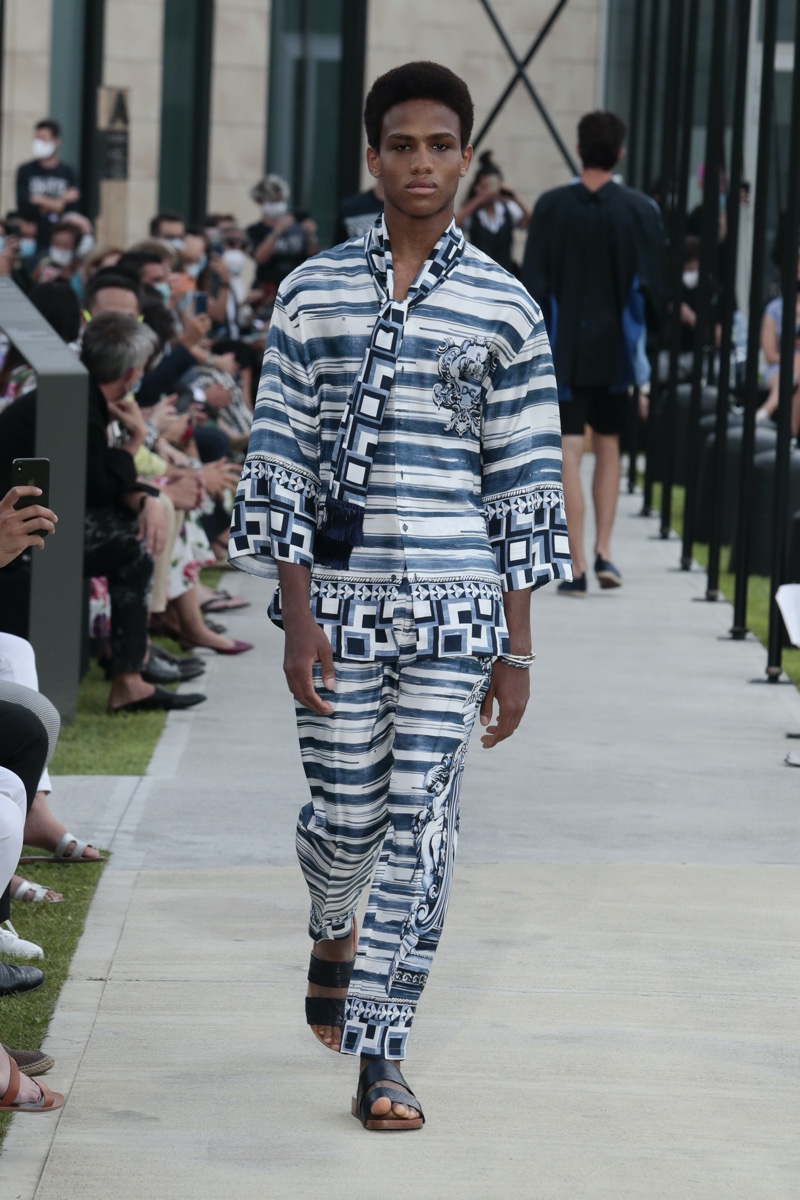 There’s no better time than now for a healthy dose of escapism and Dolce & Gabbana serves just that with its spring-summer 2021 collection. The Italian fashion house imagines a summer holiday in Sorrento for its latest outing. Relaxed shapes define the range as Domenico Dolce and Stefano Gabbana deliver a varied lineup of blue fashions inspired by the sea. Offset by white, the collection’s pieces range from graphic, boxy shirts and billowing trousers to white tunics. In addition to deconstructed denim and tailoring, Dolce & Gabbana offers a streamlined approach to accessories for the season. Classic shades come together with berets, bucket hats, leather sandals, and loafers.