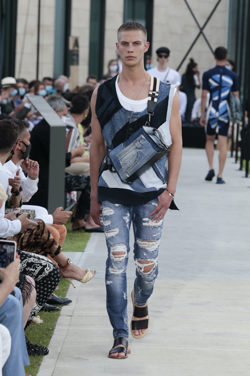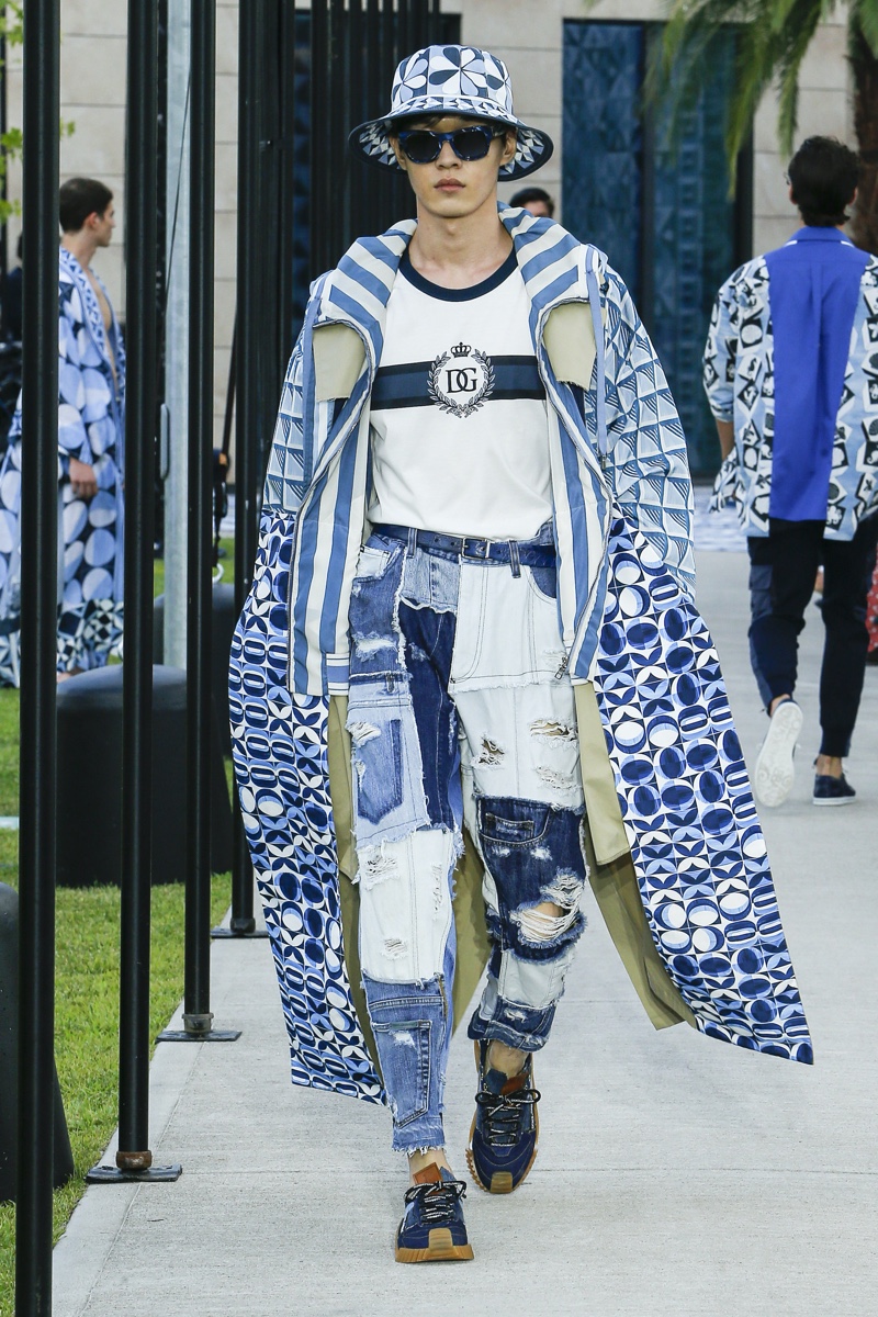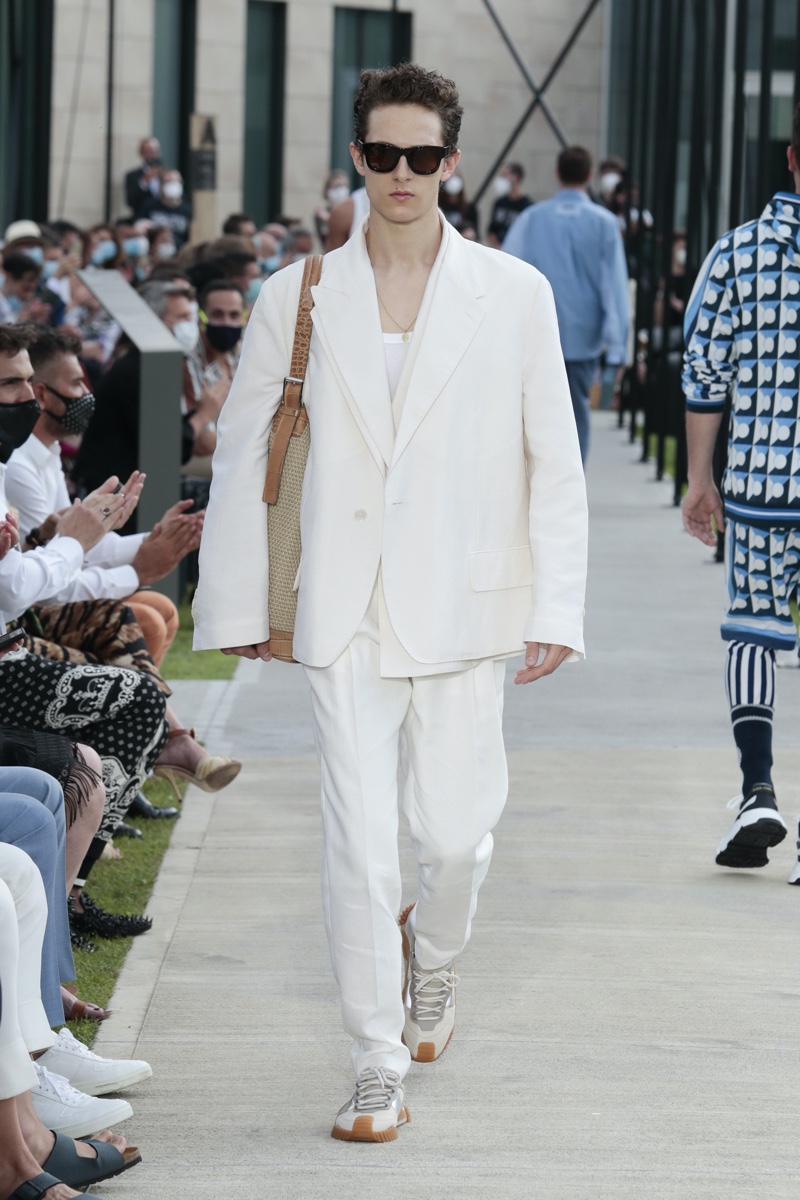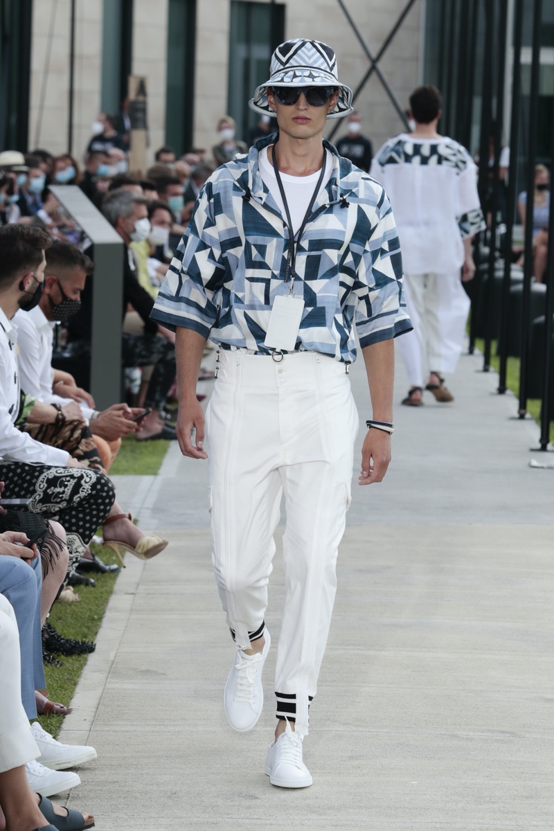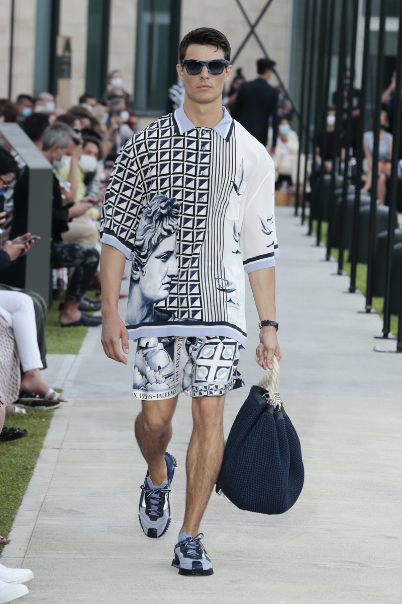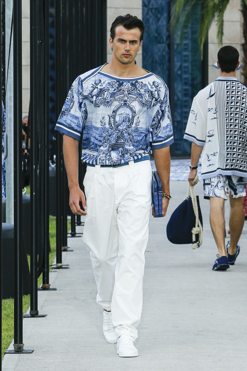 There’s no better time than now for a healthy dose of escapism and Dolce & Gabbana serves just that with its spring-summer 2021 collection. The Italian fashion house imagines a summer holiday in Sorrento for its latest outing. Relaxed shapes define the range as Domenico Dolce and Stefano Gabbana deliver a varied lineup of blue fashions inspired by the sea. Offset by white, the collection’s pieces range from graphic, boxy shirts and billowing trousers to white tunics. In addition to deconstructed denim and tailoring, Dolce & Gabbana offers a streamlined approach to accessories for the season. Classic shades come together with berets, bucket hats, leather sandals, and loafers.