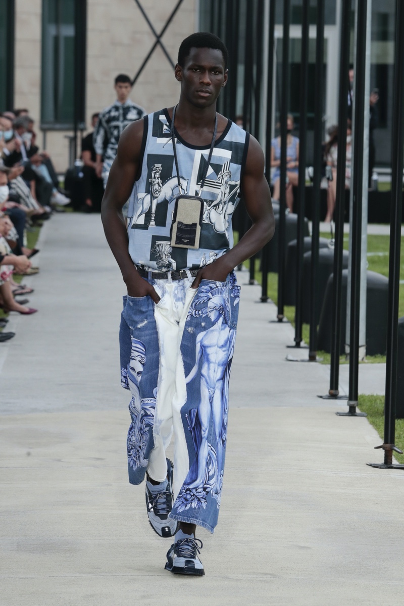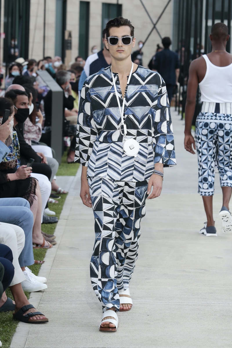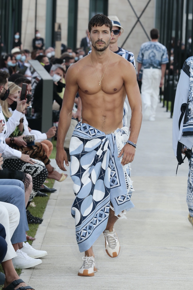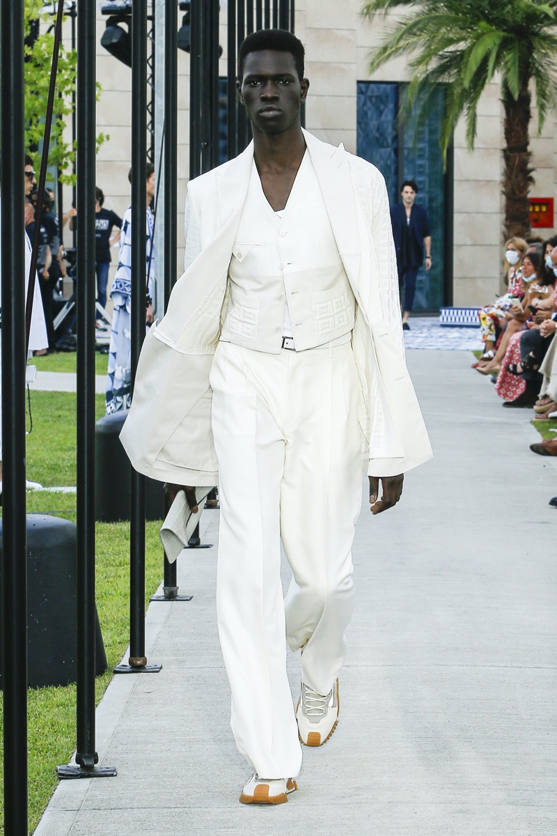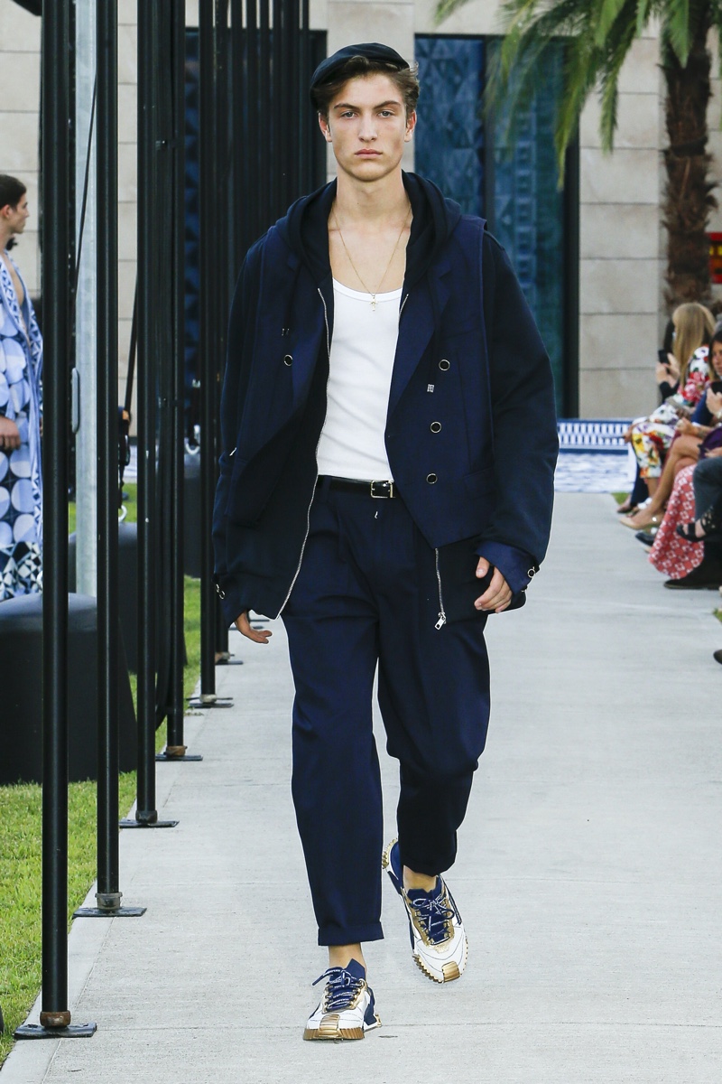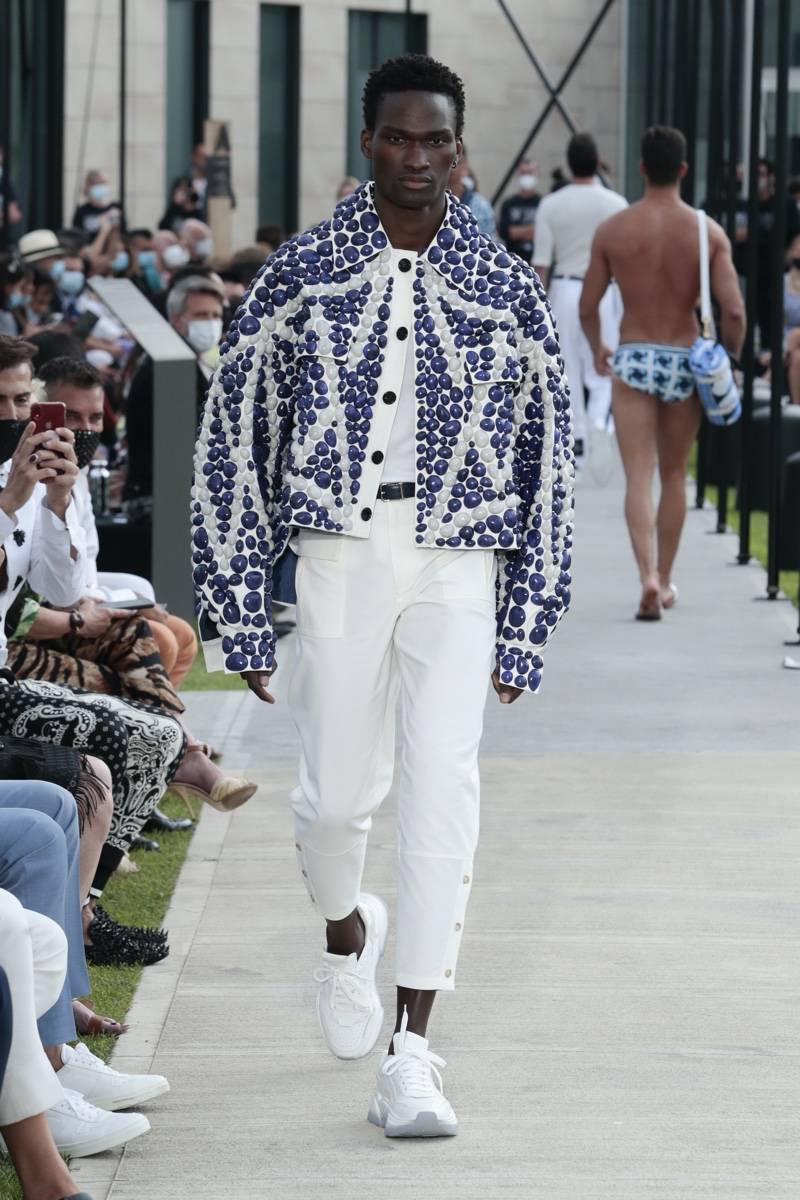 There’s no better time than now for a healthy dose of escapism and Dolce & Gabbana serves just that with its spring-summer 2021 collection. The Italian fashion house imagines a summer holiday in Sorrento for its latest outing. Relaxed shapes define the range as Domenico Dolce and Stefano Gabbana deliver a varied lineup of blue fashions inspired by the sea. Offset by white, the collection’s pieces range from graphic, boxy shirts and billowing trousers to white tunics. In addition to deconstructed denim and tailoring, Dolce & Gabbana offers a streamlined approach to accessories for the season. Classic shades come together with berets, bucket hats, leather sandals, and loafers.