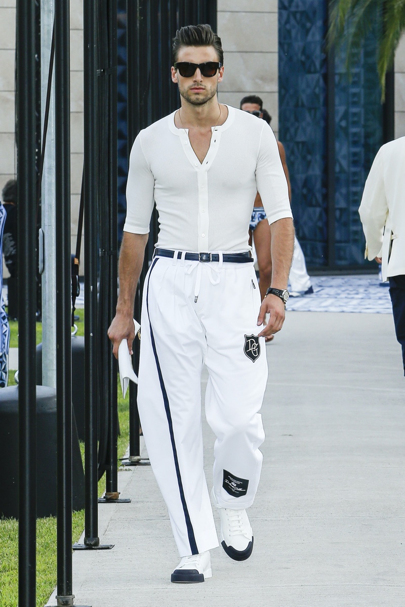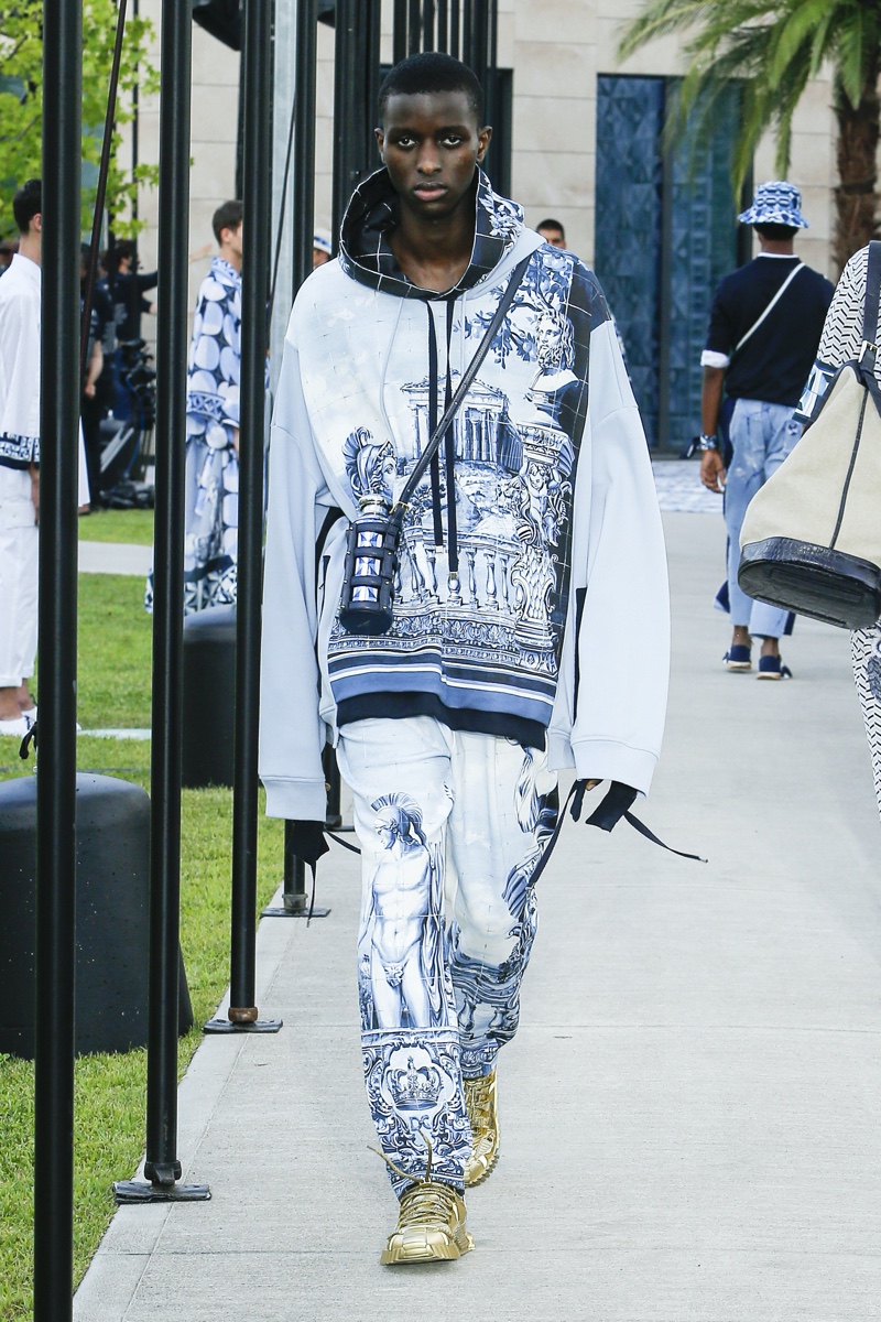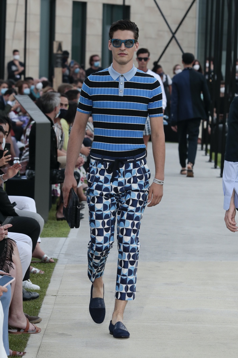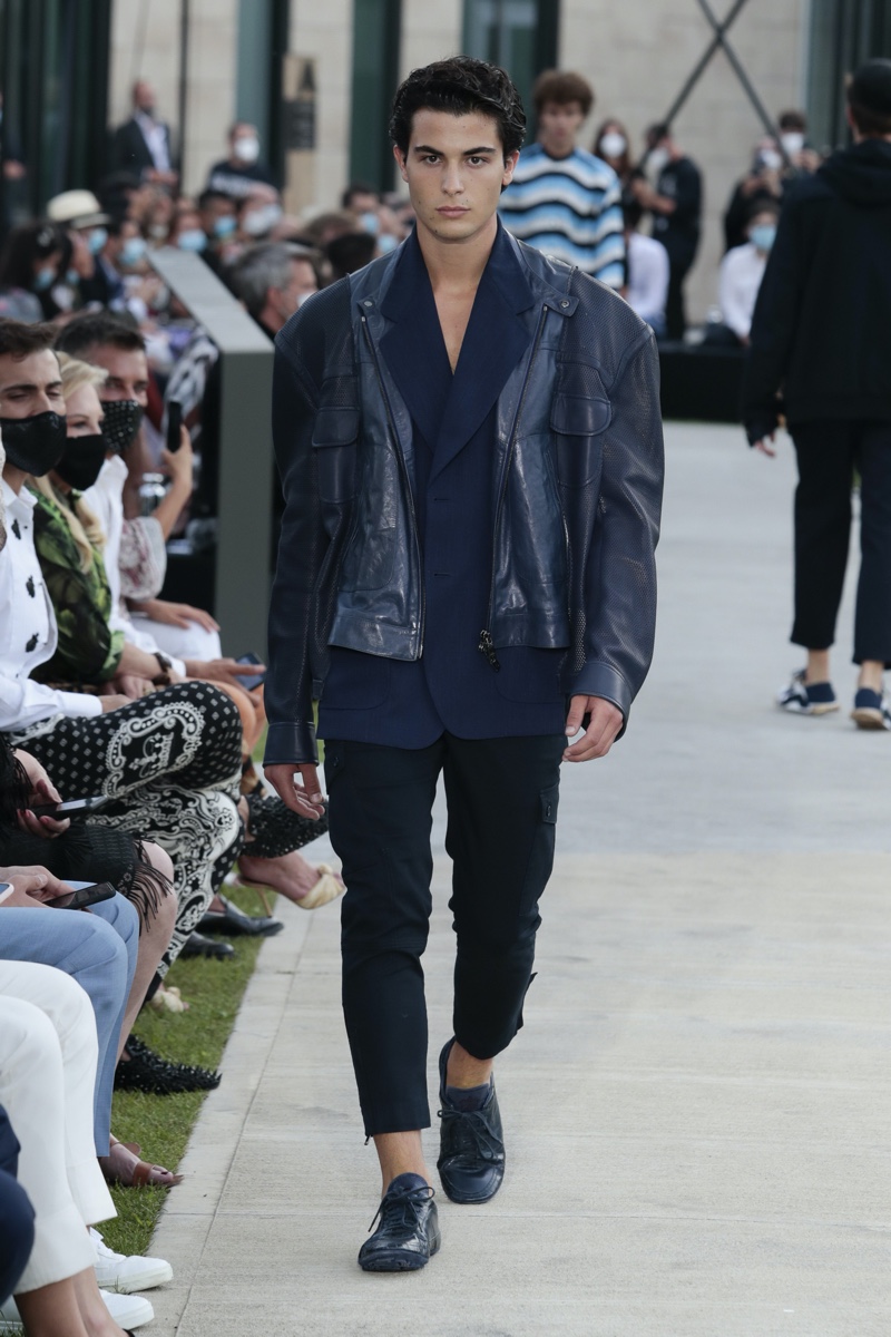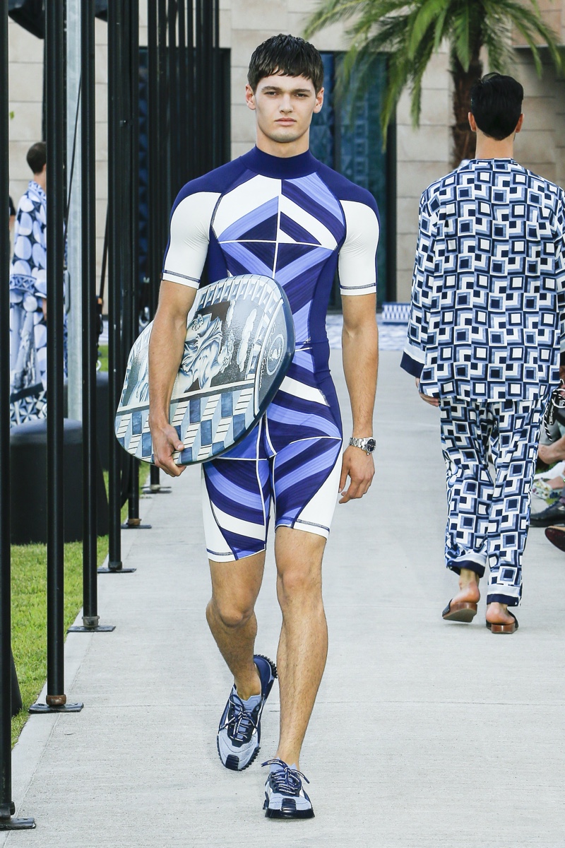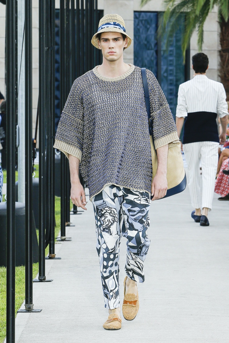 There’s no better time than now for a healthy dose of escapism and Dolce & Gabbana serves just that with its spring-summer 2021 collection. The Italian fashion house imagines a summer holiday in Sorrento for its latest outing. Relaxed shapes define the range as Domenico Dolce and Stefano Gabbana deliver a varied lineup of blue fashions inspired by the sea. Offset by white, the collection’s pieces range from graphic, boxy shirts and billowing trousers to white tunics. In addition to deconstructed denim and tailoring, Dolce & Gabbana offers a streamlined approach to accessories for the season. Classic shades come together with berets, bucket hats, leather sandals, and loafers.