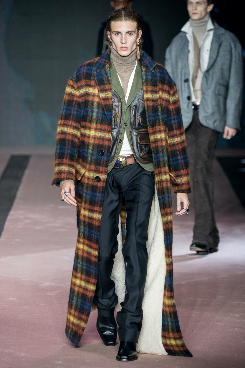 Nearly a quarter of a century has passed since Dsquared2 claimed its star in the fashion world’s night sky, and they are still shining with its fall-winter 2020 men’s collection. The season’s theme offers a midwestern chic take on Dsquared2 classics. A neutral color palette grounds a selection of denim and colorful plaid prints. Meanwhile, the silhouette is anything but old school. There is a touch of rock-inspired style and showmanship, almost as if Maroon 5 frontman Adam Levine came from Montana instead of California. Of particular interest is the cut of the trousers, which, though not genuinely skinny, is a lot more fitted than one would expect with a western motif. While several elements are relatively recognizable and seem like something most men already have in their closets somewhere, the devil is in the details. The collection’s charm rests in its expert cuts and finishes. Every surface is thoughtfully executed and decorated for the modern style aficionado without being distracting, and Dsquared2 has successfully married the smart to the casual.