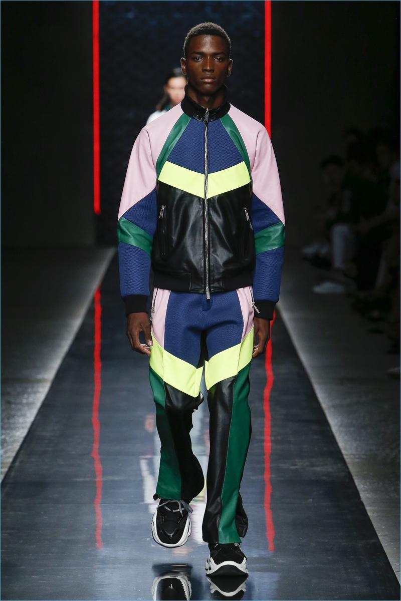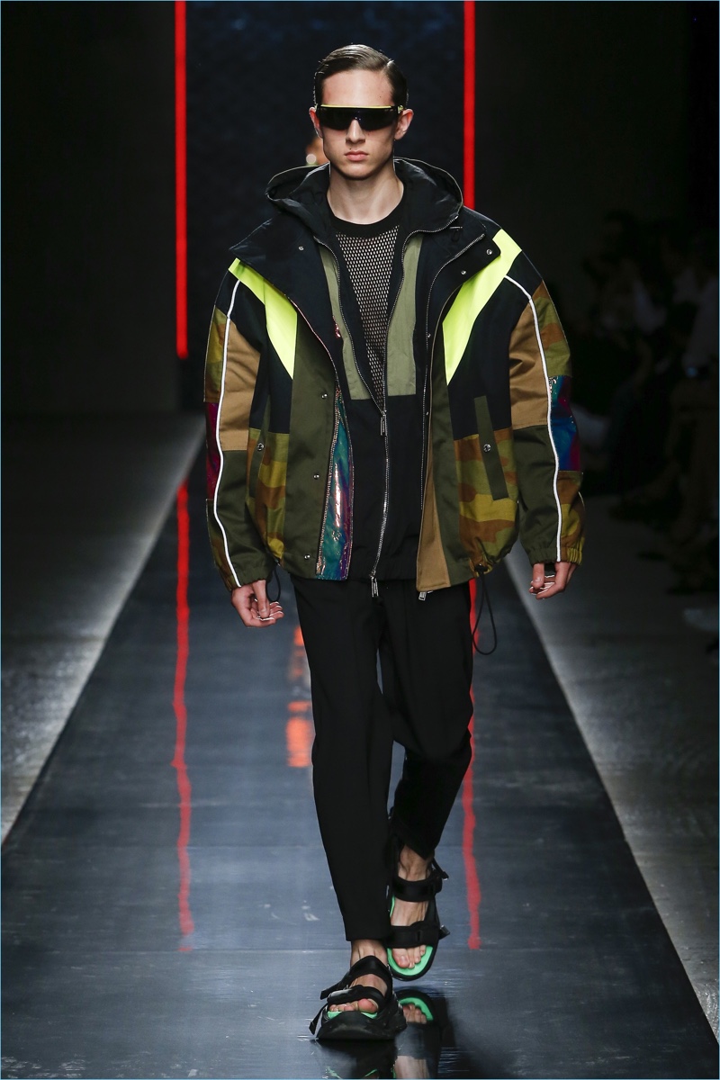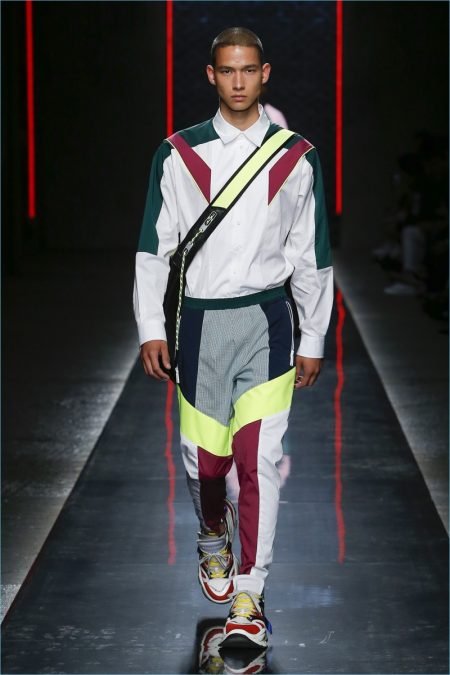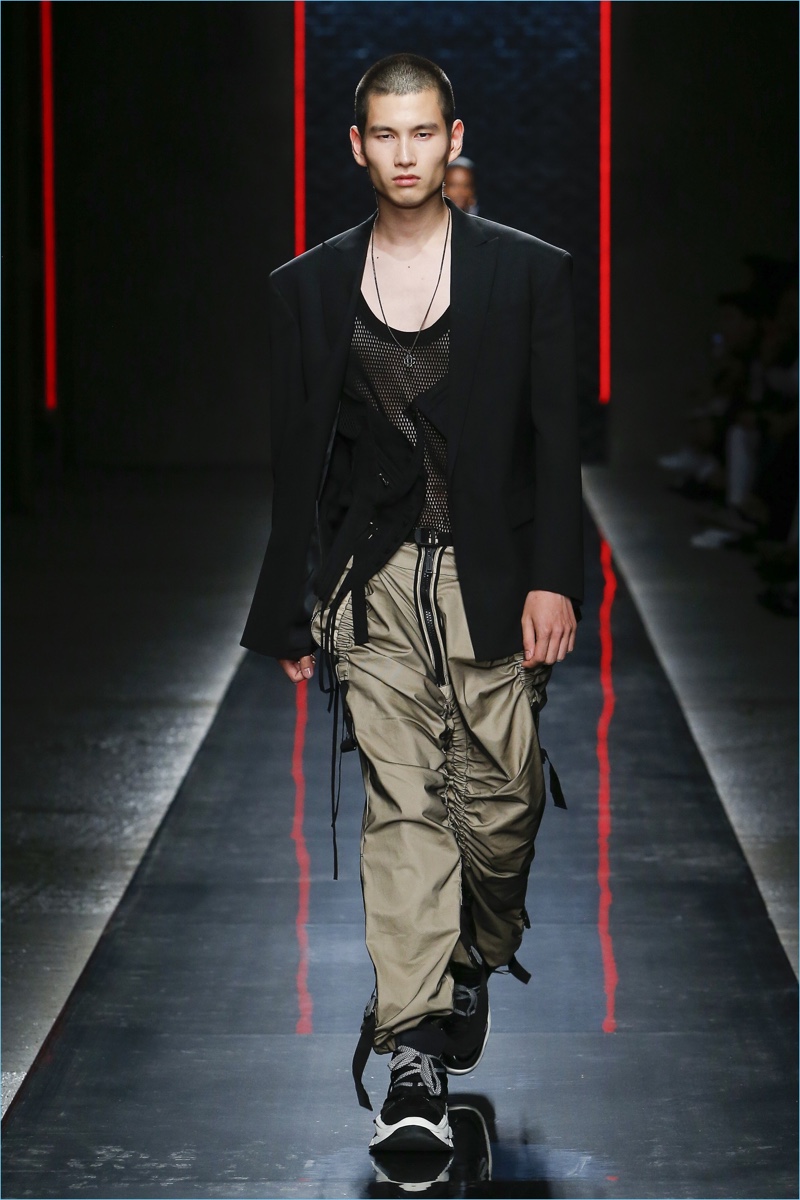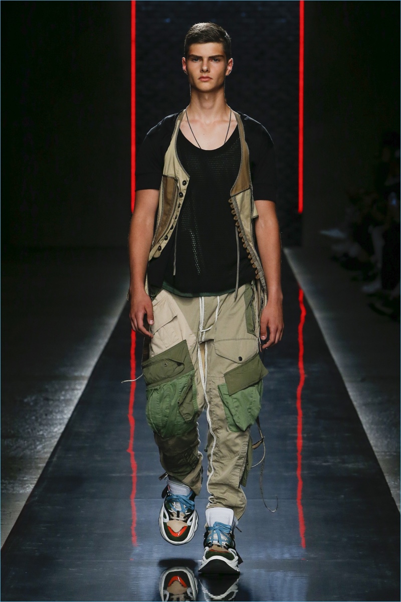 Dsquared2 embraces military style for its spring-summer 2019 collection. Dan and Dean Caten tone down their signature camp and go retro with a sporty vibe. Green and khaki hues come together with black for the season. Leather and cargo pants define the outing with a certain bagginess. Meanwhile, slouchy tees, vests, and jackets are layered for a laid-back look. Hoodies and parkas also join the outing, juxtaposed with sharp blazers. In addition to oversized sneakers, Dsquared2 makes a case for the tracksuit. Various color-blocking channels nineties style for a nostalgia plug.