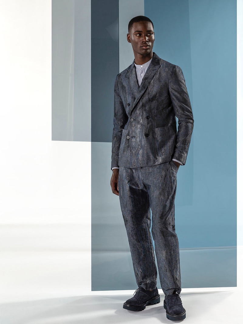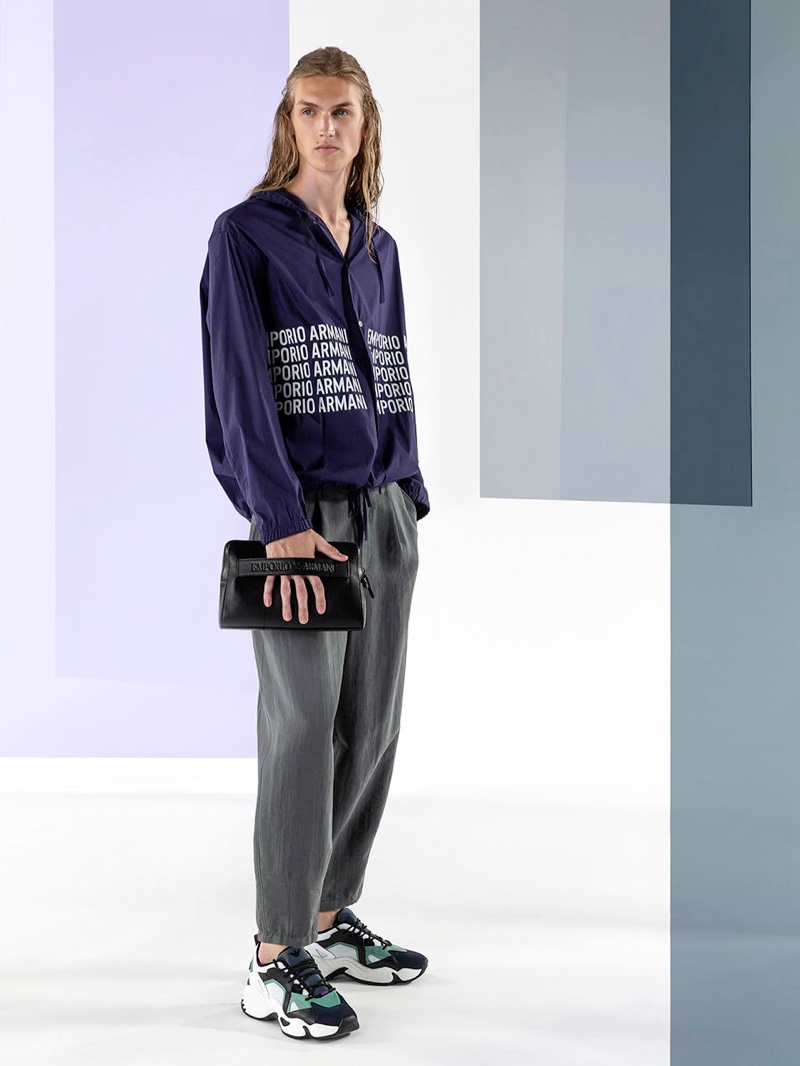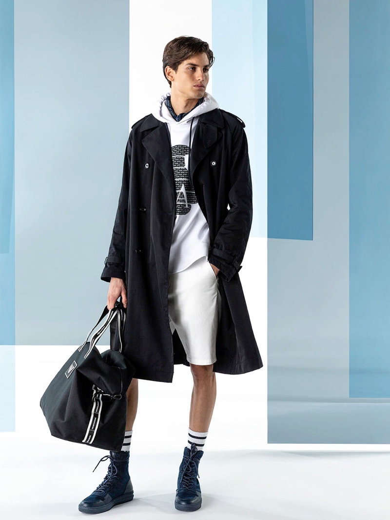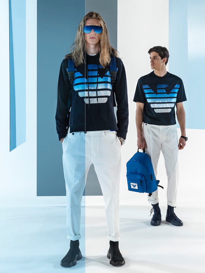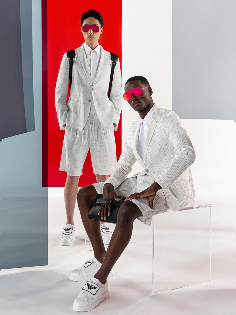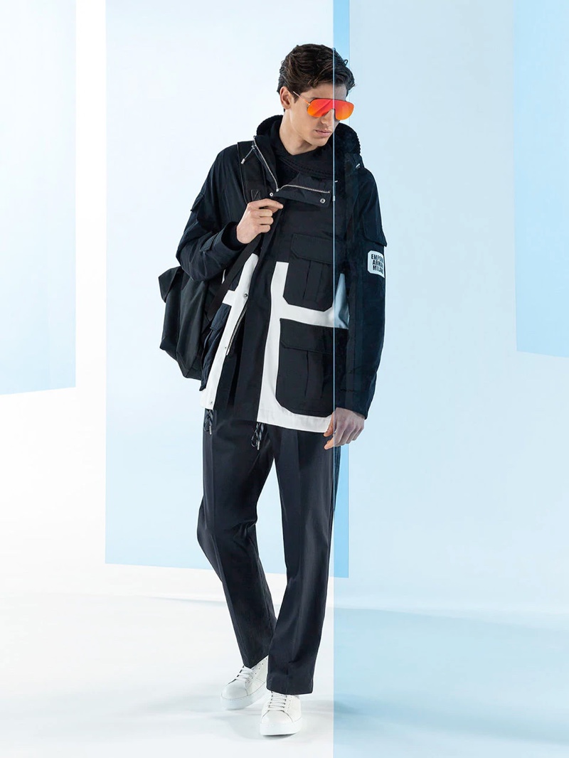 Emporio Armani’s spring-summer 2020 collection perfectly captures the brand’s identity with a strong mix of garments that marry Giorgio Armani’s elegant approach to menswear with a casual sportiness. The latest range of clothing brings together practical separates with a juxtaposition of neutral hues, clean lines, and graphic prints. The season’s lookbook mirrors the collection as geometric backdrops serve as the set for models Ryu Wankyu, Krisz Keri, Gerard Sabe, and Edge Lheureux. Front and center, the models inspire in must-haves such as the relaxed double-breasted suit, graffiti print bomber jacket, logo sweatshirt, baggy shorts, and camouflage pants.