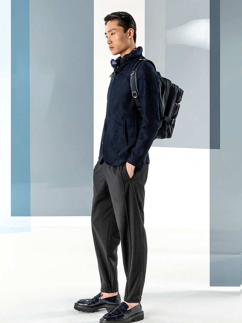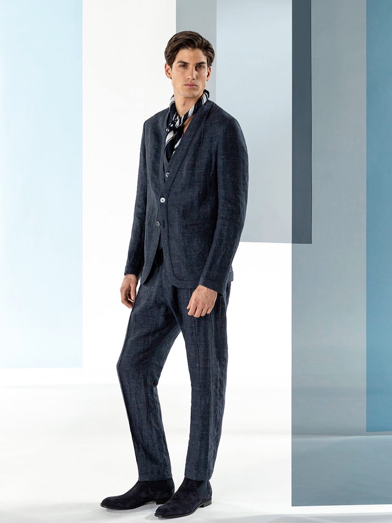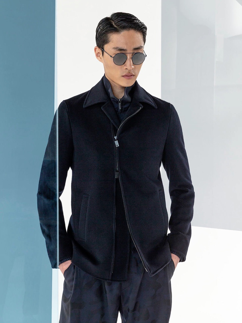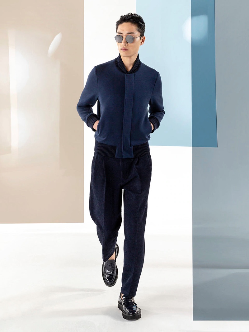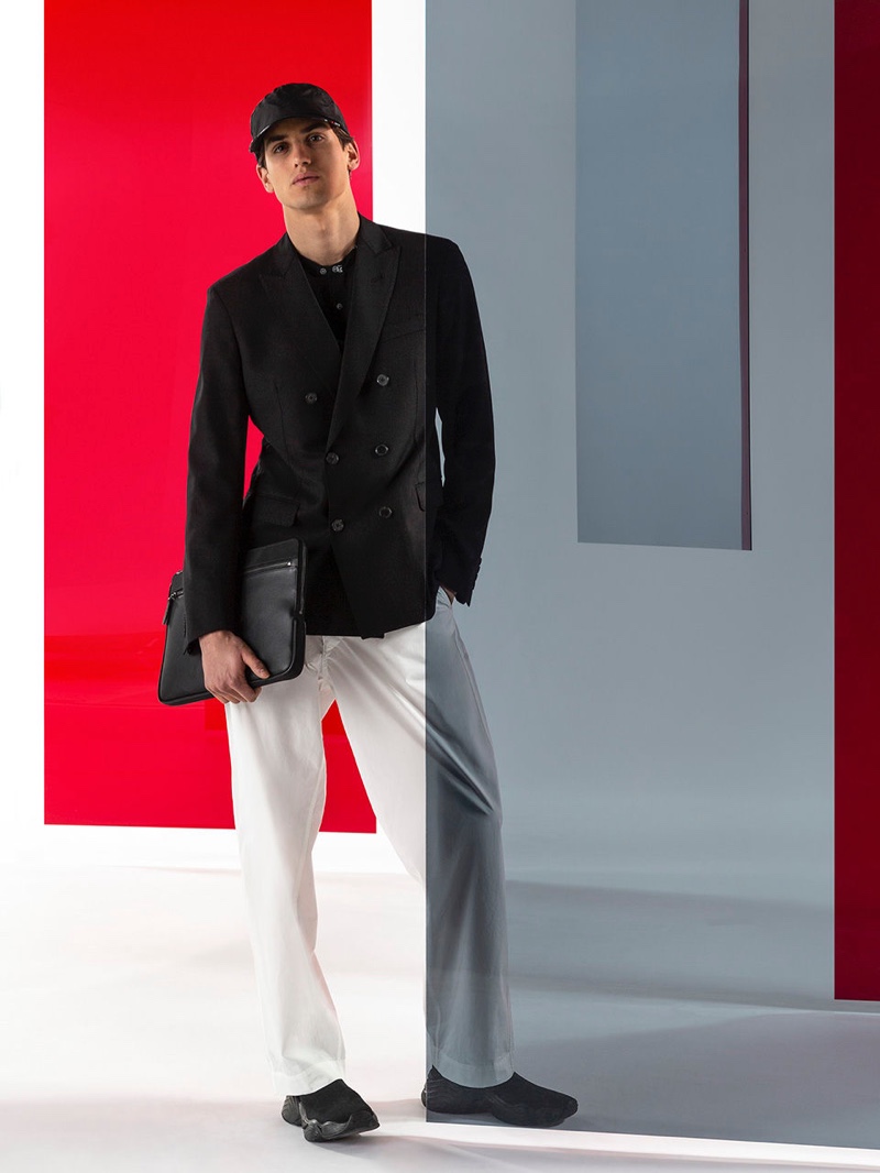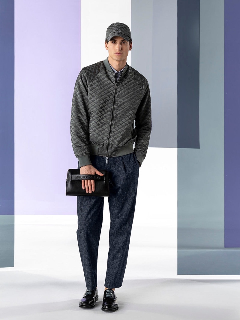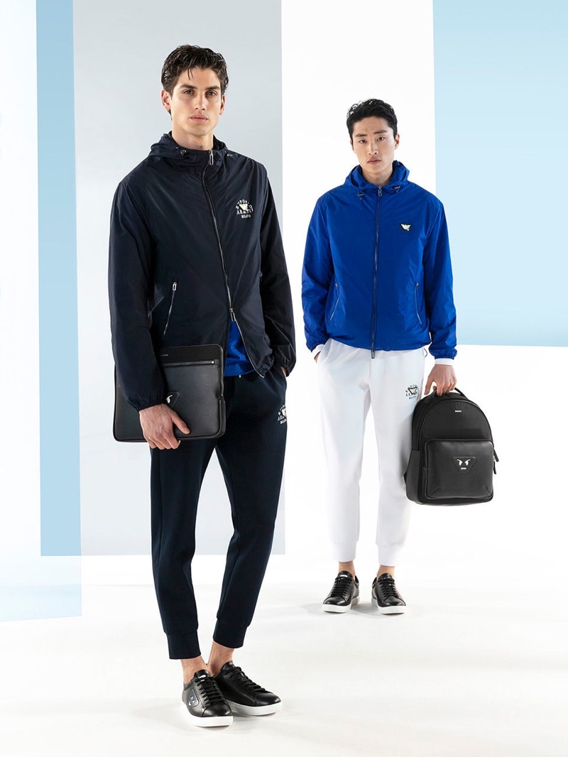Emporio Armani’s spring-summer 2020 collection perfectly captures the brand’s identity with a strong mix of garments that marry Giorgio Armani’s elegant approach to menswear with a casual sportiness. The latest range of clothing brings together practical separates with a juxtaposition of neutral hues, clean lines, and graphic prints. The season’s lookbook mirrors the collection as geometric backdrops serve as the set for models Ryu Wankyu, Krisz Keri, Gerard Sabe, and Edge Lheureux. Front and center, the models inspire in must-haves such as the relaxed double-breasted suit, graffiti print bomber jacket, logo sweatshirt, baggy shorts, and camouflage pants.