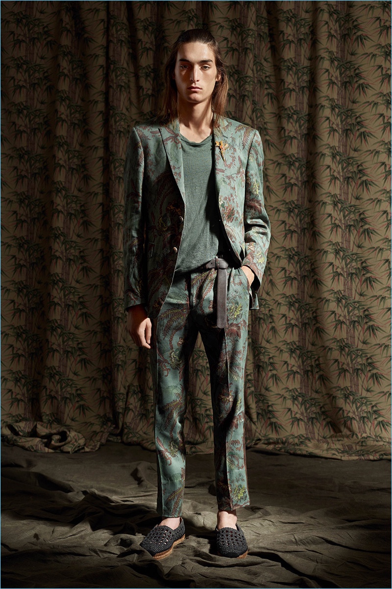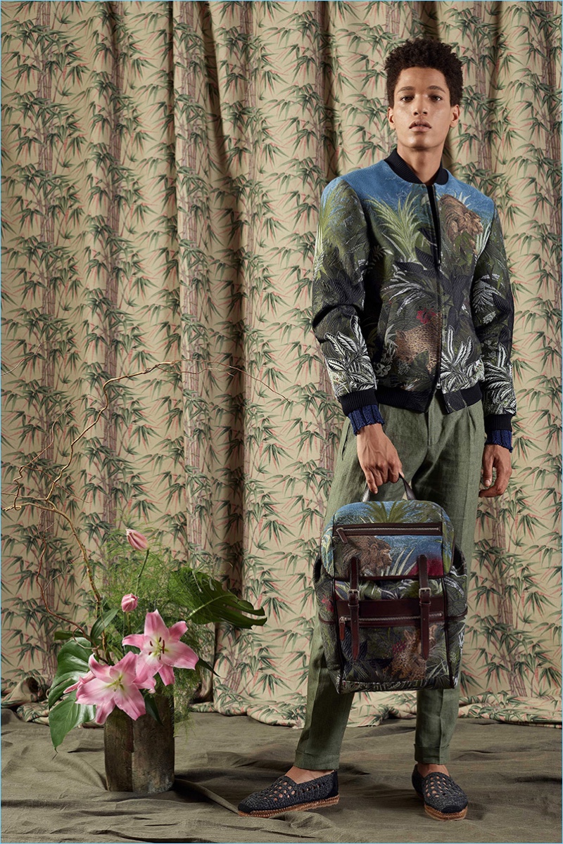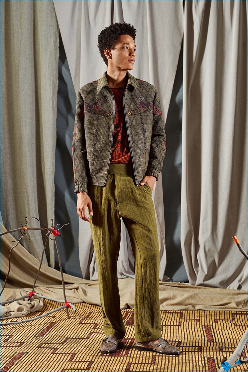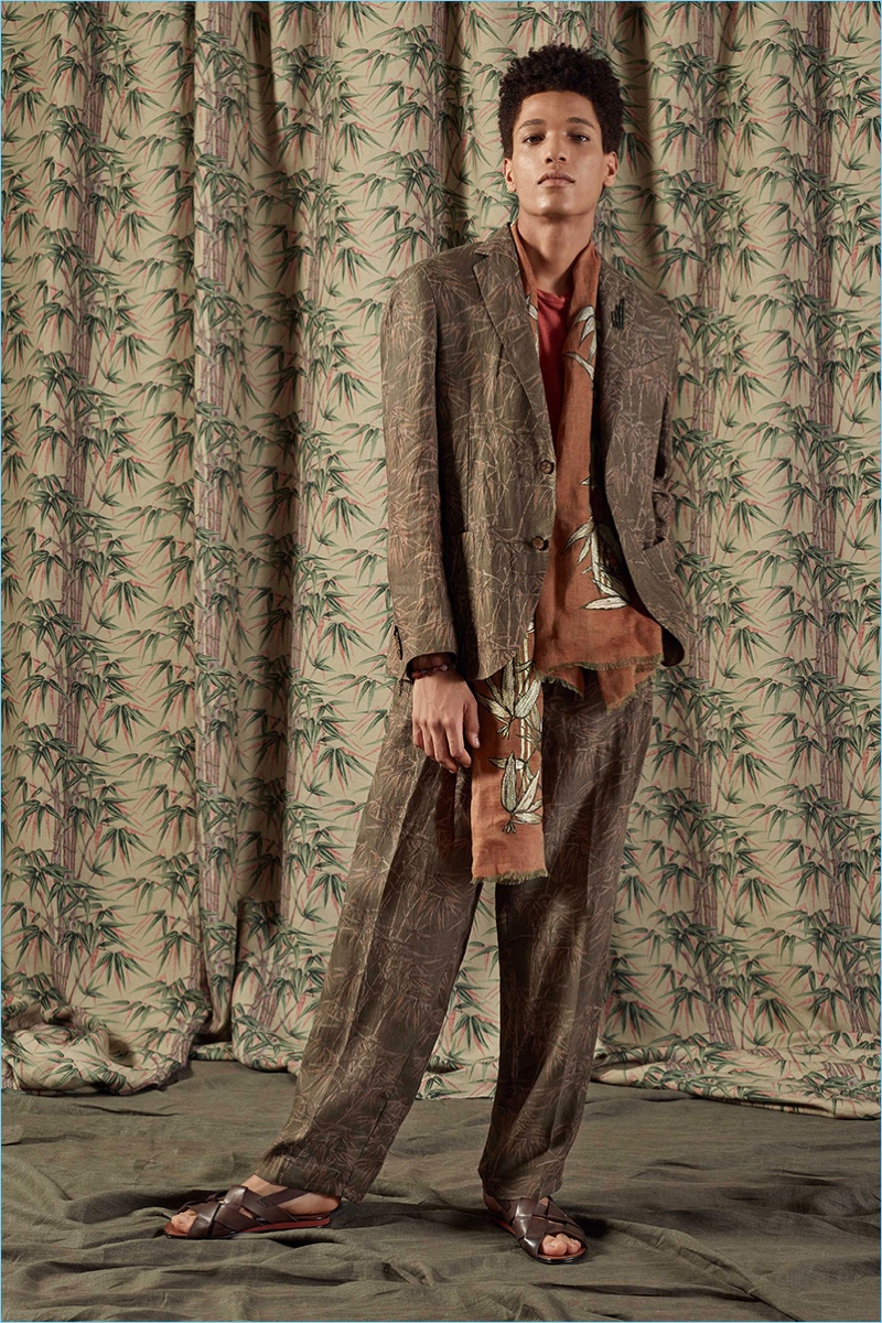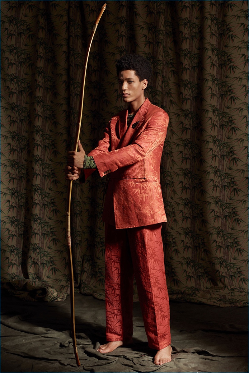Etro references Indonesian culture as the label approaches its spring-summer 2019 collection. The elegant season is unveiled with a lookbook featuring models Tony Thornburg, Niko Traubman, Peter Finn, and Simon Martyn. Posing against a backdrop of ornate fashions, the models don Kean Etro’s latest designs. Easily holding up to a history of beautiful prints and textiles, the collection is dressed in earthy hues. Indonesian patterns come together with patchwork and even graphics of Mexican dream symbols. Not caving into the streetwear trend, Etro maintains a gentleman’s wardrobe with fluid proportions. Double-breasted suits are just as refined as a decorated bomber jacket. The Italian fashion house also makes a case for bamboo, complementing linens, cotton, and wools.
