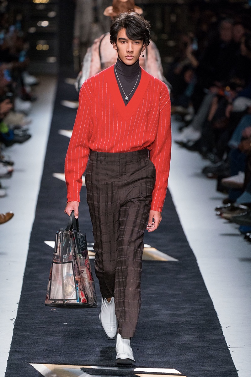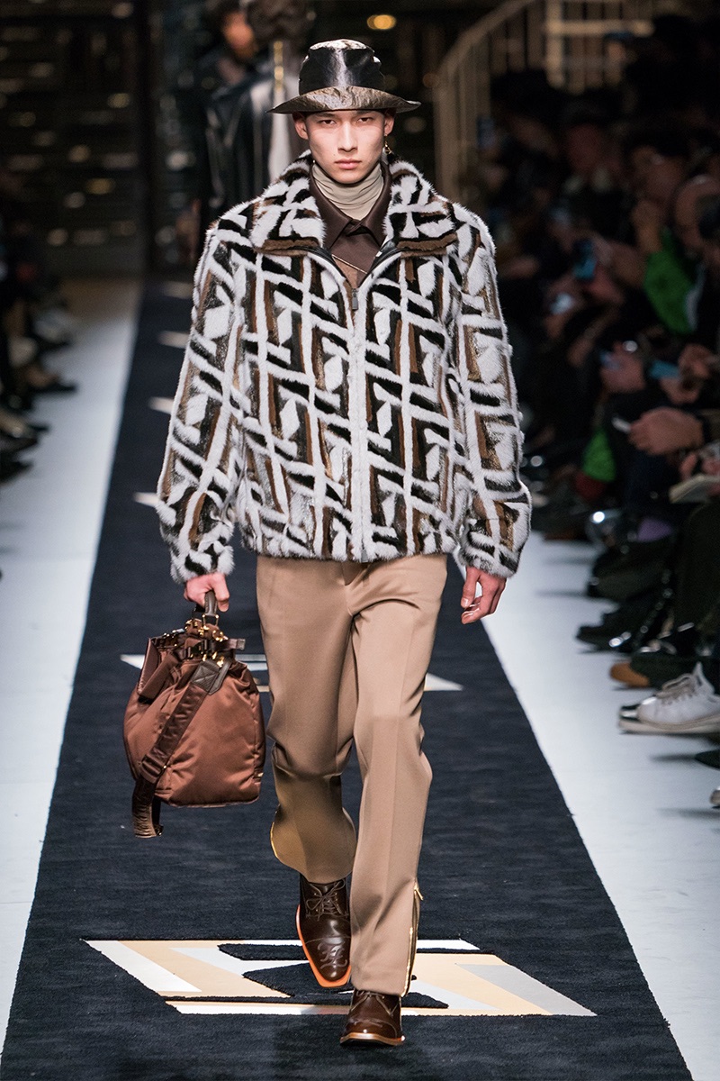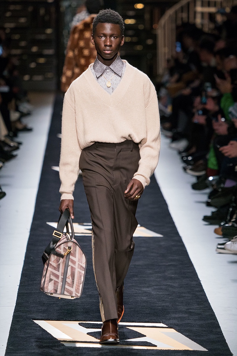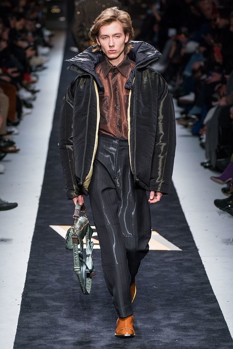 Silvia Venturini Fendi delivers a smooth luxury with Fendi’s fall-winter 2019 collection. The fashion house’s notable brown hues open up the season with an effort to make men’s suiting contemporary. Sheer and iridescent fabrics add a modern appeal to tailoring, while smart layers offer versatility. Effortless items arrive in the form of clothing such as the blouson jacket, slouchy v-neck sweater, and oversized single-breasted coat. The iconic Fendi logo is used minimally and offset by a monogram version. Meanwhile, Fendi has fun with color blocking and the mixing of patterns for easy ways to freshen up menswear icons. Finally, a sporty aesthetic merges with parkas and other winter essentials. In true Fendi fashion, they stand out with details like a foil gold finish.