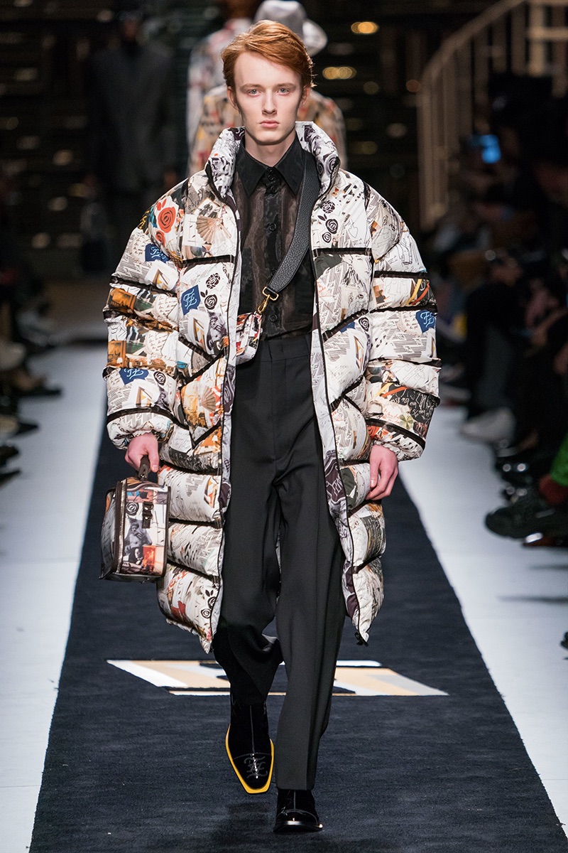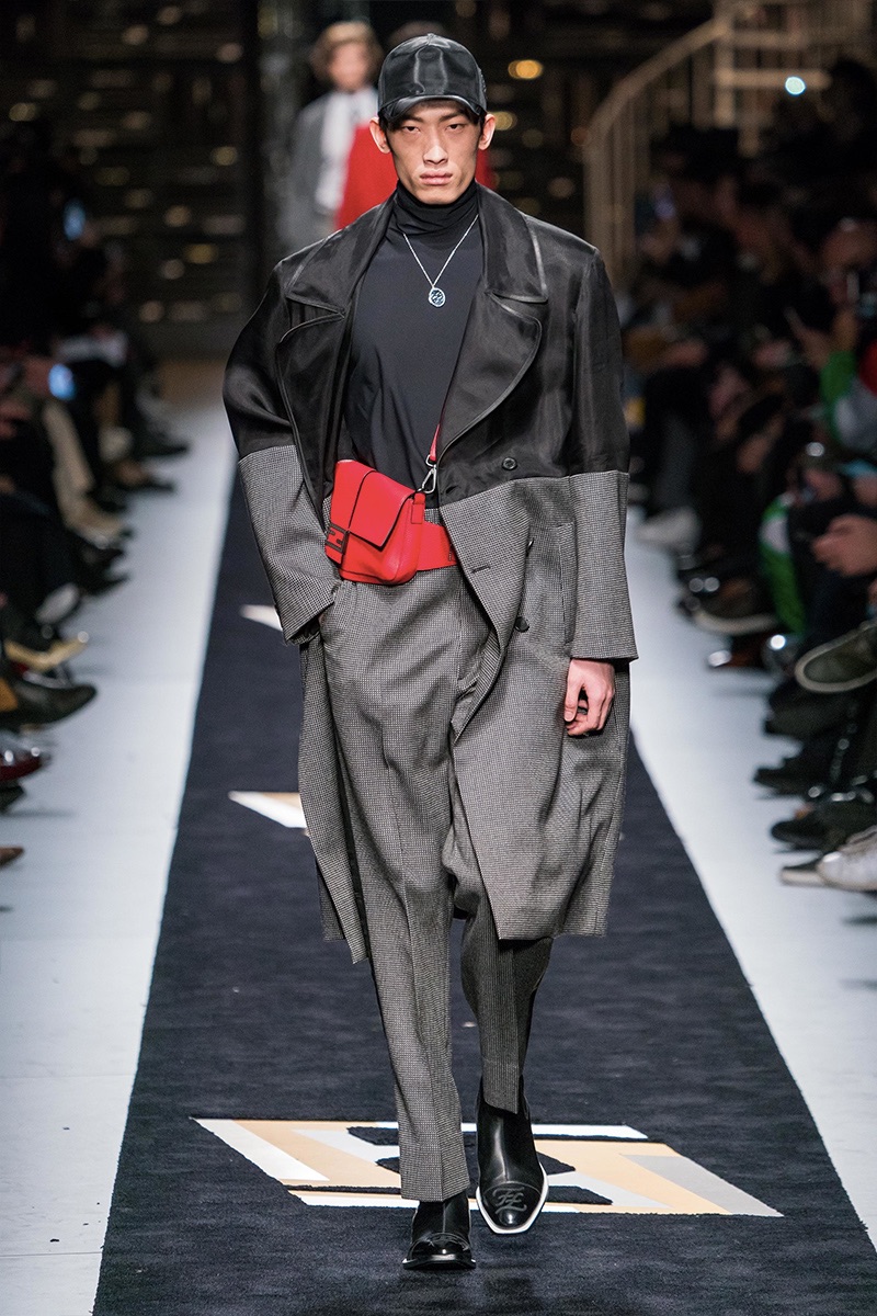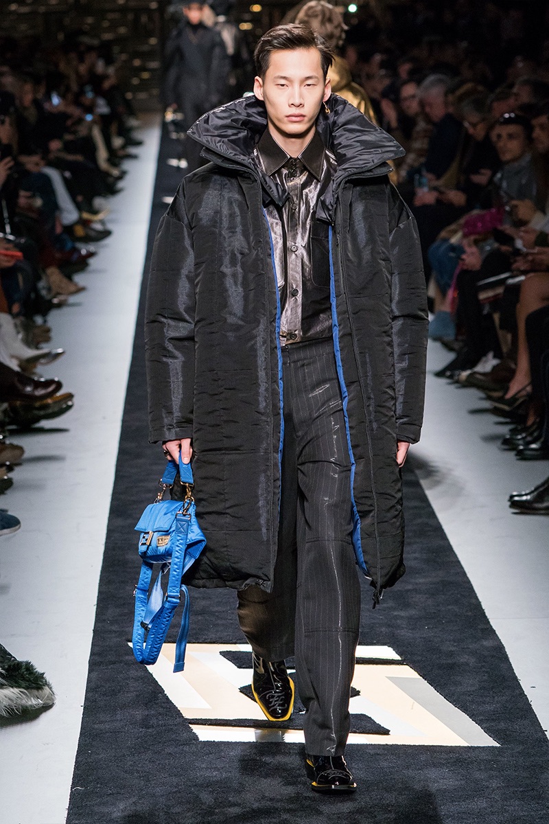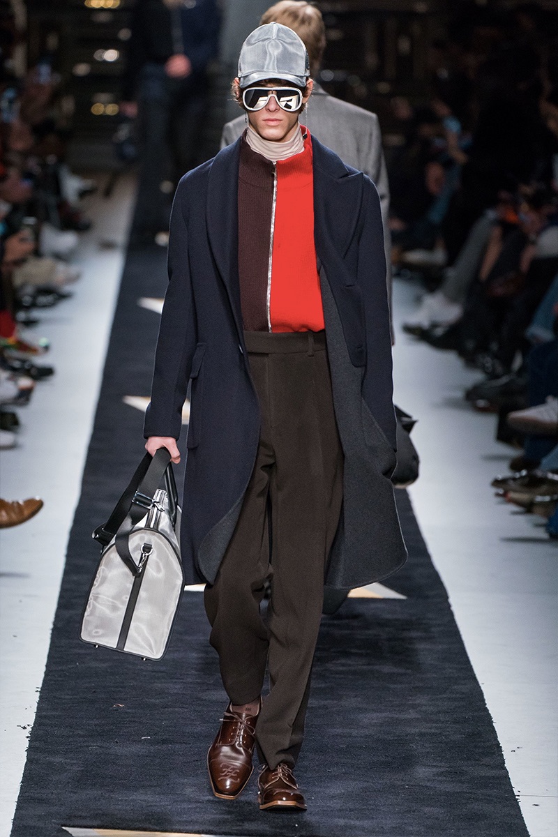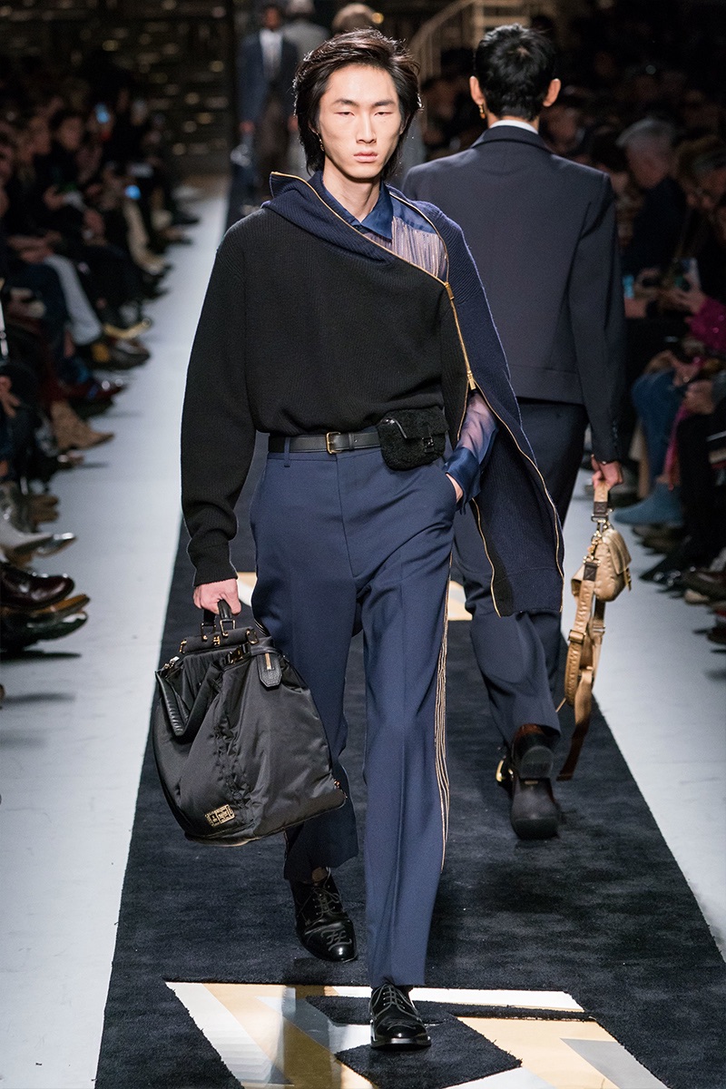 Silvia Venturini Fendi delivers a smooth luxury with Fendi’s fall-winter 2019 collection. The fashion house’s notable brown hues open up the season with an effort to make men’s suiting contemporary. Sheer and iridescent fabrics add a modern appeal to tailoring, while smart layers offer versatility. Effortless items arrive in the form of clothing such as the blouson jacket, slouchy v-neck sweater, and oversized single-breasted coat. The iconic Fendi logo is used minimally and offset by a monogram version. Meanwhile, Fendi has fun with color blocking and the mixing of patterns for easy ways to freshen up menswear icons. Finally, a sporty aesthetic merges with parkas and other winter essentials. In true Fendi fashion, they stand out with details like a foil gold finish.