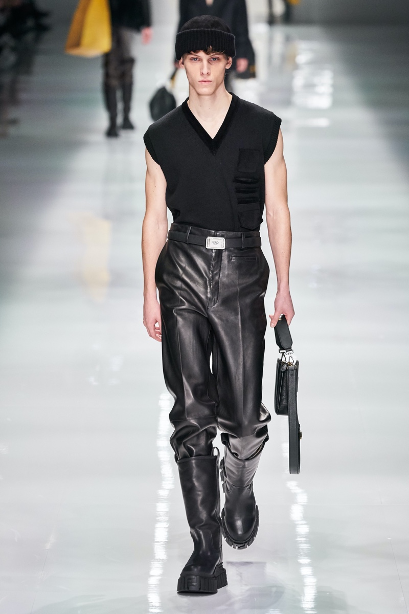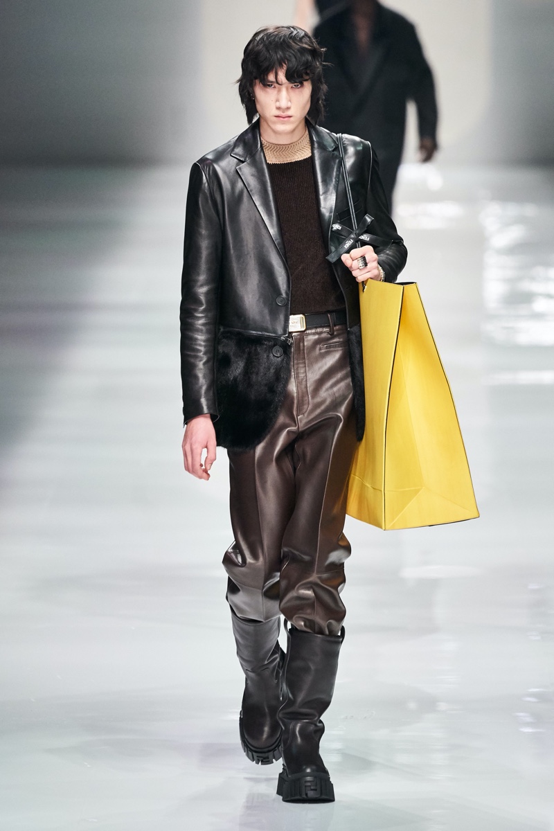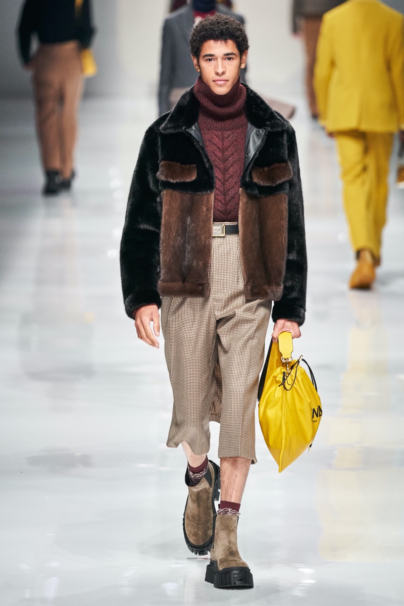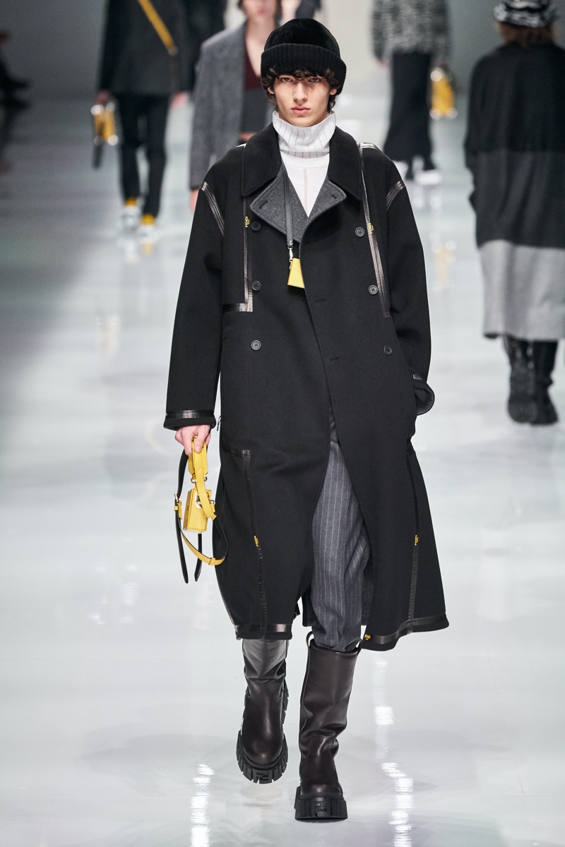 Fendi embraces a season of contrasts with its fall-winter 2020 men’s collection. The fashion house balances modern cuts with the timeless sophistication of a dark color scheme. Silvia Venturini Fendi reinterprets classic menswear with daring proportions, juxtaposing the clean lines of long coats with cropped knitwear. Meanwhile, leather pants offer a rebellious edge. Pops of yellow and graphic prints lend the collection a splash of personality. Finally, Fendi updates its must-have accessories with standouts like a fresh take on the iconic Fendi Peekaboo.