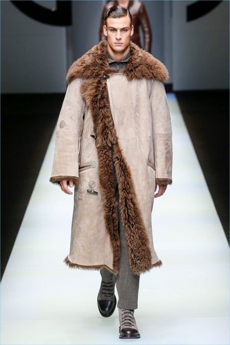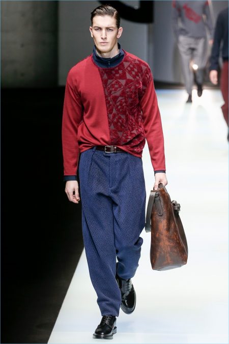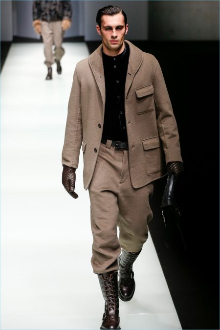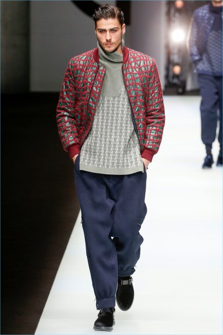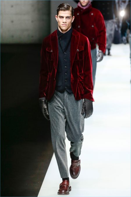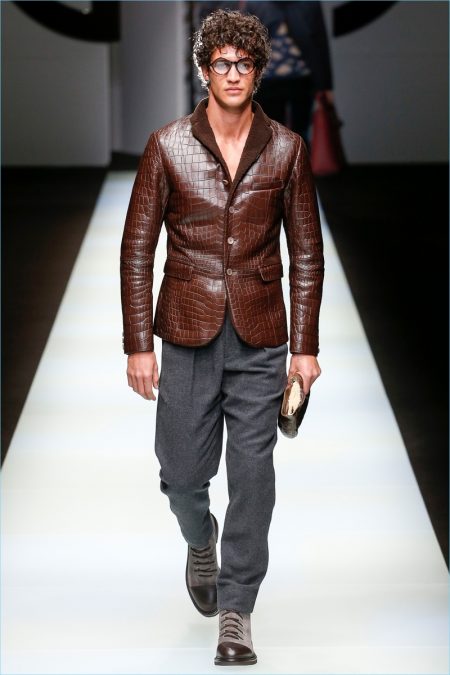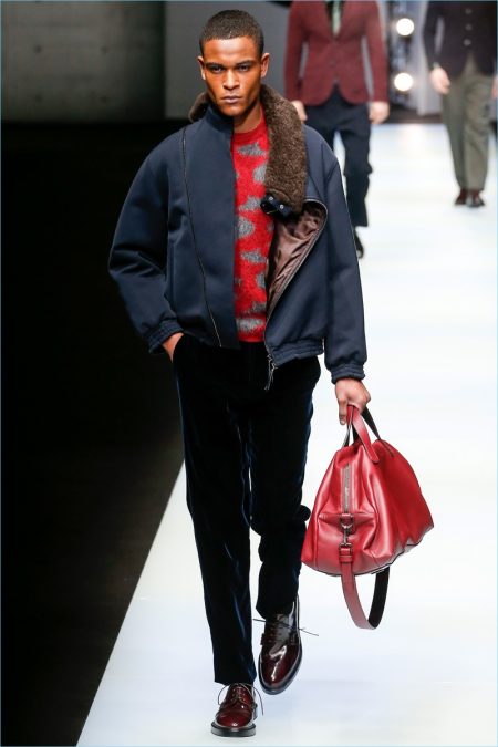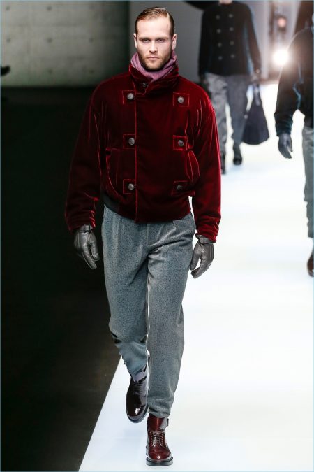 The season unfolds with long coats, double-breasted jackets, and high-necked bomber jackets. Meanwhile, patterned knitwear and modest shirting let the collection’s outerwear shine. Leather, wool, and velvet come together in a variety of colors. The collection includes touches of emerald, ruby, grey, and khaki. The color palette best suits Armani’s transition from gentleman wear to military-inspired fashions.
