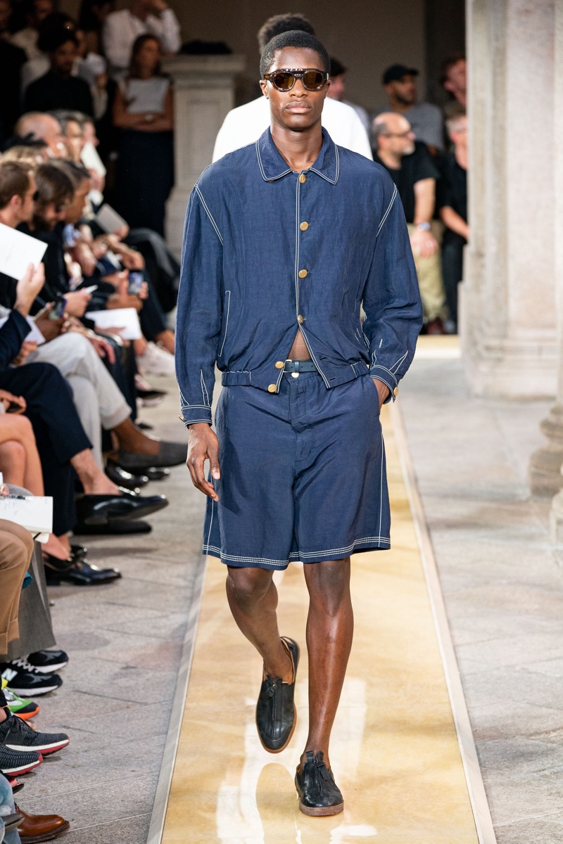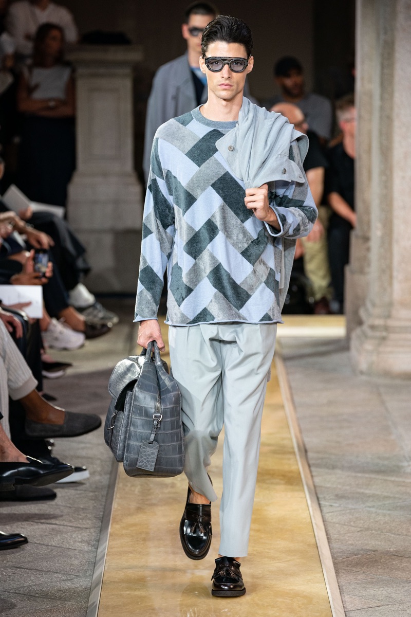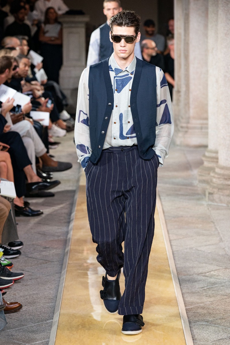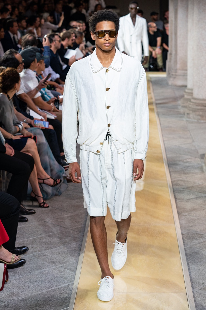 Giorgio Armani breezes into summer with a sleek new collection debuted during Milan Fashion Week. For spring-summer 2020, Armani’s metropolitan man receives a style update with coastal influences. Blue, brown, and grey hues paint a chic picture for the season with a wardrobe of interchangeable pieces. Pre-wrinkled fabrics bring a certain casualness to Armani’s timeless tailoring. The collection opens with a minimal suit and waistcoat, before transitioning into lightweight knit cardigans, windowpane print jackets, pinstripe trousers, and more. Linen neutrals open the door to graphic prints and chambray pants. Oversized relaxed shirts, silk bombers, and patterned shorts contribute to Armani’s stellar range as well.