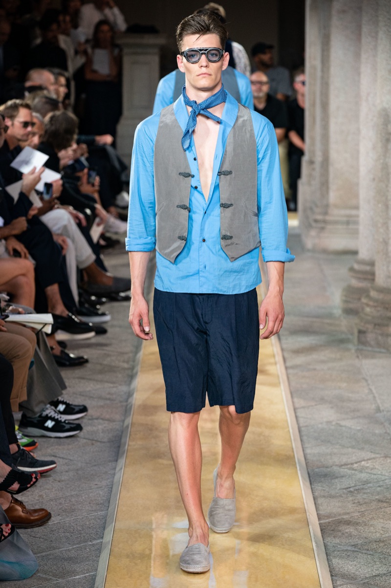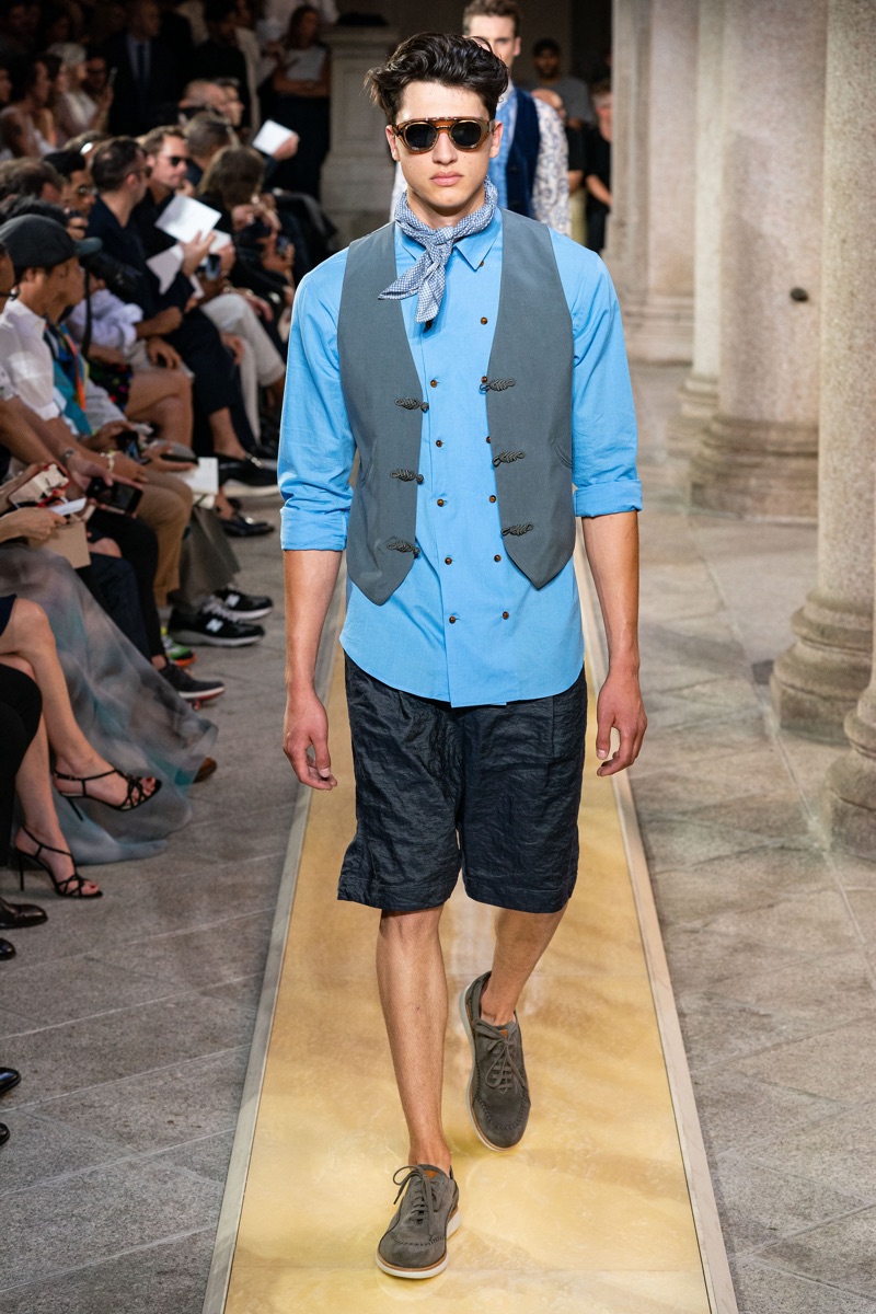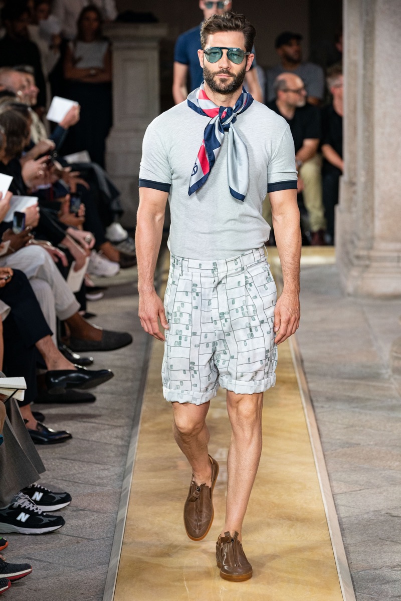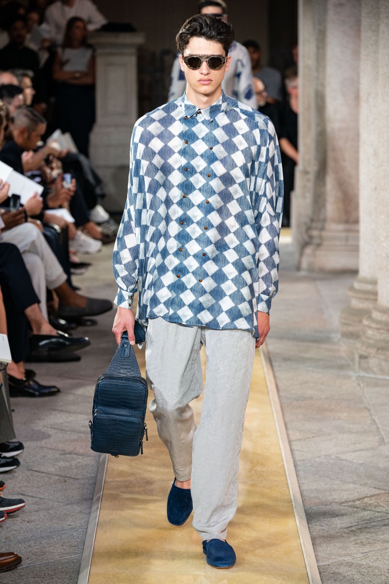 Giorgio Armani breezes into summer with a sleek new collection debuted during Milan Fashion Week. For spring-summer 2020, Armani’s metropolitan man receives a style update with coastal influences. Blue, brown, and grey hues paint a chic picture for the season with a wardrobe of interchangeable pieces. Pre-wrinkled fabrics bring a certain casualness to Armani’s timeless tailoring. The collection opens with a minimal suit and waistcoat, before transitioning into lightweight knit cardigans, windowpane print jackets, pinstripe trousers, and more. Linen neutrals open the door to graphic prints and chambray pants. Oversized relaxed shirts, silk bombers, and patterned shorts contribute to Armani’s stellar range as well.