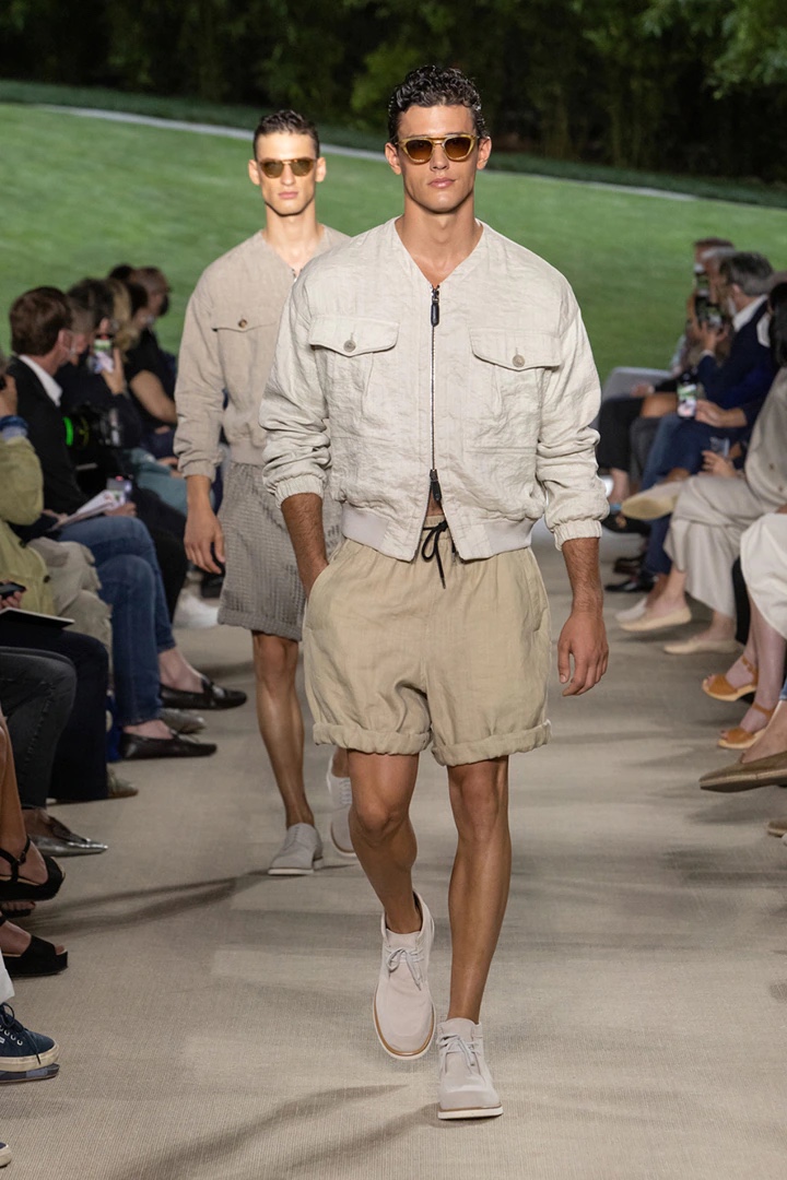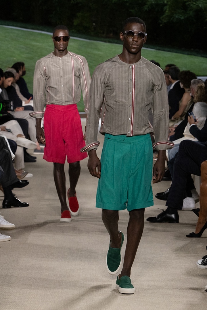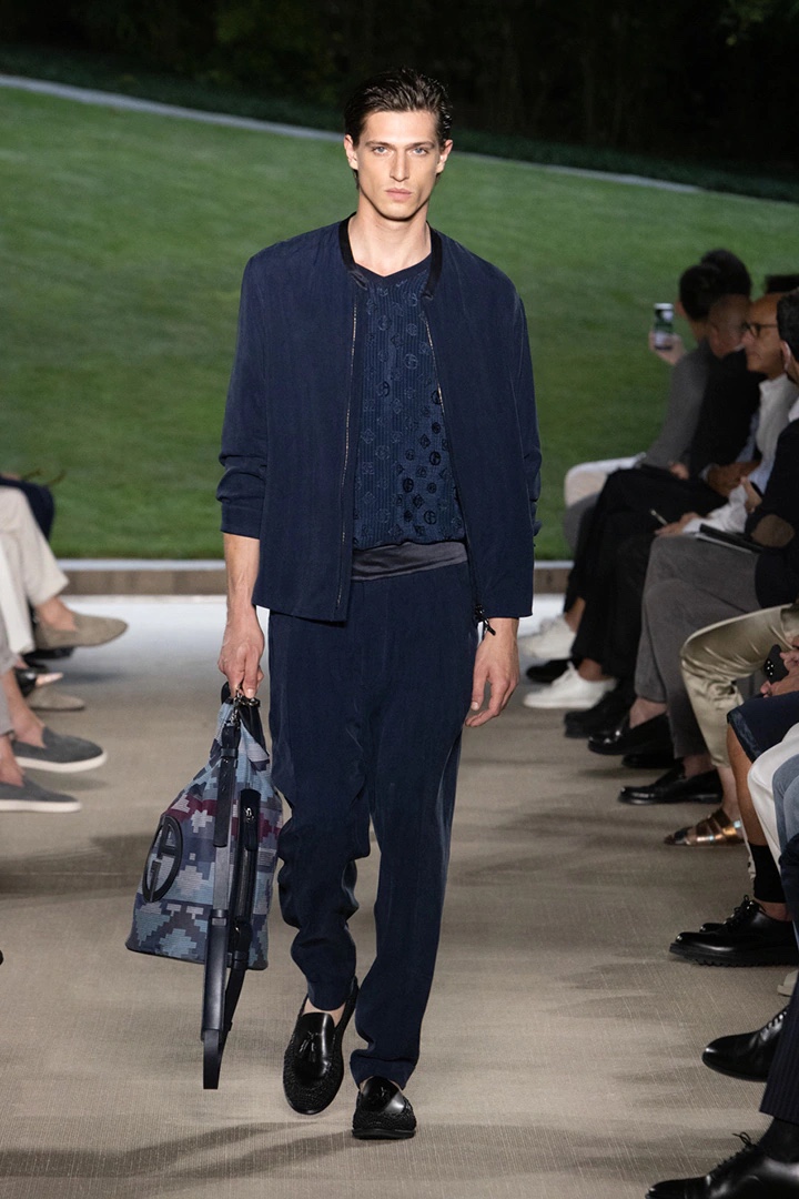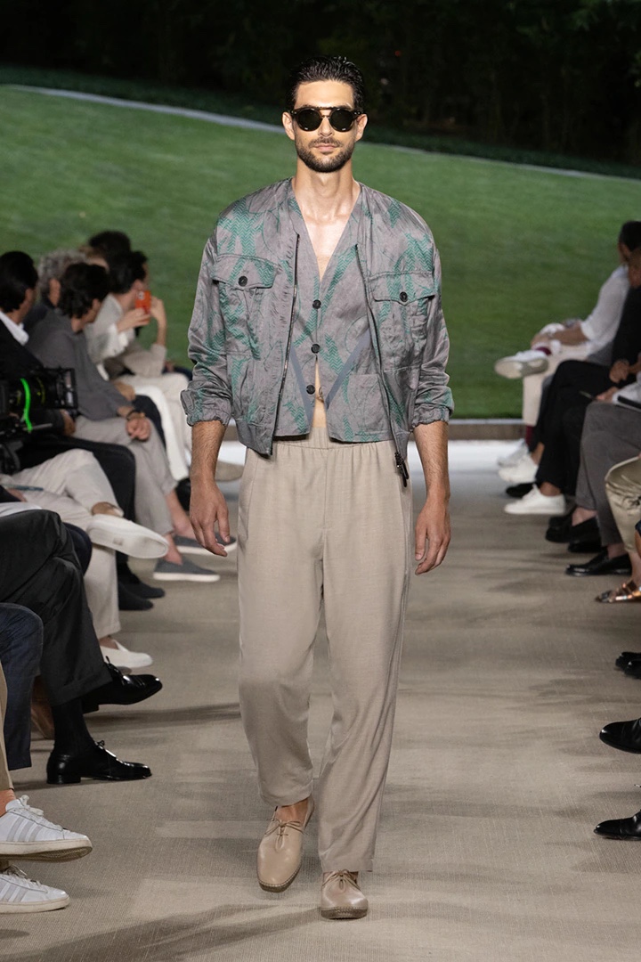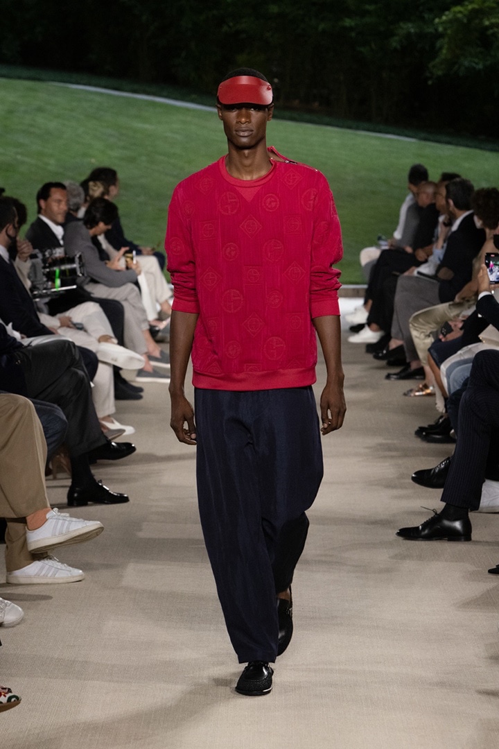 Armani’s carefully constructed lines come together in a sophisticated but dressed-down wardrobe. Fluid shapes emphasize classic sportswear from a contemporary perspective. Inspired by nature, splashes of green and red accent a neutral offering.
