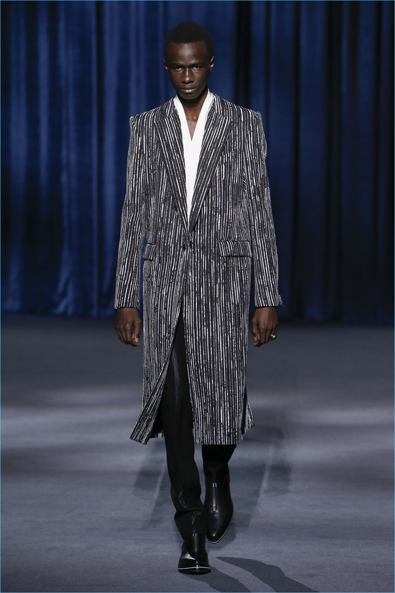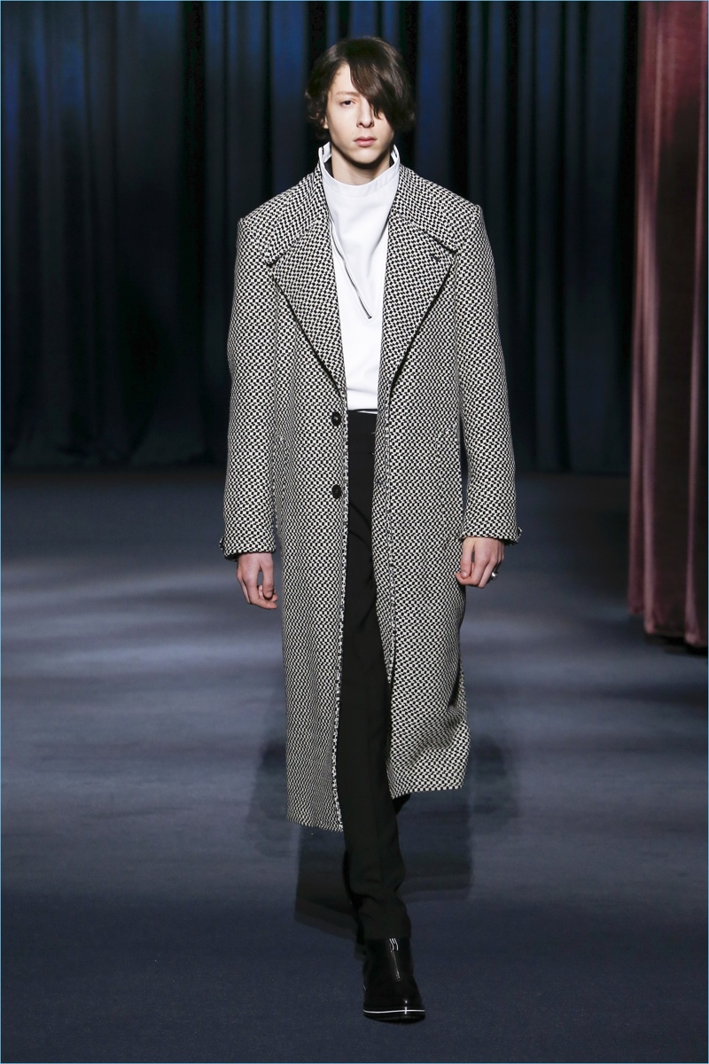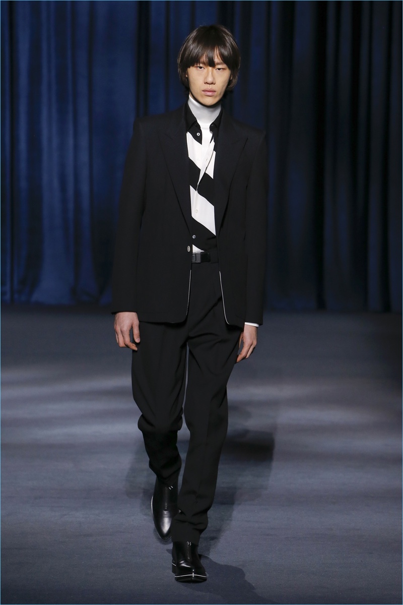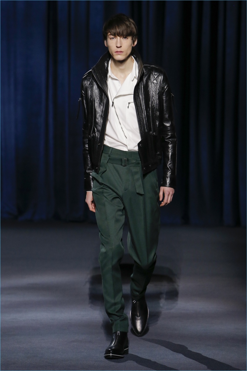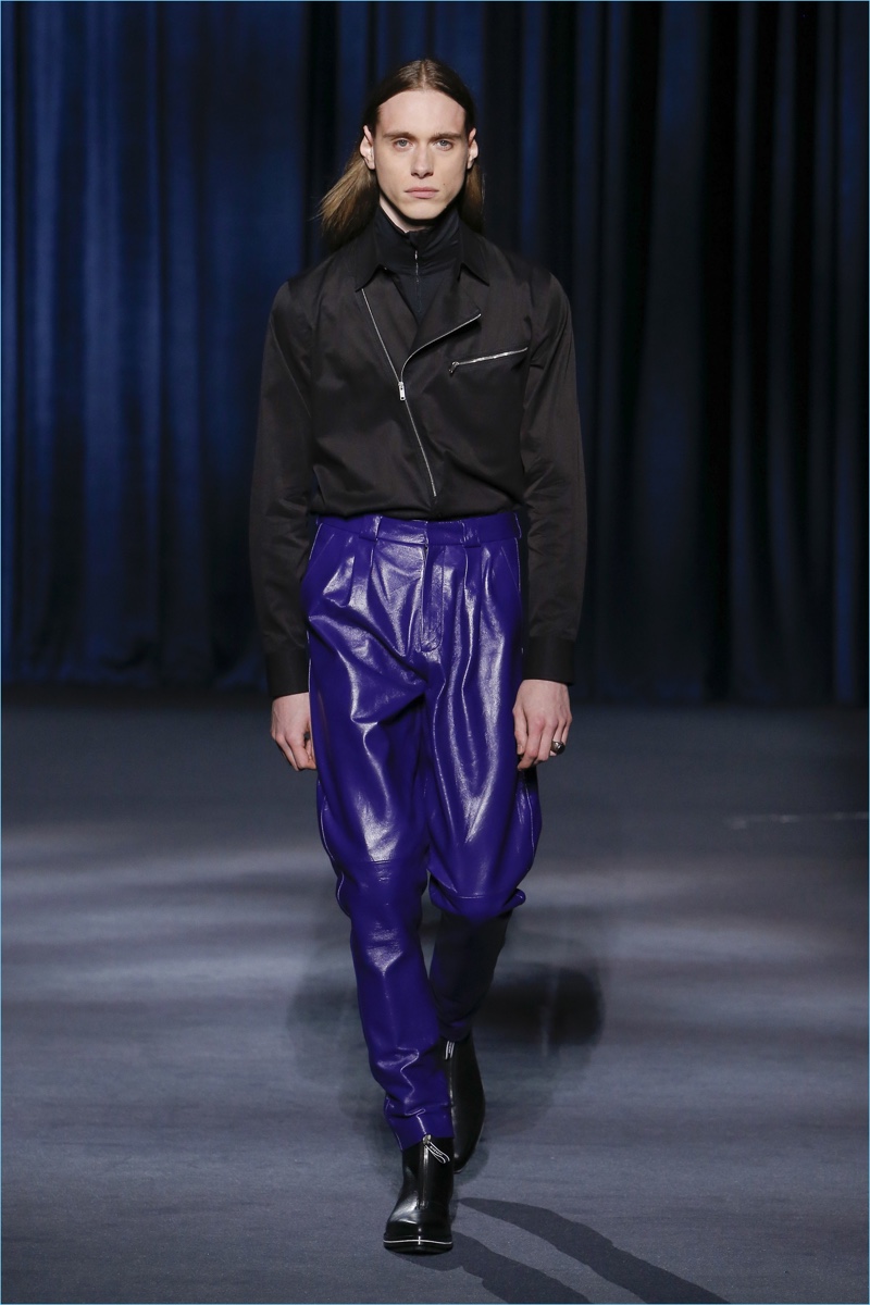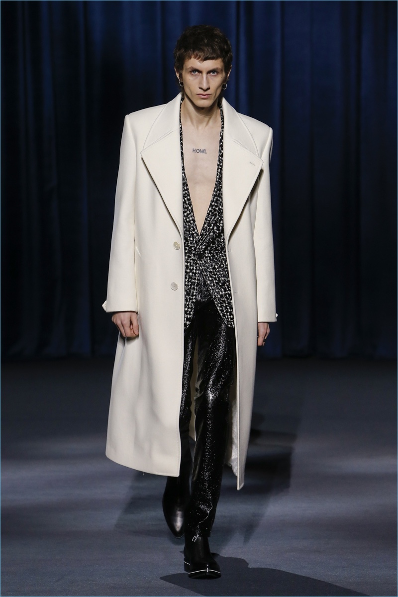 Clare Waight Keller looks to Berlin’s underground club scene of the 1980s to inform Givenchy’s fall-winter 2018 collection. The fashion house’s man travels a dark path lined with oversized silhouettes. Faux fur easily makes a statement with its grand proportions. Meanwhile, you can find leather pants juxtaposed among colorful trousers. The bold proposals offer a sharp contrast to crisp tailoring and splashes of animal prints. While Keller’s precise lines lend themselves to formal dressing, casual pieces still present themselves. Relaxed standouts range from a white puffer coat to a mixed print turtleneck sweater.