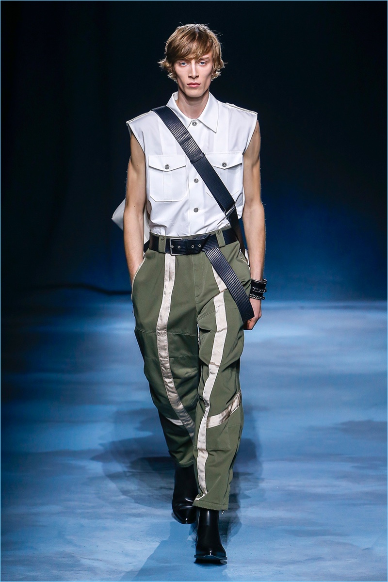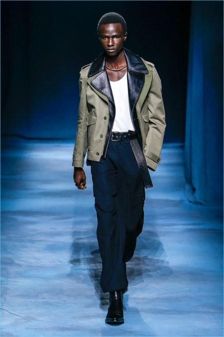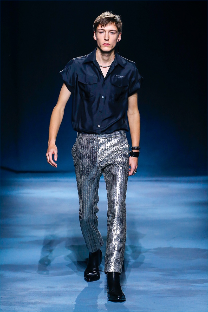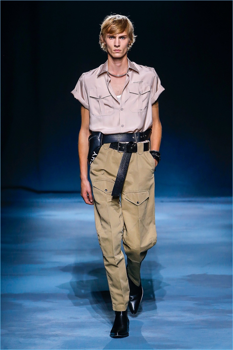 The Givenchy man puts on a stern face for spring-summer 2019. Clare Waight Keller makes a case for uniform style with a series of military-inspired looks. Neutral tones come together as Keller offers key items such as the two pocket shirt or a fresh spin on cargo pants. Chic style also reigns with belted trench coats and sharply tailored suits. One suit in particular shines in a gorgeous lilac. Meanwhile, the Givenchy man shows his edge with leather pants, sleeveless biker jackets, sequined trousers, and more.