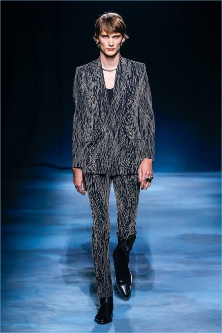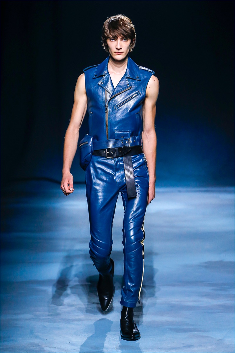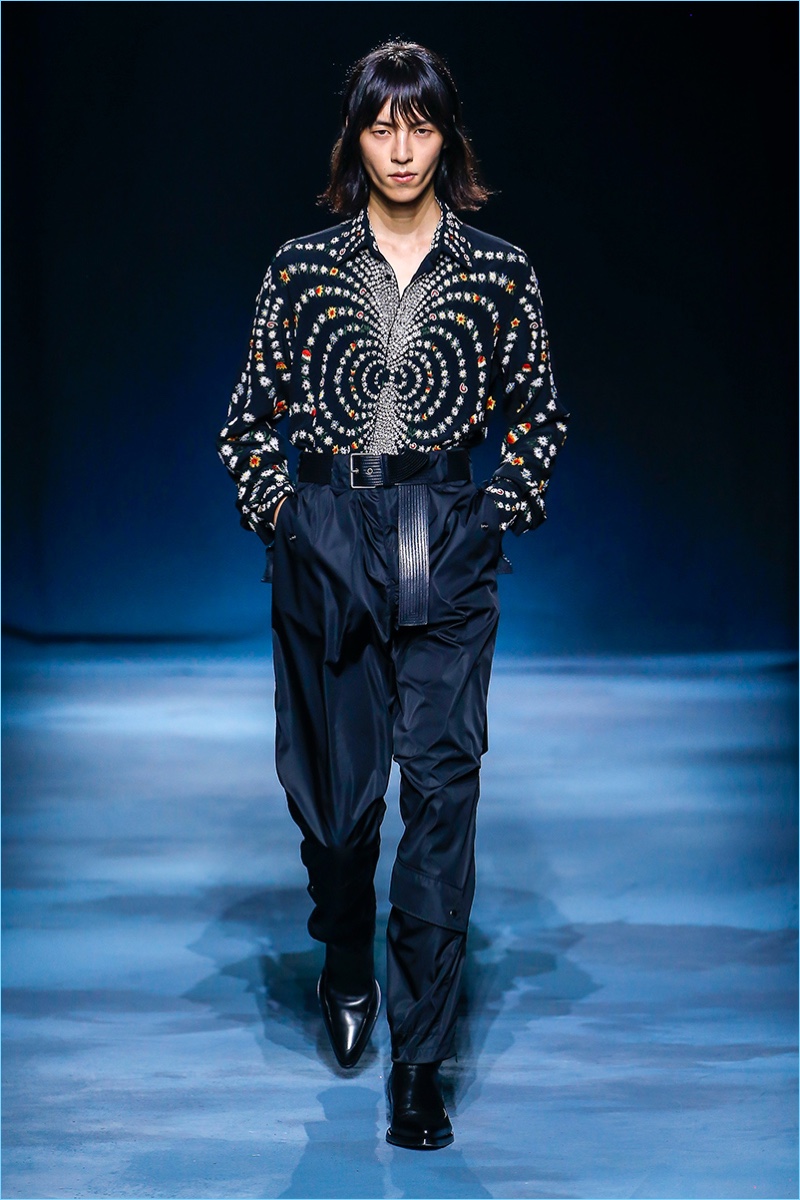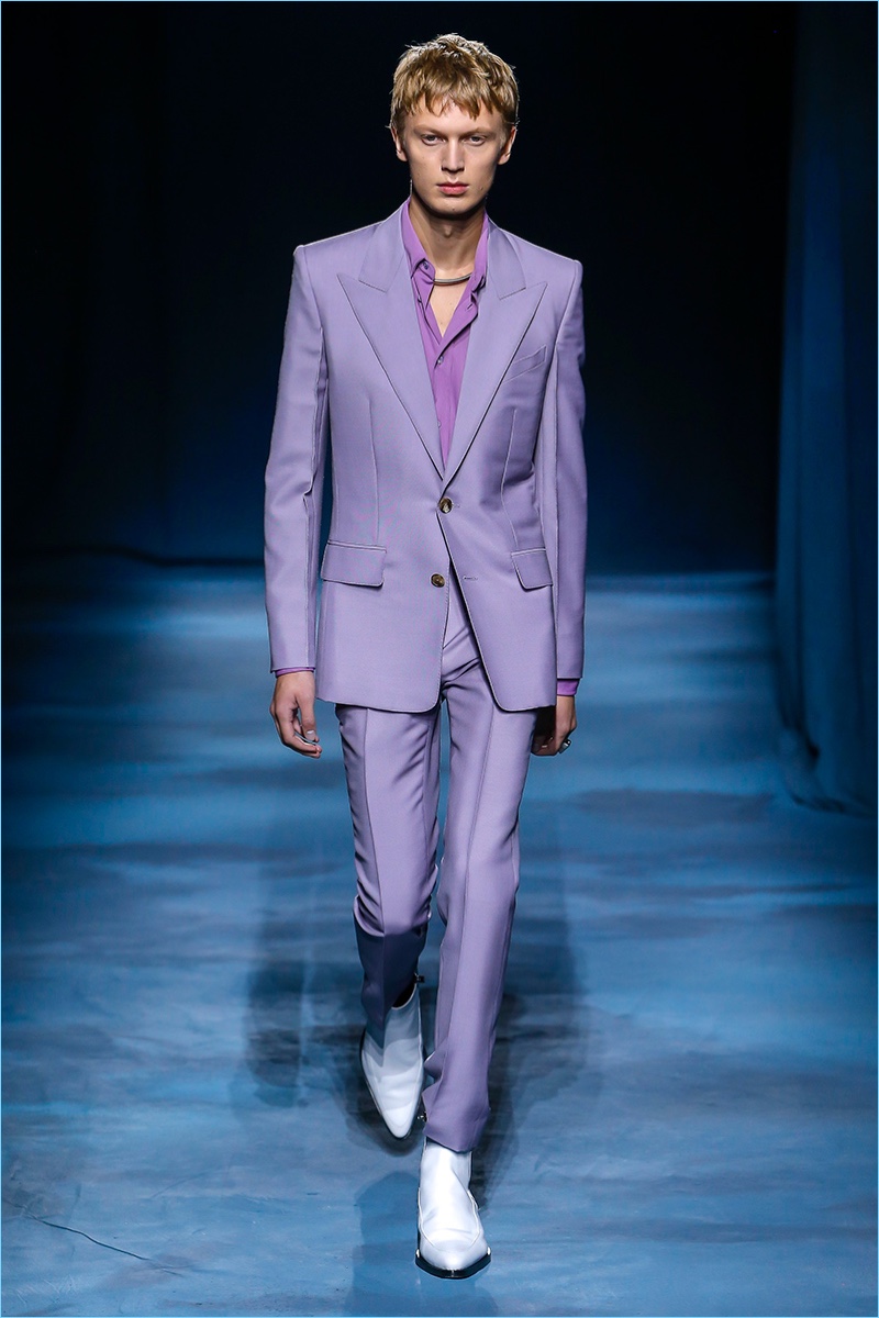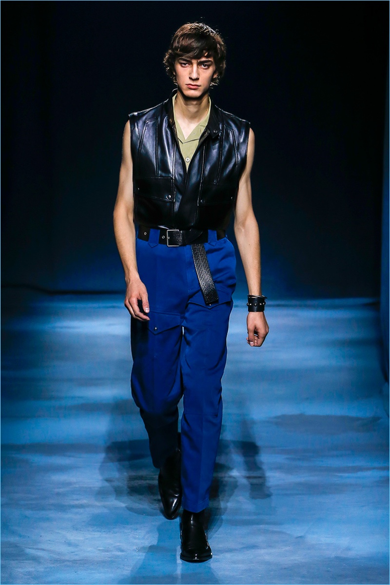 The Givenchy man puts on a stern face for spring-summer 2019. Clare Waight Keller makes a case for uniform style with a series of military-inspired looks. Neutral tones come together as Keller offers key items such as the two pocket shirt or a fresh spin on cargo pants. Chic style also reigns with belted trench coats and sharply tailored suits. One suit in particular shines in a gorgeous lilac. Meanwhile, the Givenchy man shows his edge with leather pants, sleeveless biker jackets, sequined trousers, and more.
