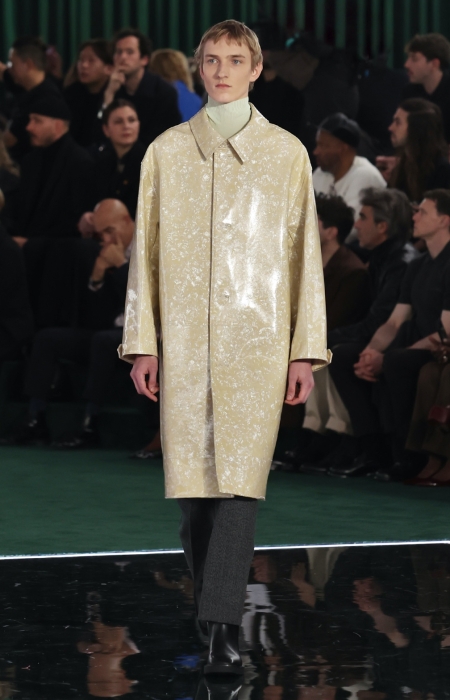Late-’60s silhouettes contrast against mid-’90s minimalism and recent maximalist waves. The lineup balances rich textures with playful contrasts—powdery pastels meet deep charcoals, while glossy coats shimmer under the light.