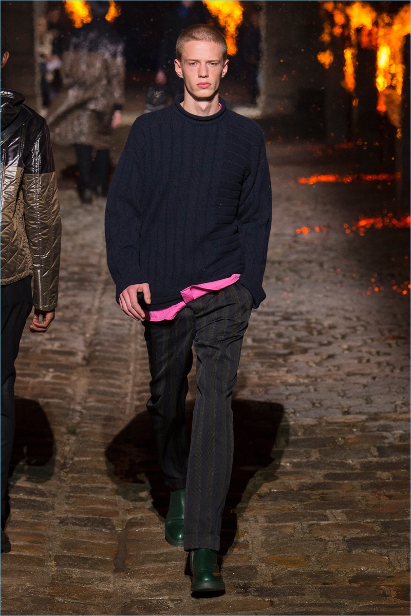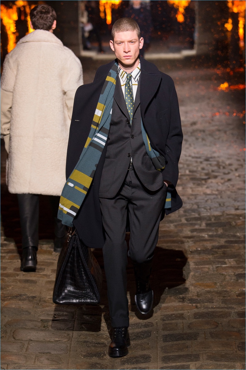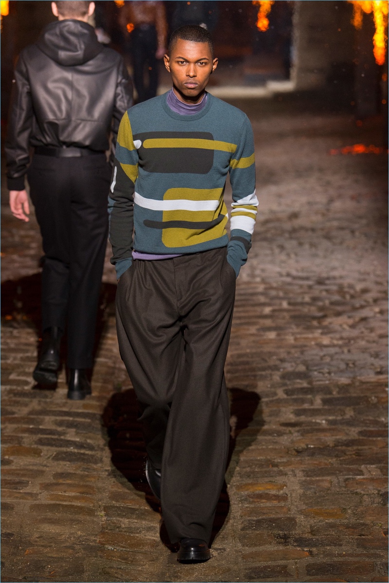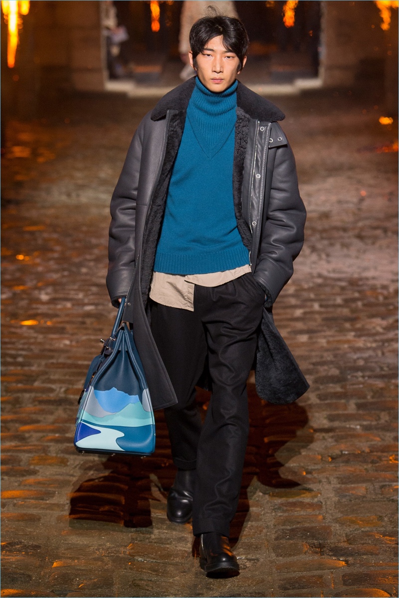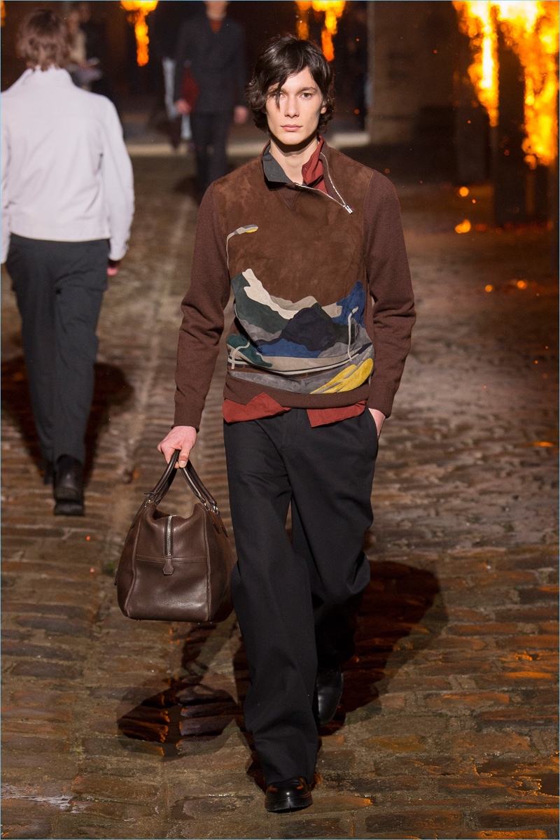Models took to a cobbled path as Hermès unveiled its fall-winter 2018 men’s collection during Paris Fashion Week. The French fashion house invited guests to a 17th-century Dominican monastery for the occasion. Presenting Hermès’ latest lineup, models walked down a pyre lined catwalk. The presentation highlighted the natural gloss of leather and the richness of ember-hued colors. Embracing a semi-relaxed silhouette, oversized coats, slouchy sweaters, straight-cut trousers, and trim cardigans came together. The collection also featured knitwear with geometric prints. Meanwhile, graphic lines are etched across leather apparel.