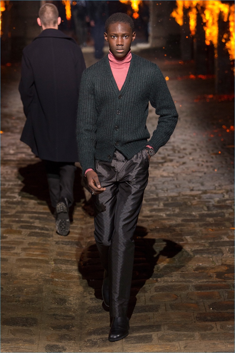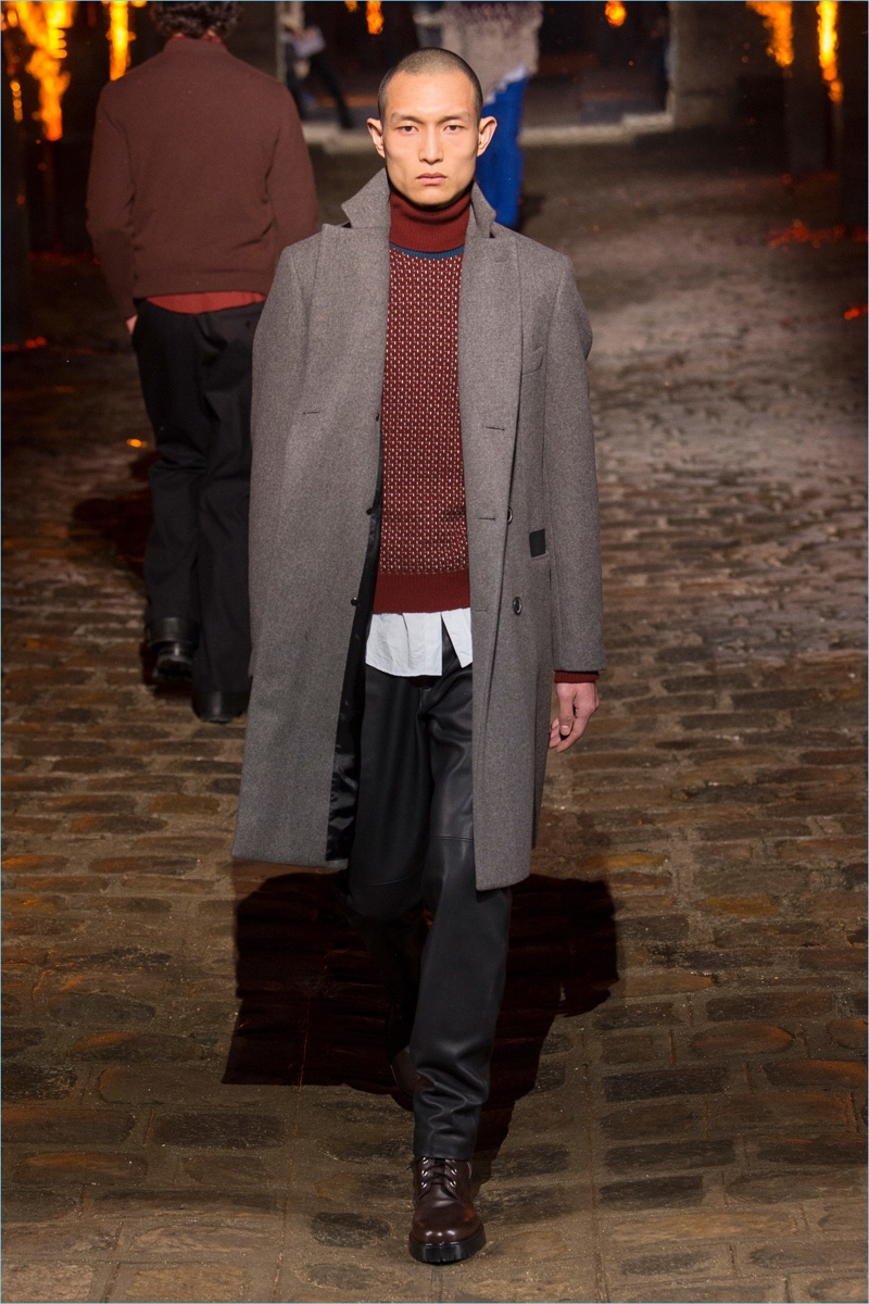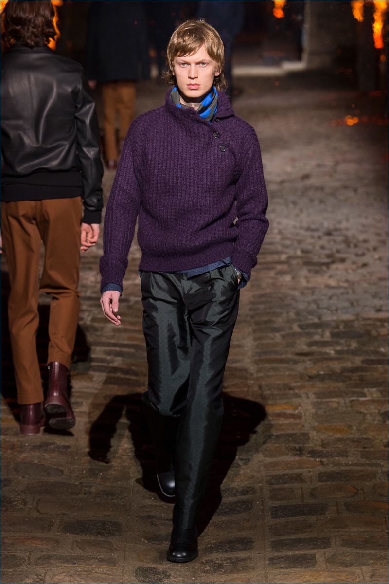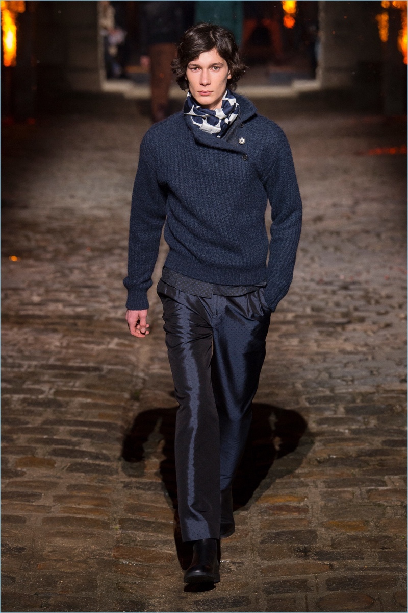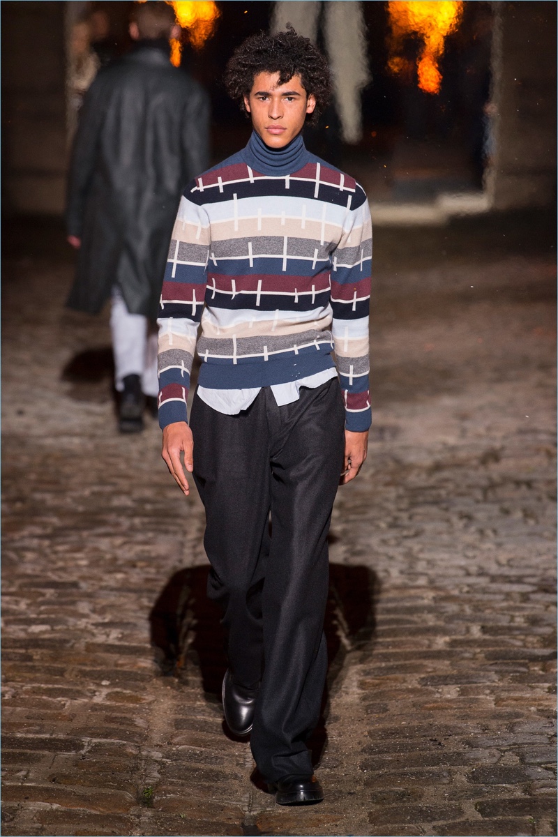 Models took to a cobbled path as Hermès unveiled its fall-winter 2018 men’s collection during Paris Fashion Week. The French fashion house invited guests to a 17th-century Dominican monastery for the occasion. Presenting Hermès’ latest lineup, models walked down a pyre lined catwalk. The presentation highlighted the natural gloss of leather and the richness of ember-hued colors. Embracing a semi-relaxed silhouette, oversized coats, slouchy sweaters, straight-cut trousers, and trim cardigans came together. The collection also featured knitwear with geometric prints. Meanwhile, graphic lines are etched across leather apparel.