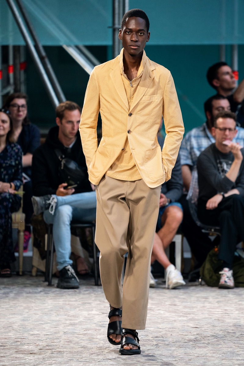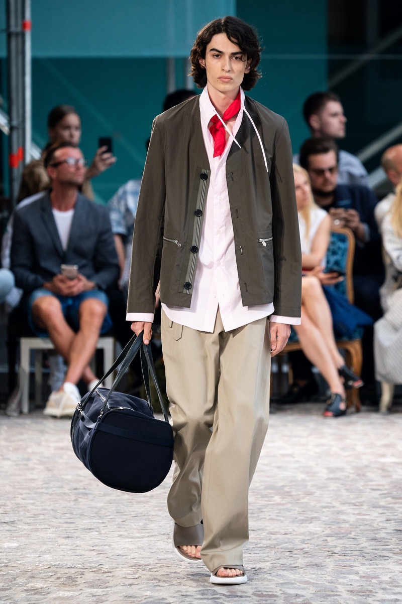 Véronique Nichanian embraces a more casual stride for Hermès’ spring-summer 2020 men’s collection. Contemporary streetwear trends inspire relaxed proportions and easy layers. A playful palette of yellow, pink, and turquoise pop against neutrals. Windbreakers, striped shirts, checked coats, ribbed cardigans, and more contribute to an easy to wear season. Both graphics and geometric prints clash for an arts-driven approach to leisurewear. Meanwhile, leather sandals, totes, and carryalls join scarves for chic must-have accessories.