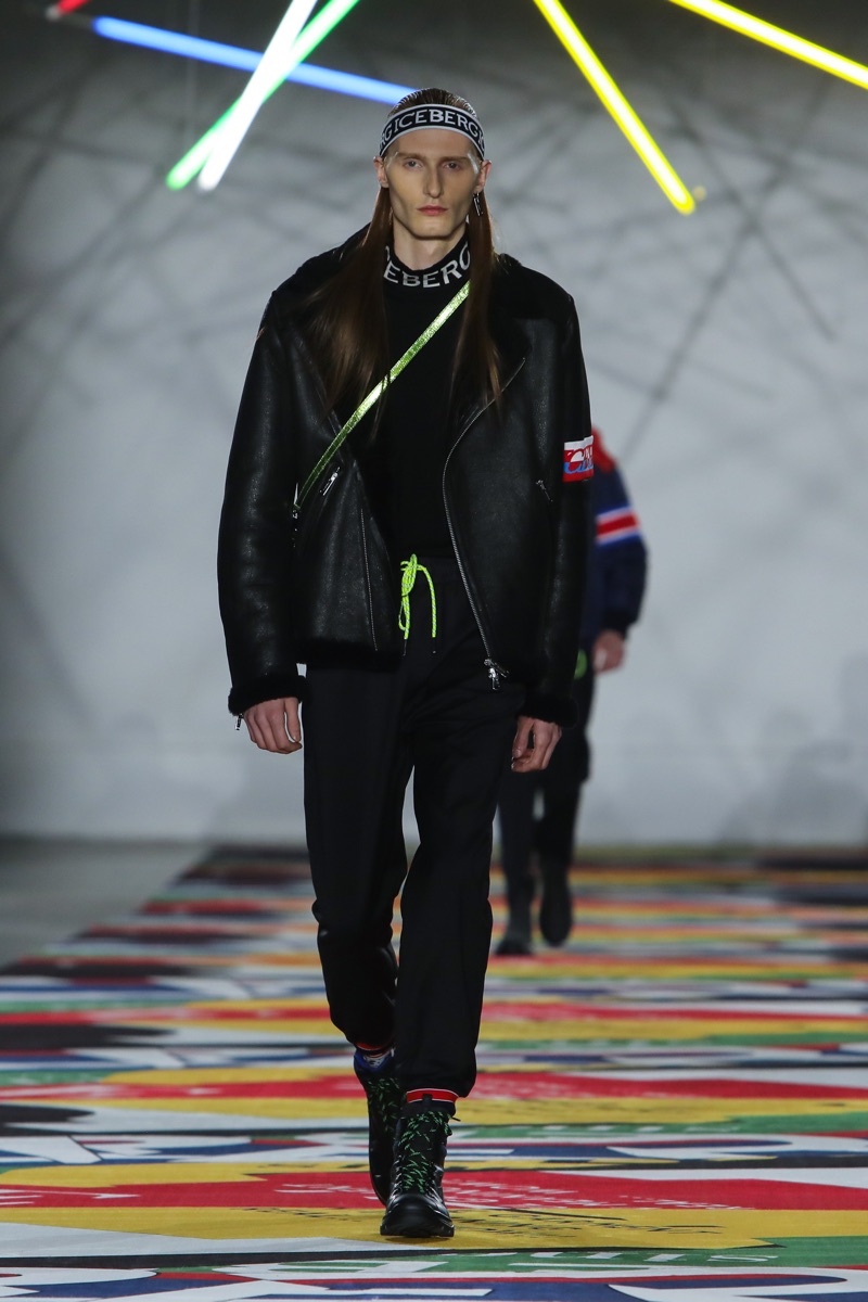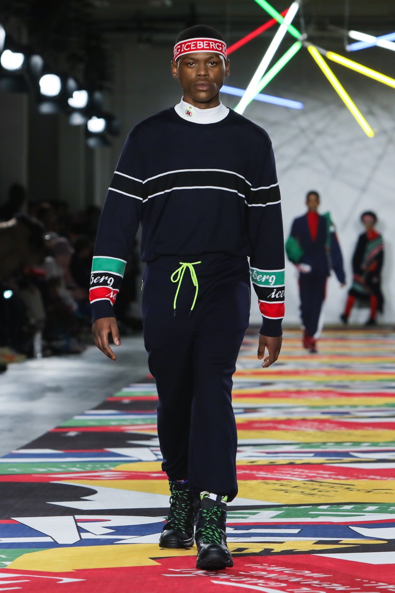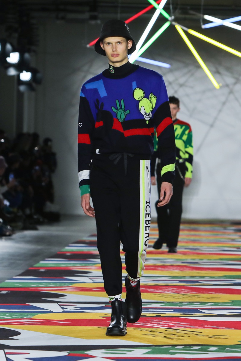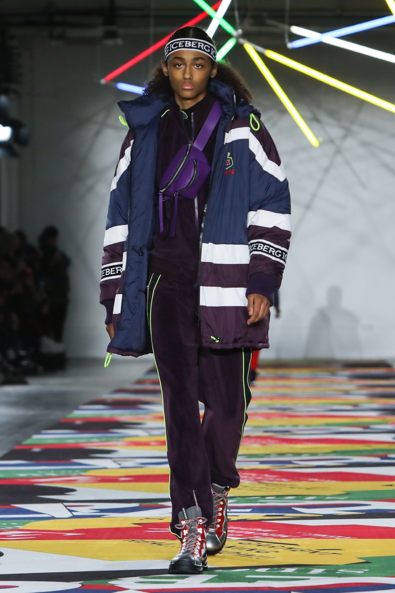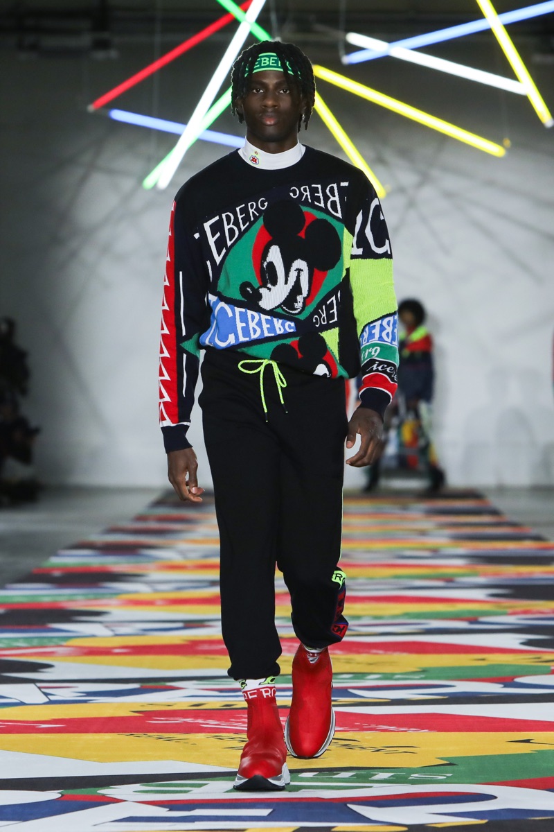 Iceberg takes us to the Italian Alps with its fall-winter 2019 collection. Returning home to the United Kingdom, the brand’s designer James Long presents the lineup during London Fashion Week Men. The sporty outing includes a fun mix of colors and graphics. Elements range from logo ski flag shapes and puzzles patterns to glossy parkas. Embracing a punk motif, graffiti logos emerge as well. They complement sweaters, jackets, and tracksuits. Championing the little kid in everyone, Iceberg continues to feature Mickey Mouse among its graphics.