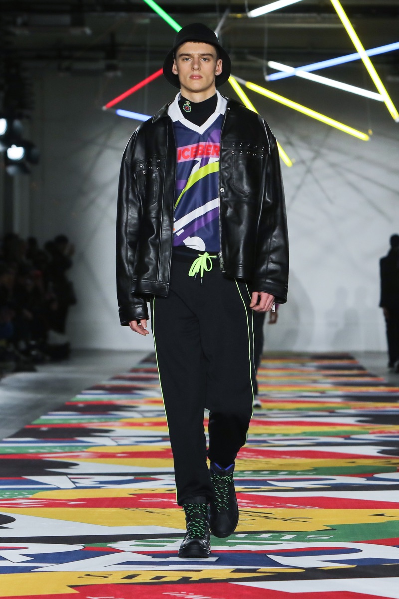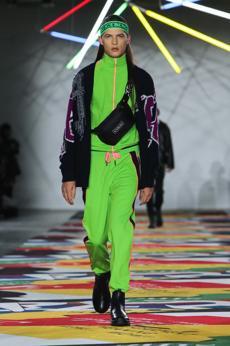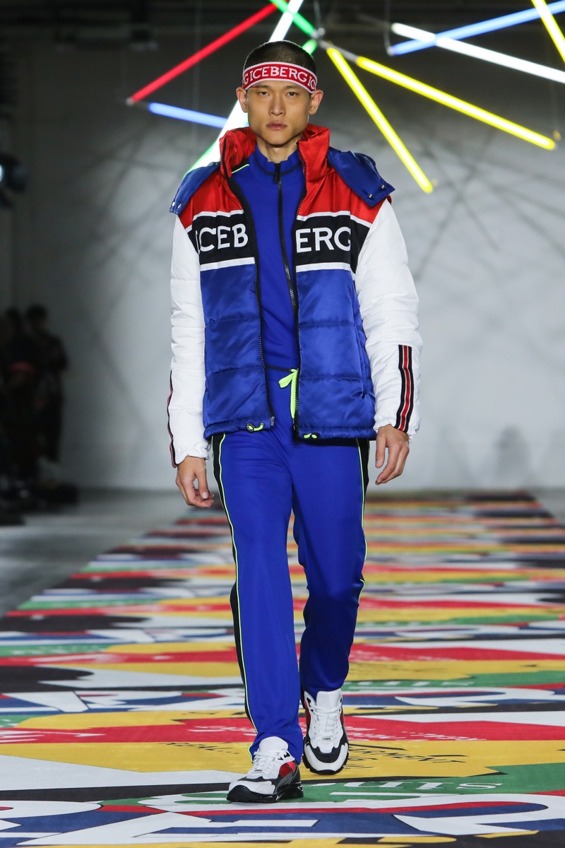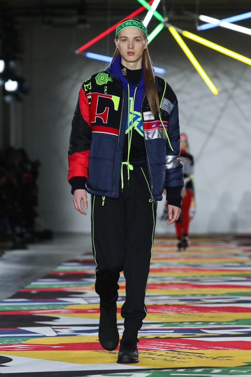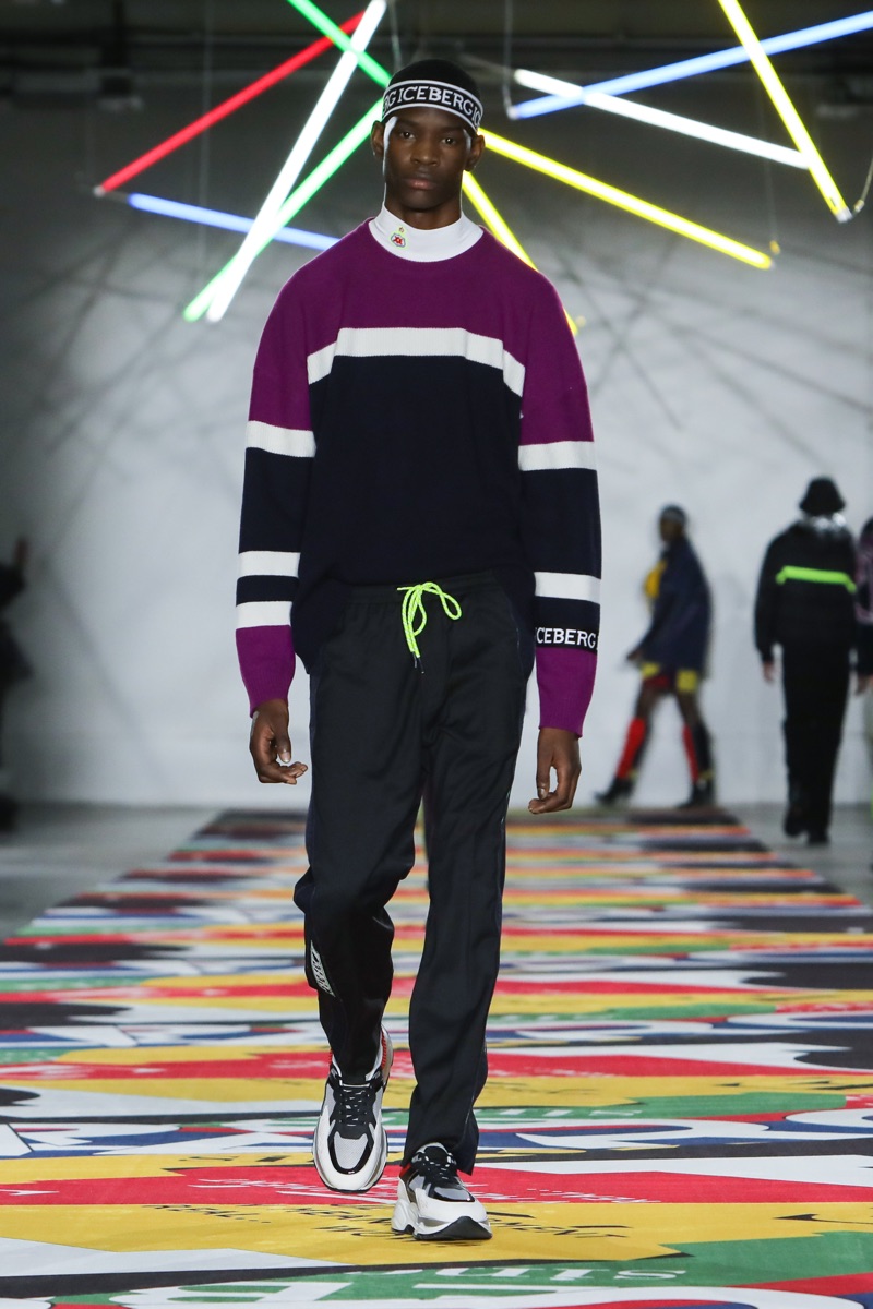Iceberg takes us to the Italian Alps with its fall-winter 2019 collection. Returning home to the United Kingdom, the brand’s designer James Long presents the lineup during London Fashion Week Men. The sporty outing includes a fun mix of colors and graphics. Elements range from logo ski flag shapes and puzzles patterns to glossy parkas. Embracing a punk motif, graffiti logos emerge as well. They complement sweaters, jackets, and tracksuits. Championing the little kid in everyone, Iceberg continues to feature Mickey Mouse among its graphics.