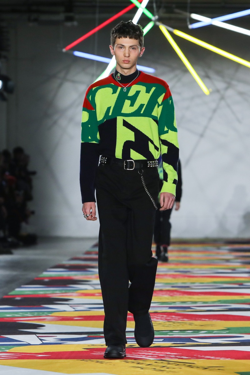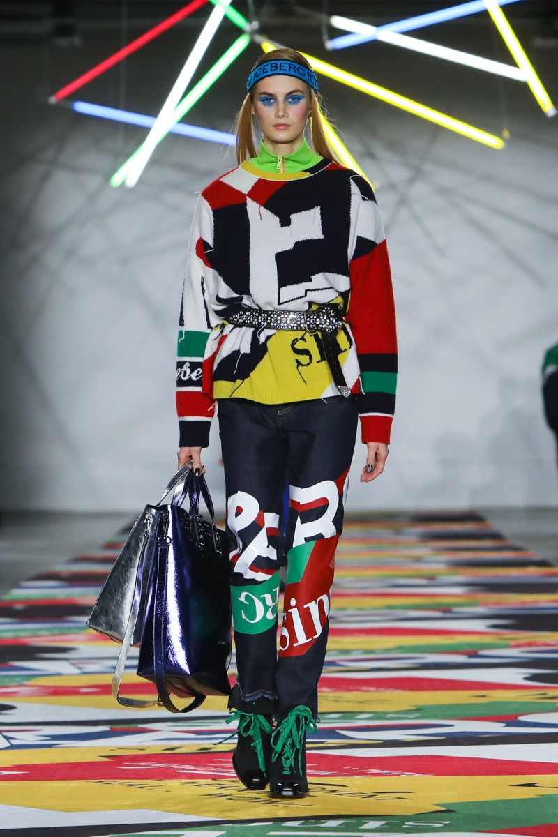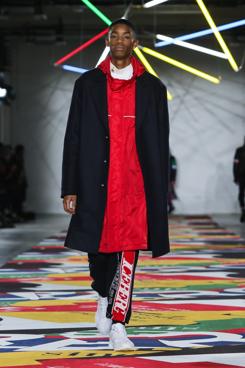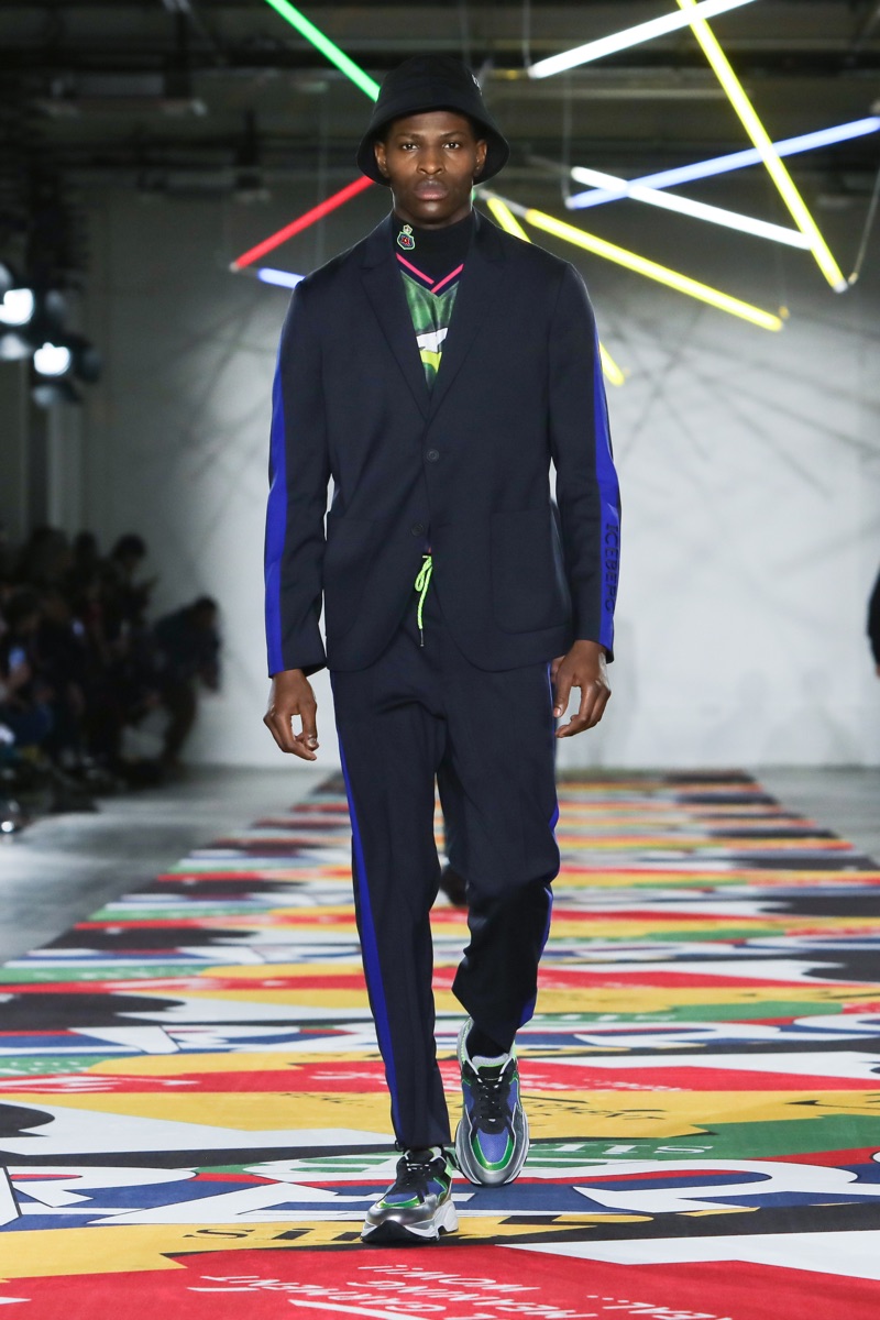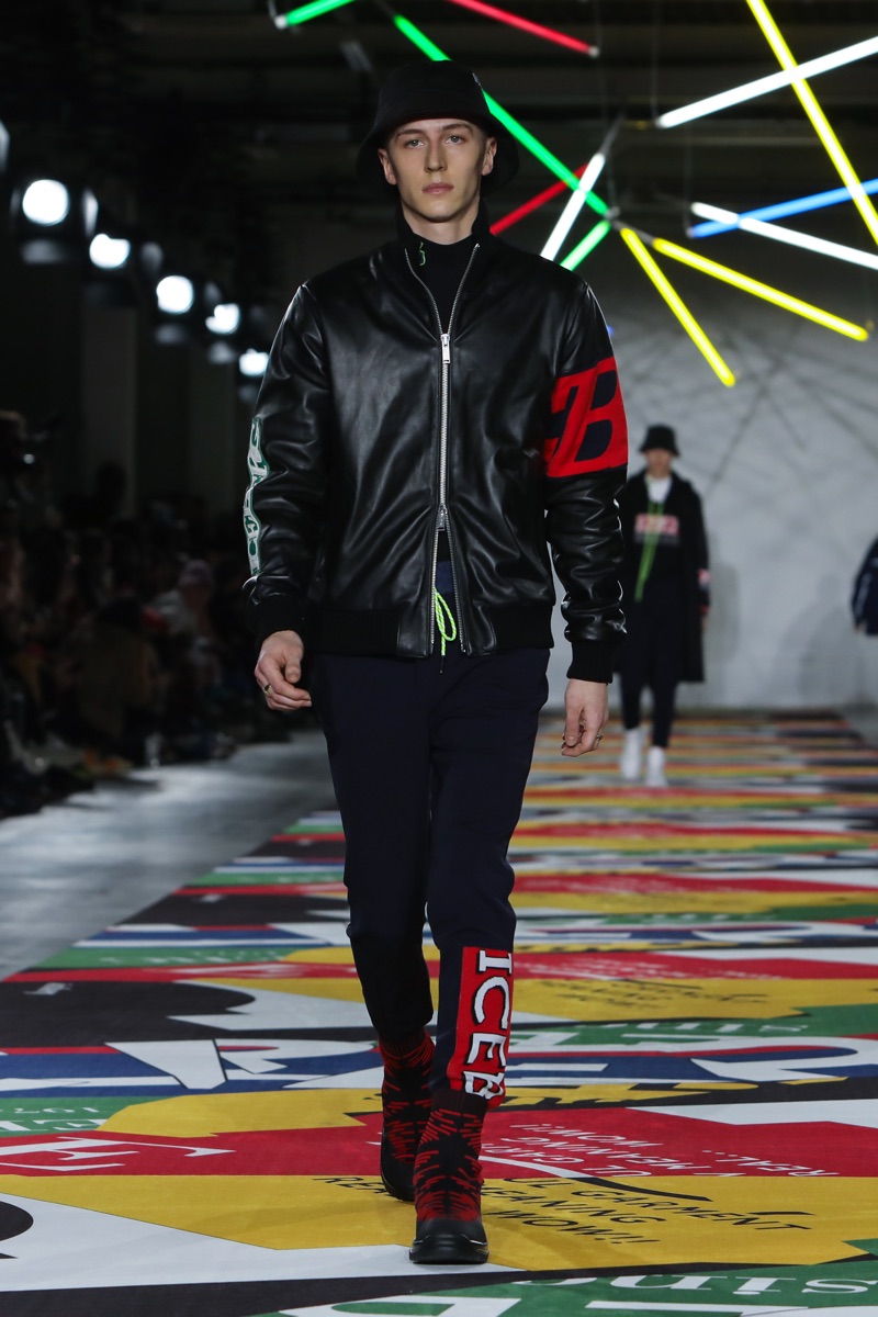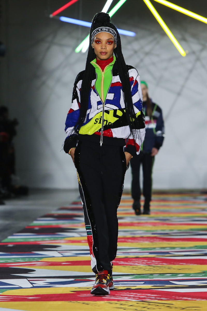 Iceberg takes us to the Italian Alps with its fall-winter 2019 collection. Returning home to the United Kingdom, the brand’s designer James Long presents the lineup during London Fashion Week Men. The sporty outing includes a fun mix of colors and graphics. Elements range from logo ski flag shapes and puzzles patterns to glossy parkas. Embracing a punk motif, graffiti logos emerge as well. They complement sweaters, jackets, and tracksuits. Championing the little kid in everyone, Iceberg continues to feature Mickey Mouse among its graphics.