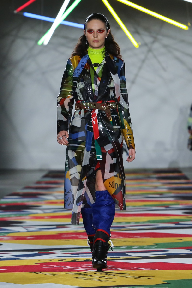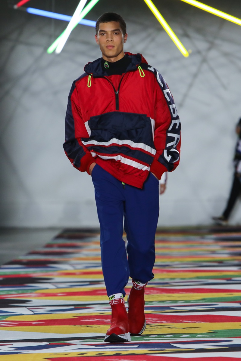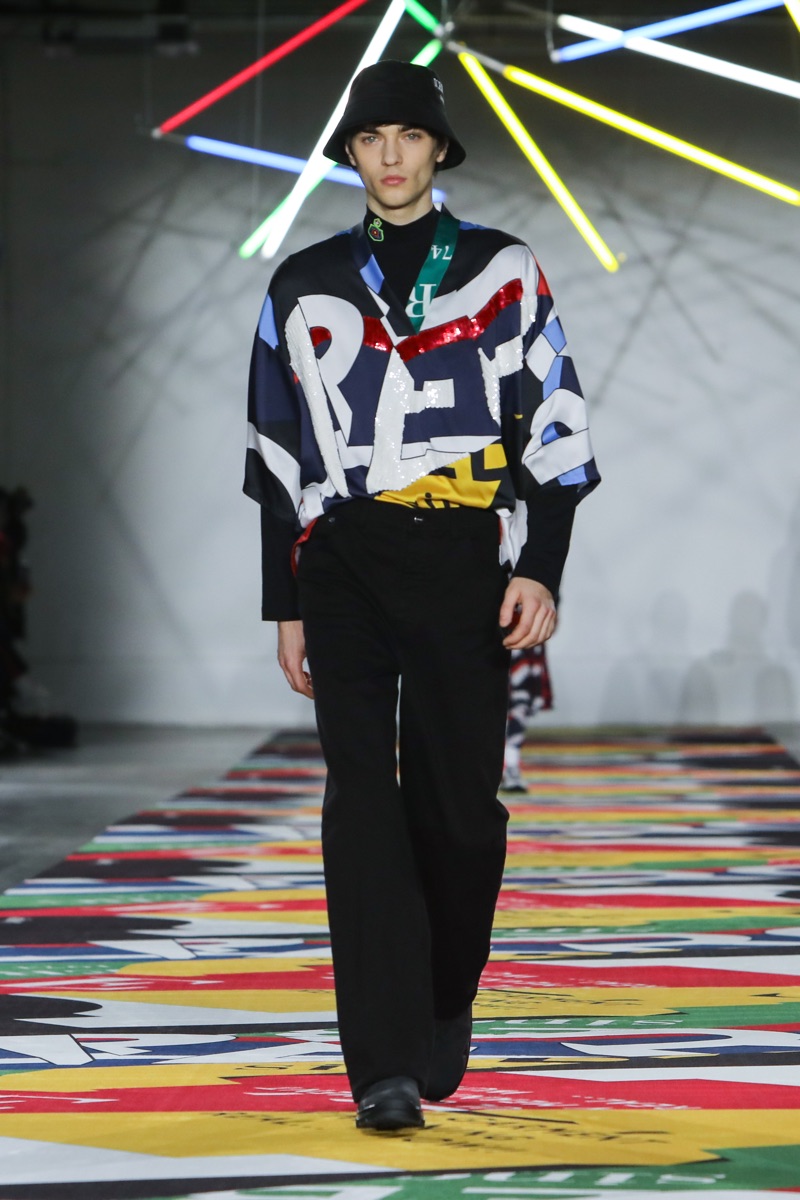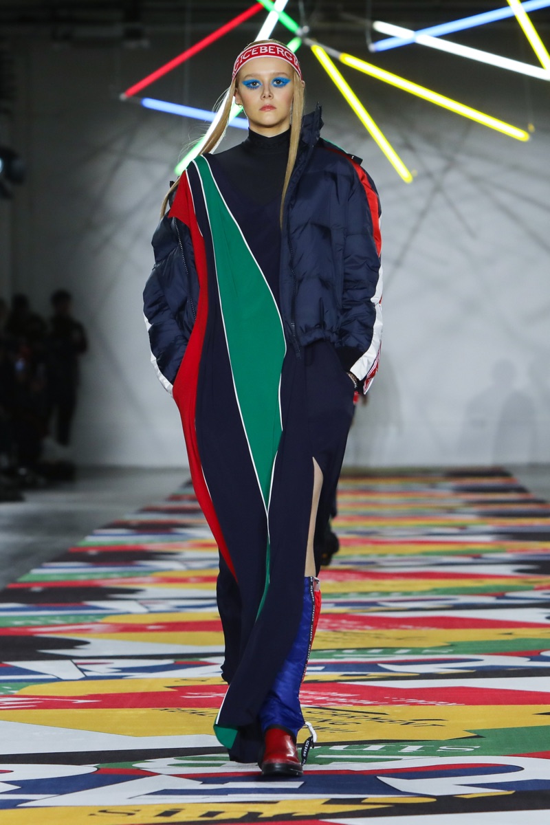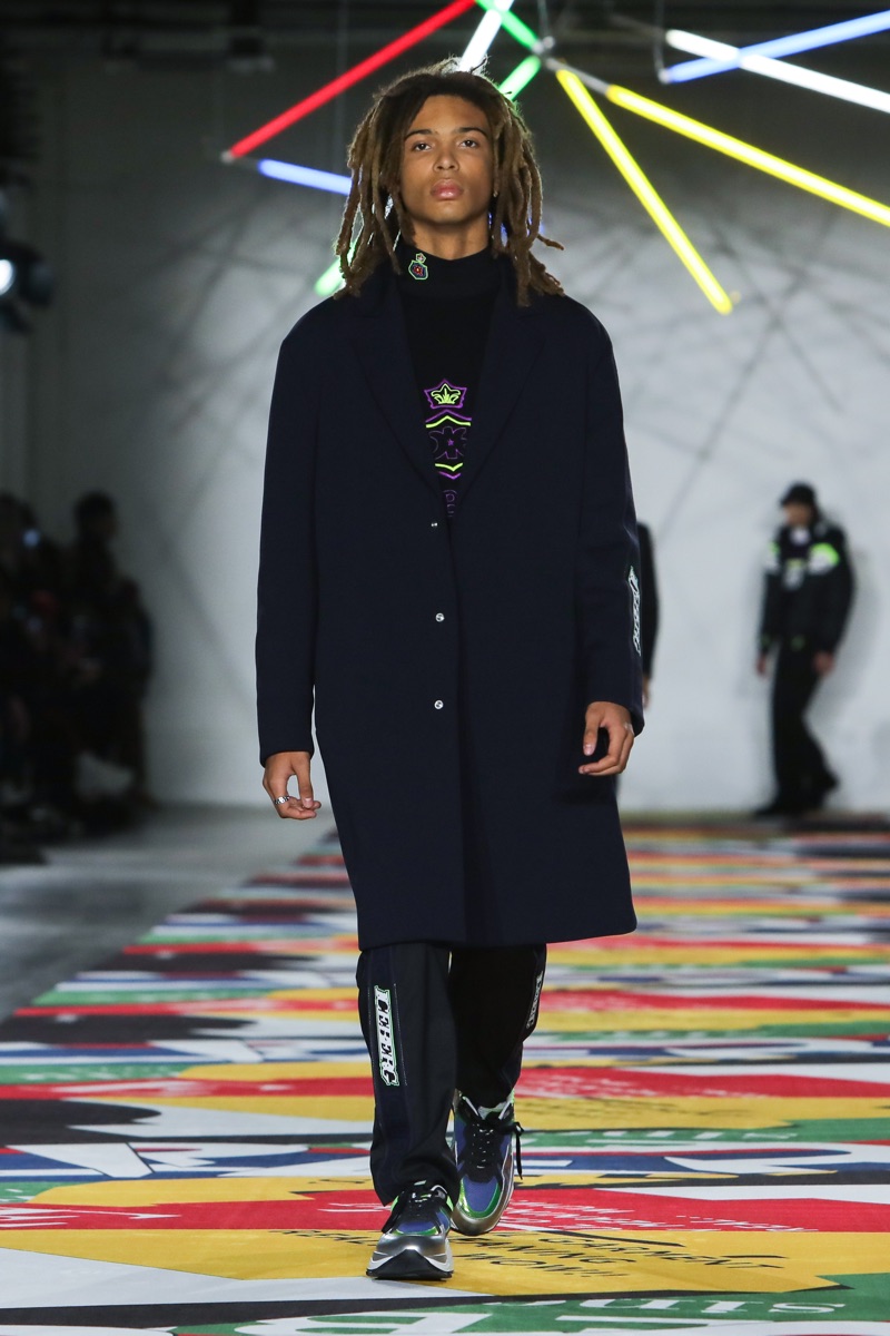 Iceberg takes us to the Italian Alps with its fall-winter 2019 collection. Returning home to the United Kingdom, the brand’s designer James Long presents the lineup during London Fashion Week Men. The sporty outing includes a fun mix of colors and graphics. Elements range from logo ski flag shapes and puzzles patterns to glossy parkas. Embracing a punk motif, graffiti logos emerge as well. They complement sweaters, jackets, and tracksuits. Championing the little kid in everyone, Iceberg continues to feature Mickey Mouse among its graphics.
