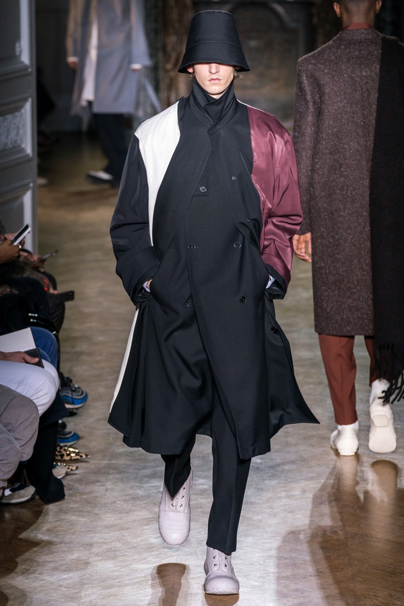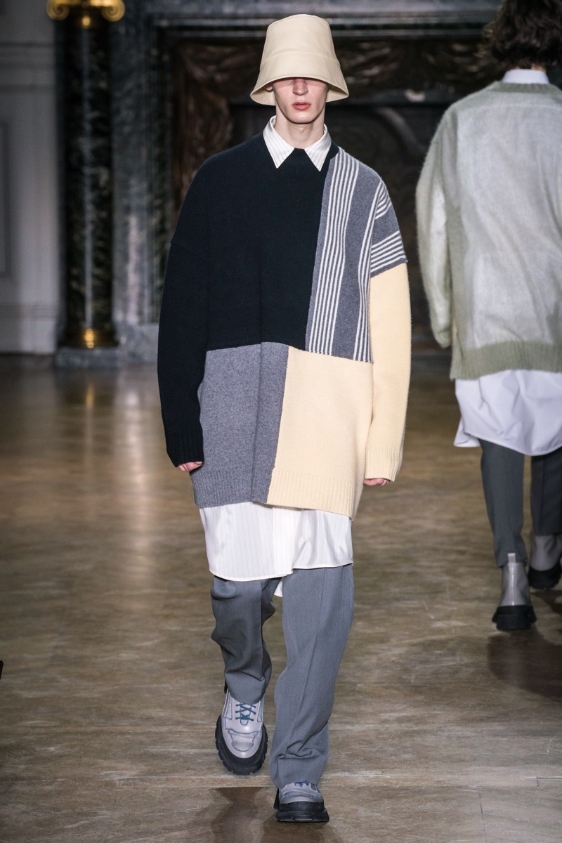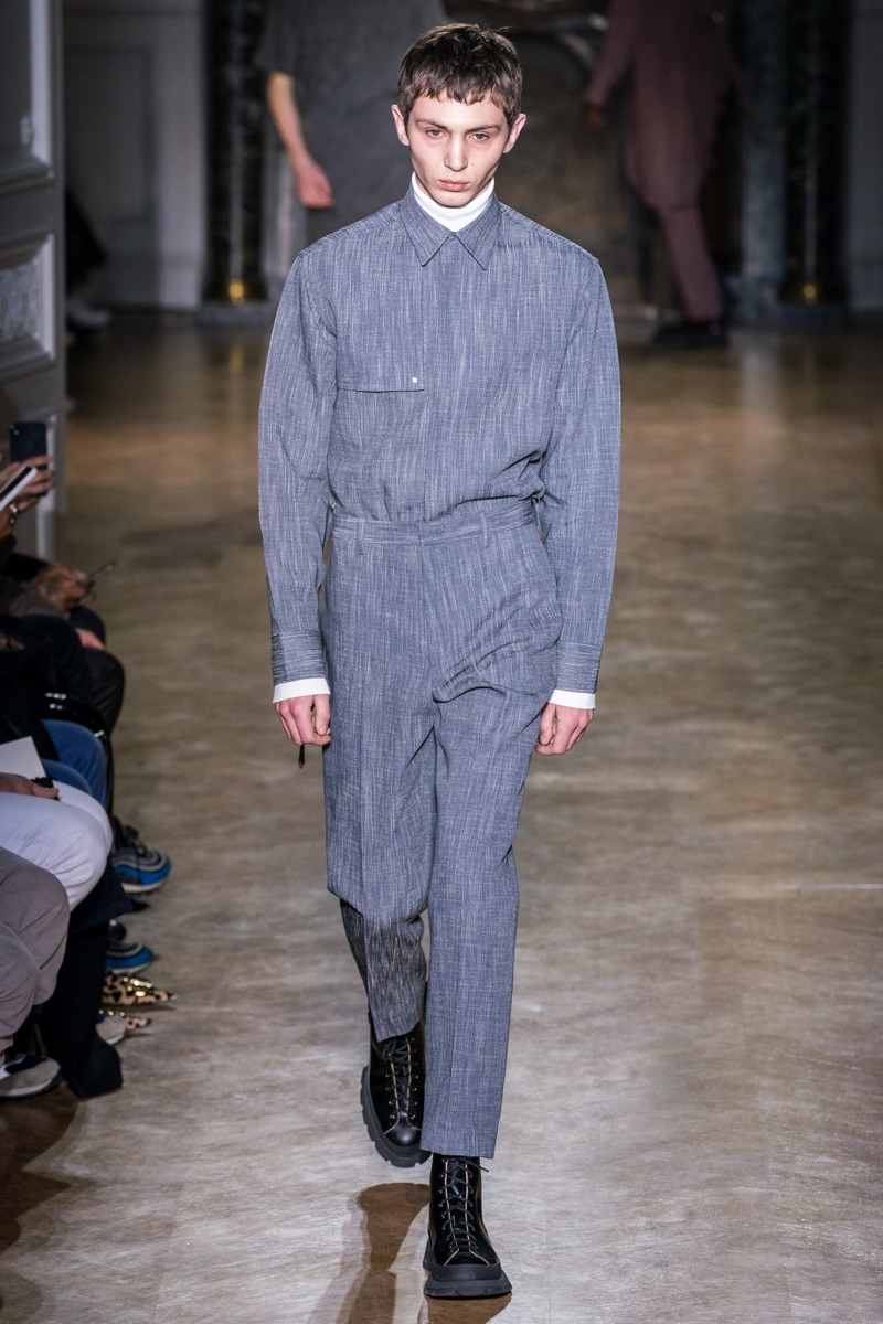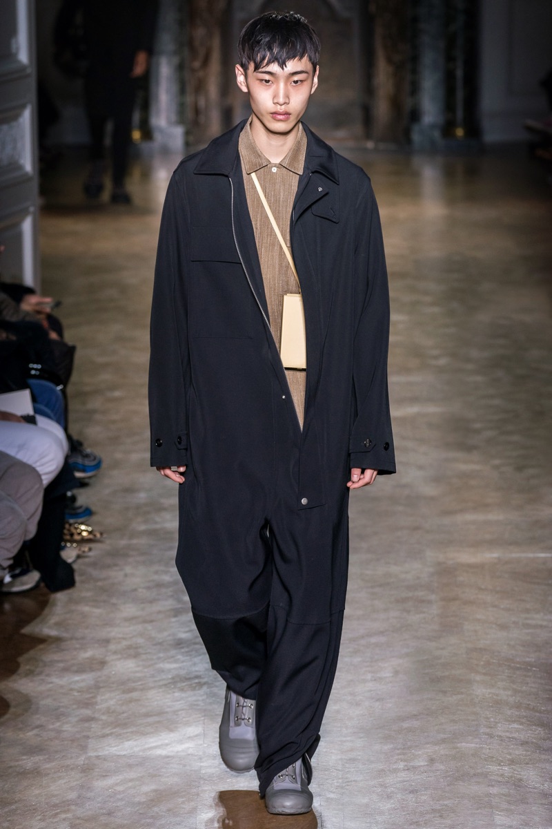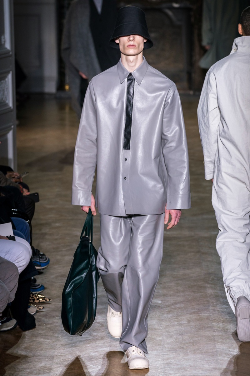 Lucie and Luke Meier turn their attention to tailoring and its modern application for fall-winter 2019. The Jil Sander man embraces a relaxed silhouette for the season. Monochromatic numbers come together with a casual but elegant approach to dressing. Fluid shapes encompass a selection of coats and jackets that complement trousers with elasticated ankles. Bringing a luxury component to the outing, leather dresses pieces before the introduction of longline shirting, oversized jumpers, and bold color blocking.