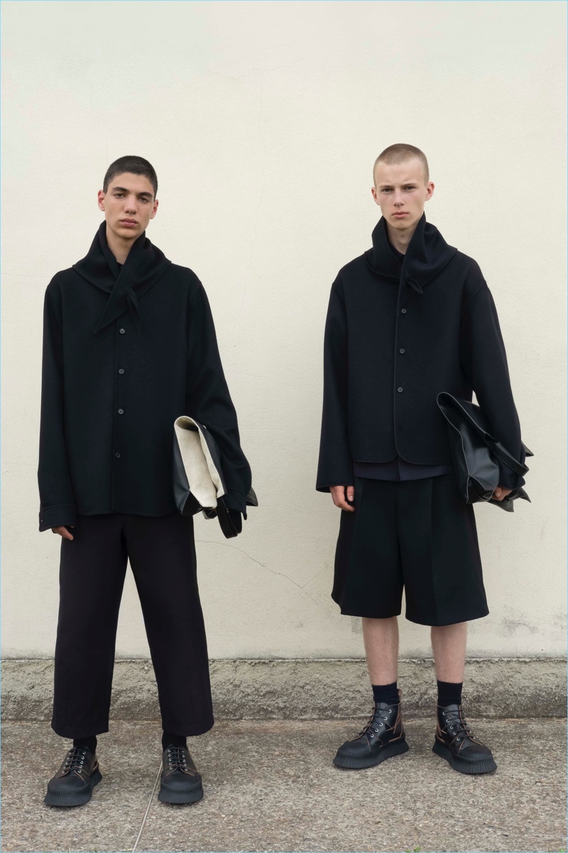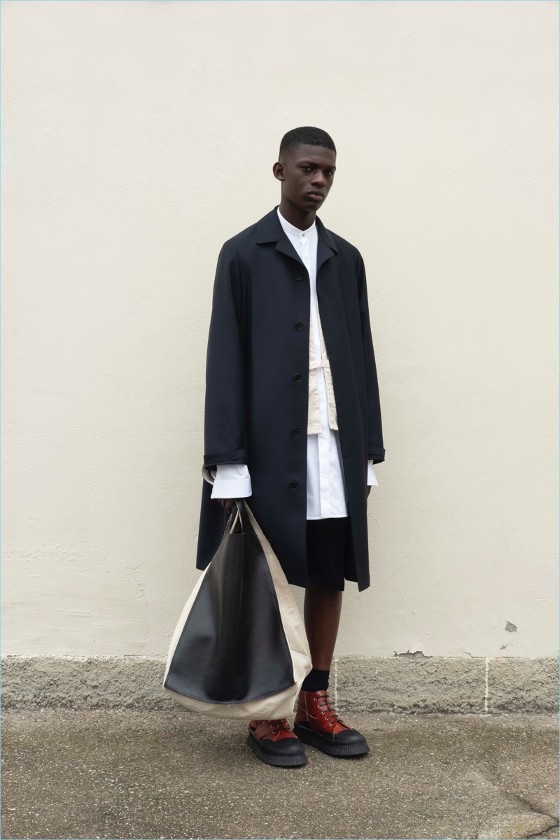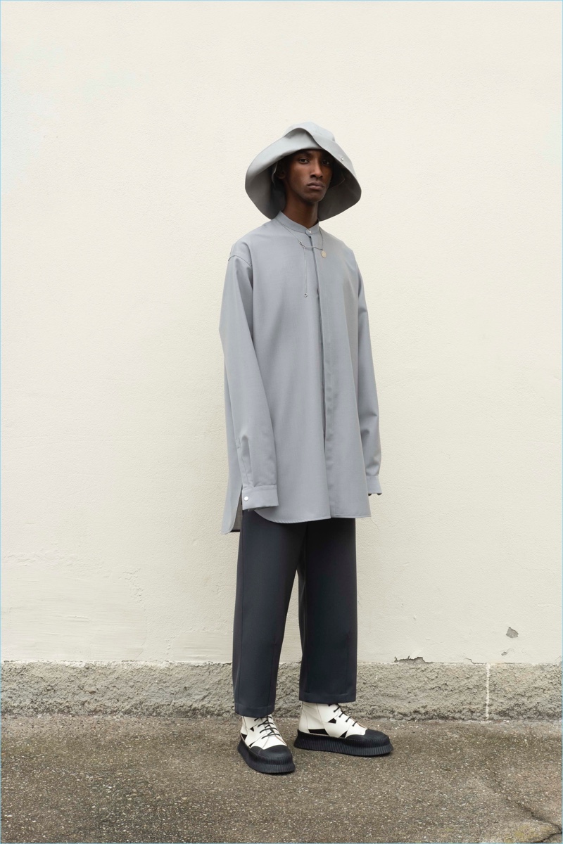 Lines are purified throughout the collection in a geometric form: in suits, outerwear, shirts, pants, shoes and bag shapes. The creative properties of function are explored, and challenged, through the use of garment dye and finishings in natural materials, such as leather or cotton, that generate a strong contrast with the sharpness of lines. The result is a human touch within the functional world of the uniform.