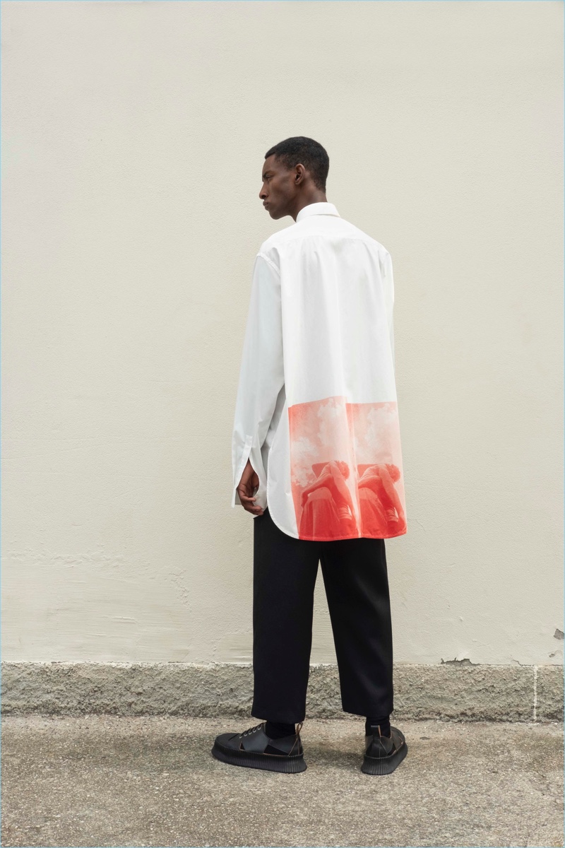 Crisp and iconic, the white poplin shirts are printed with photographic images realized through an elaborate process of silk screens, in black and white, red, green, and turquoise. Mostly long, with oversized sleeves, and modest or sculptural collars, they emphasize the sense of youth, freedom, intelligence, and rebellion that runs throughout the collection.