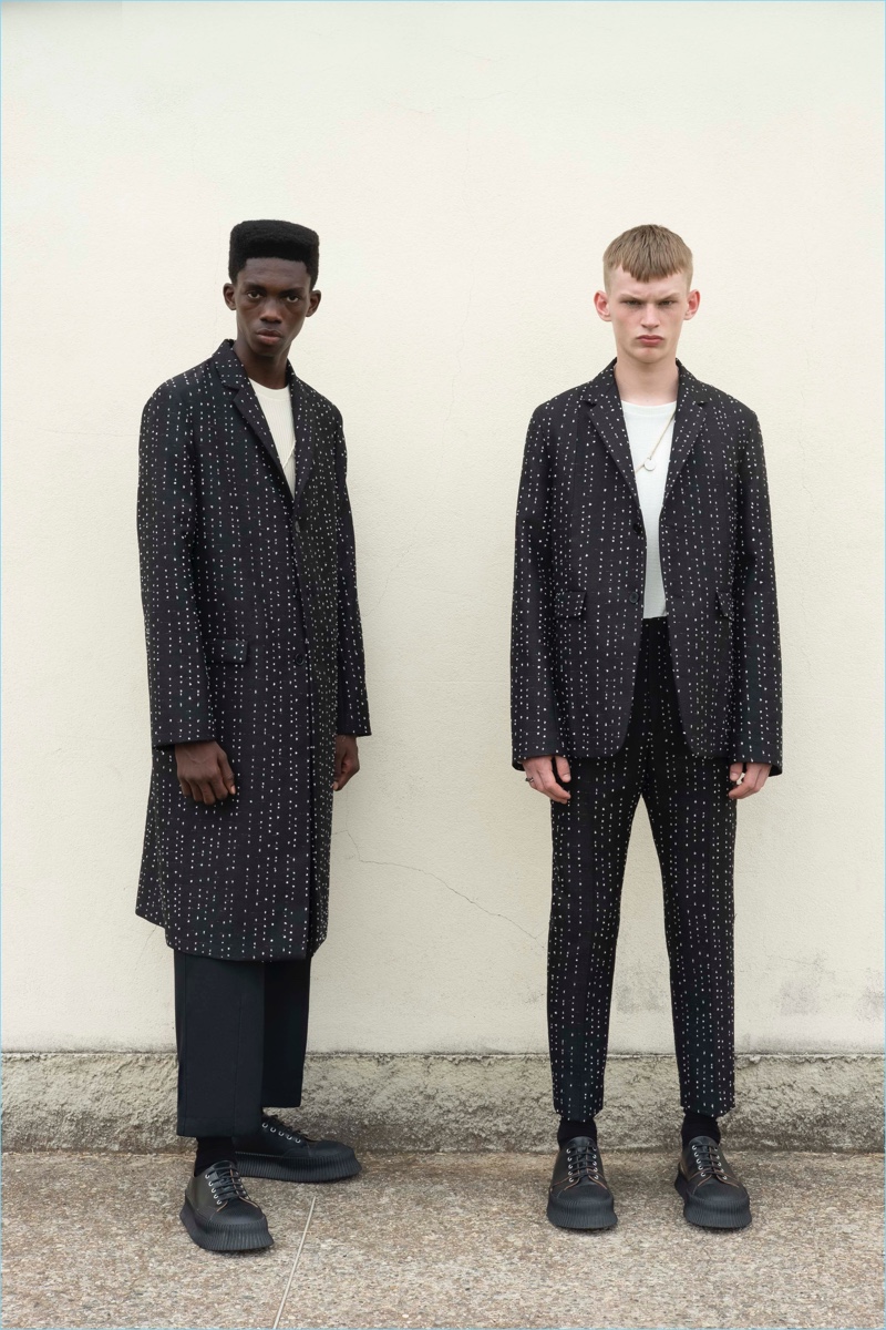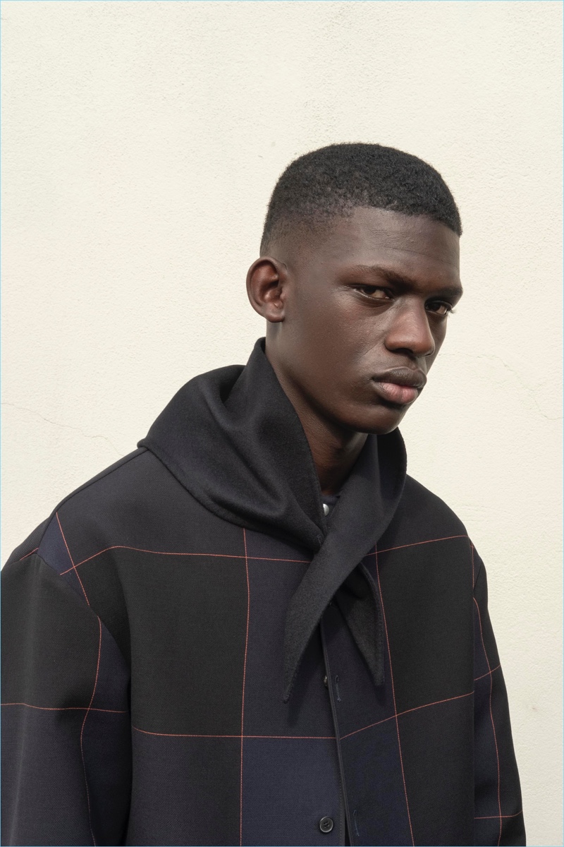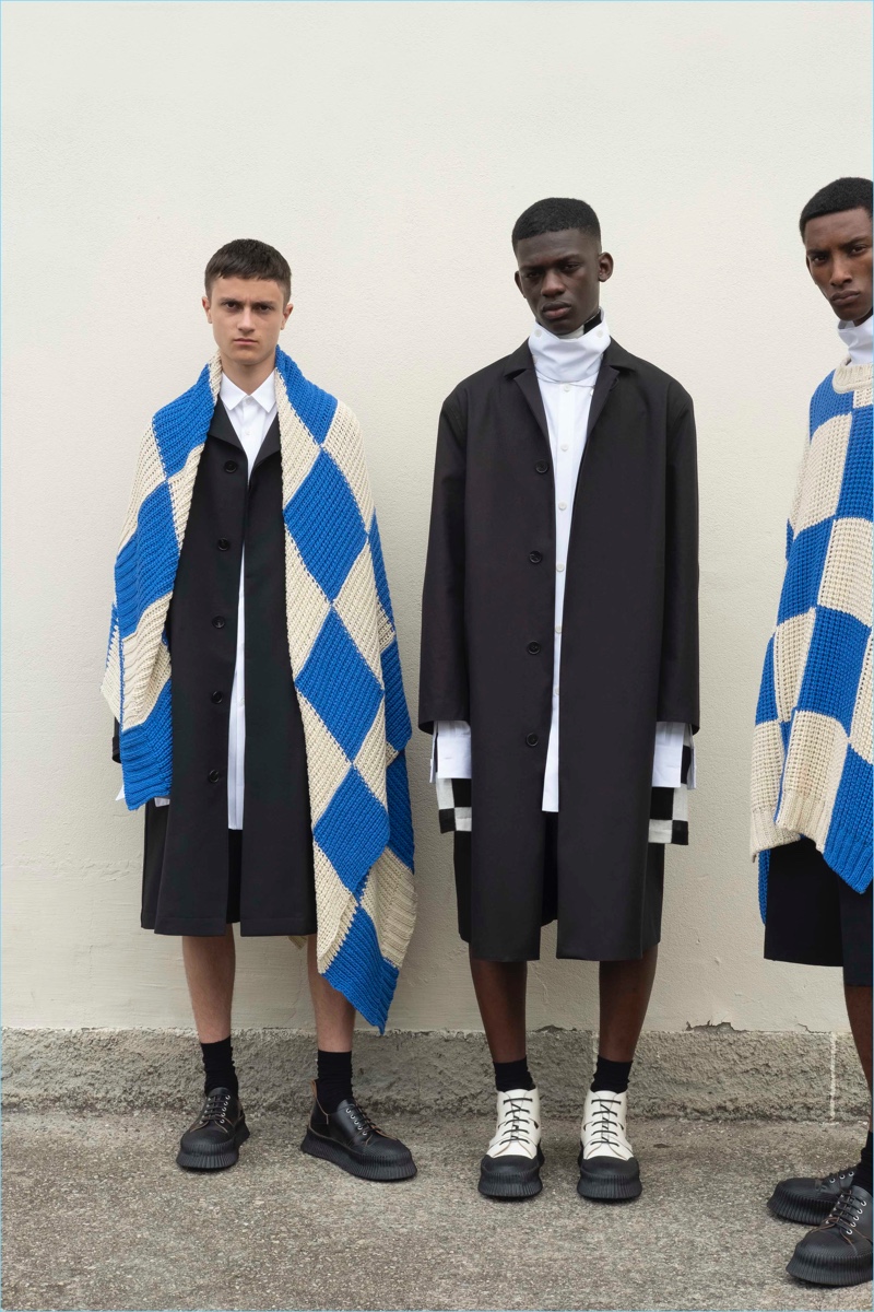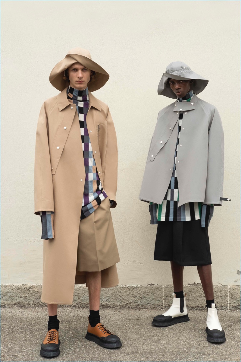 Summer is fresh, airy, and easy. Sharp suits are reinvented with a soft kilt silhouette, black and white, navy or cream, in deep hues or subtly textured. Polyester is woven with a bicolor wool mouliné that gives garments a three-dimensional look. Natural fiber fabrics are shown un-dyed in their purest form, while yarn dyed suiting and boucle jacquards animate tailoring, overcoats, and accessories. The shorter shapes of jackets and trousers are paired with structured, yet light, coats, and raincoats in strong water-repellent cotton-polyurethane. Trousers are cut sharply at the ankle, shirts are extended, and headwear and hoods are protective and soft.