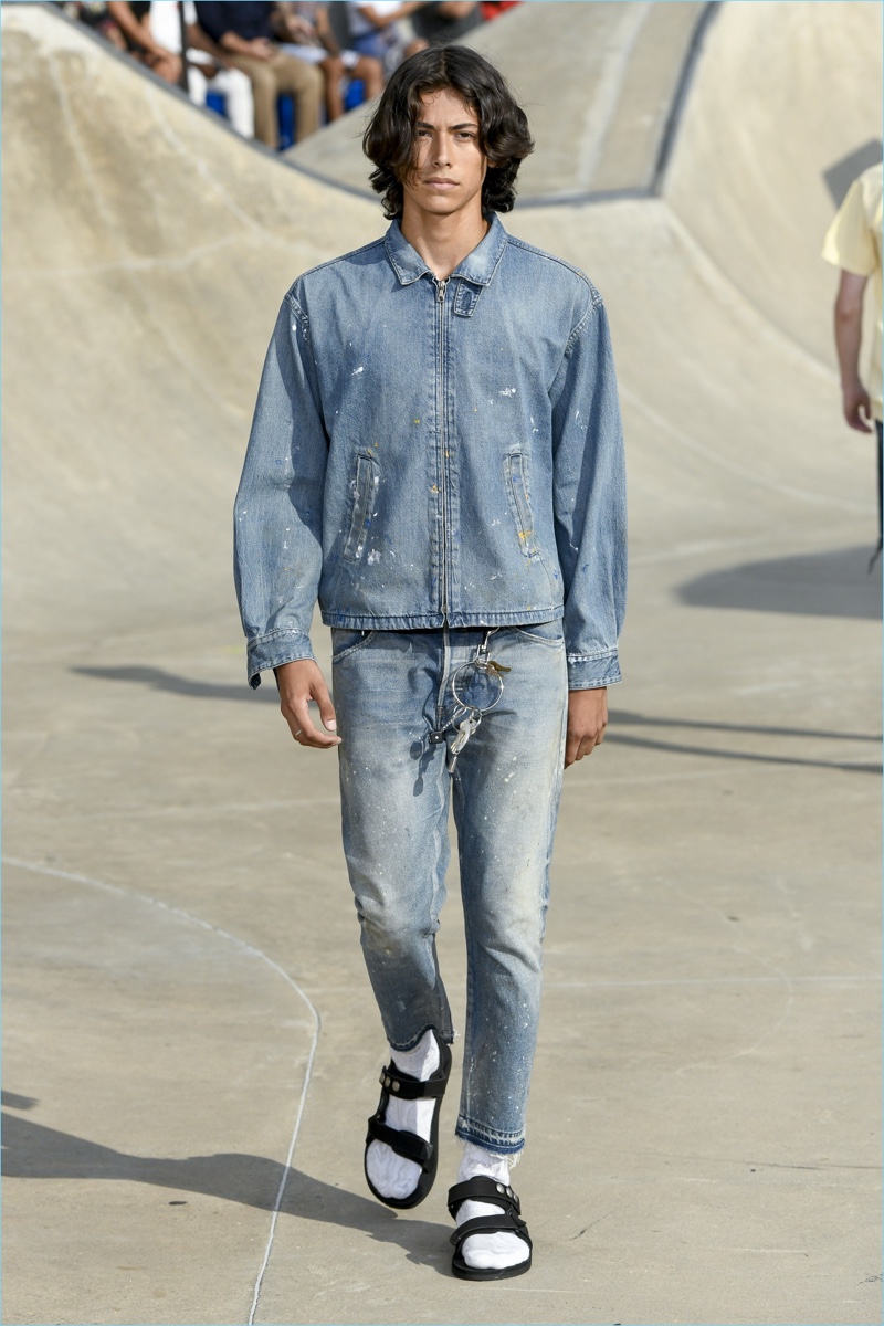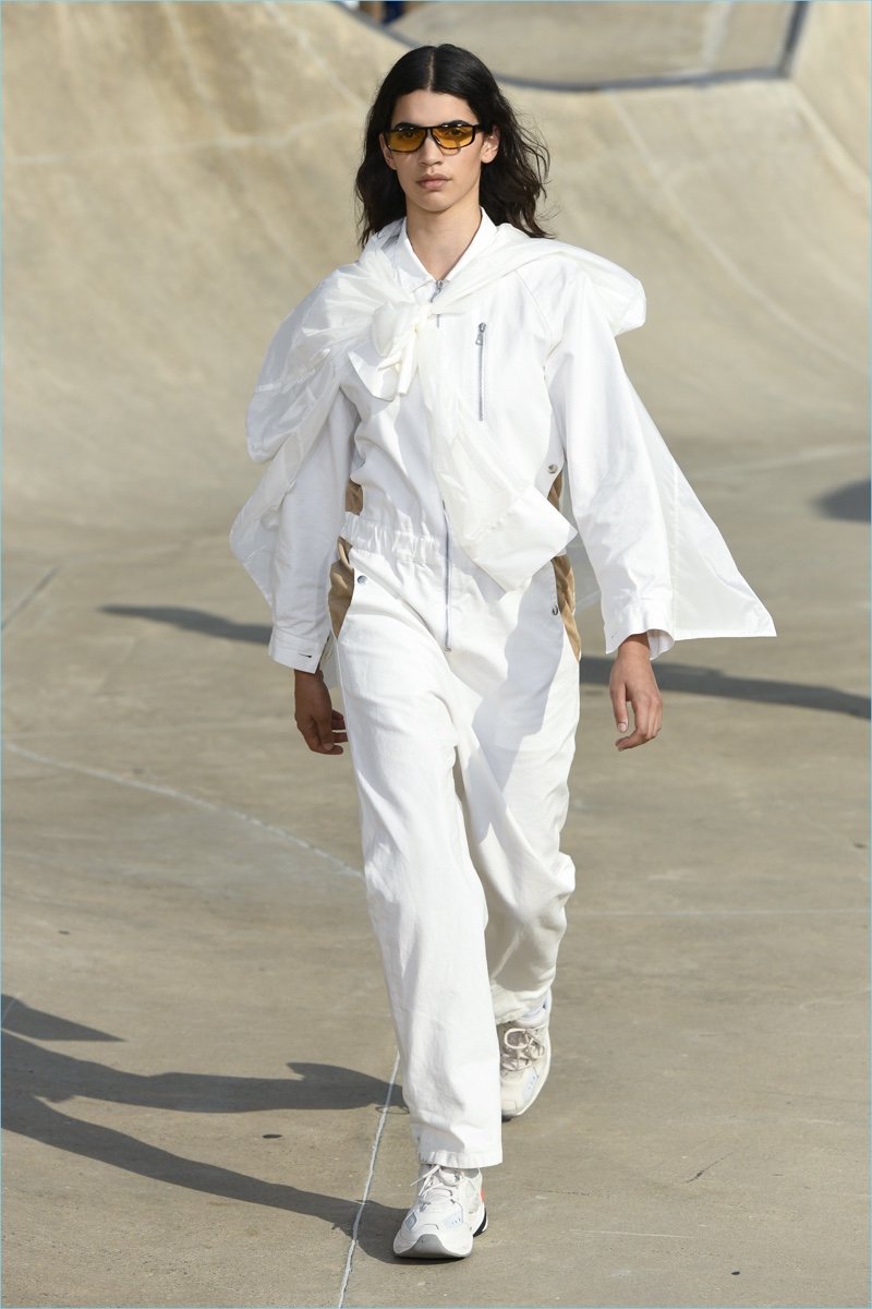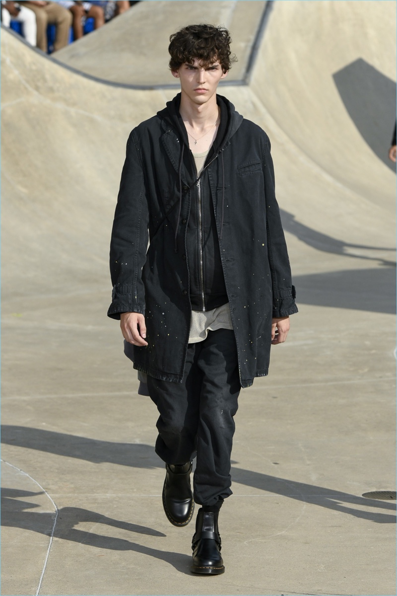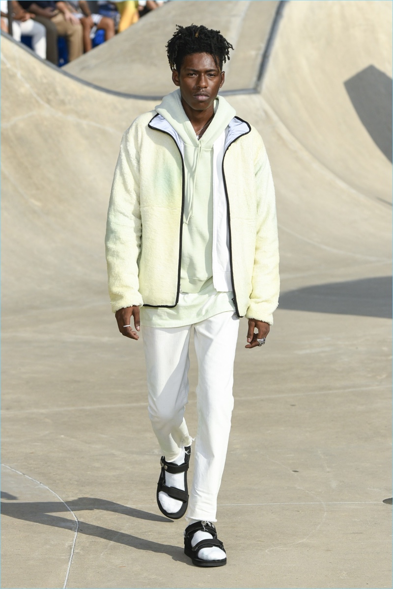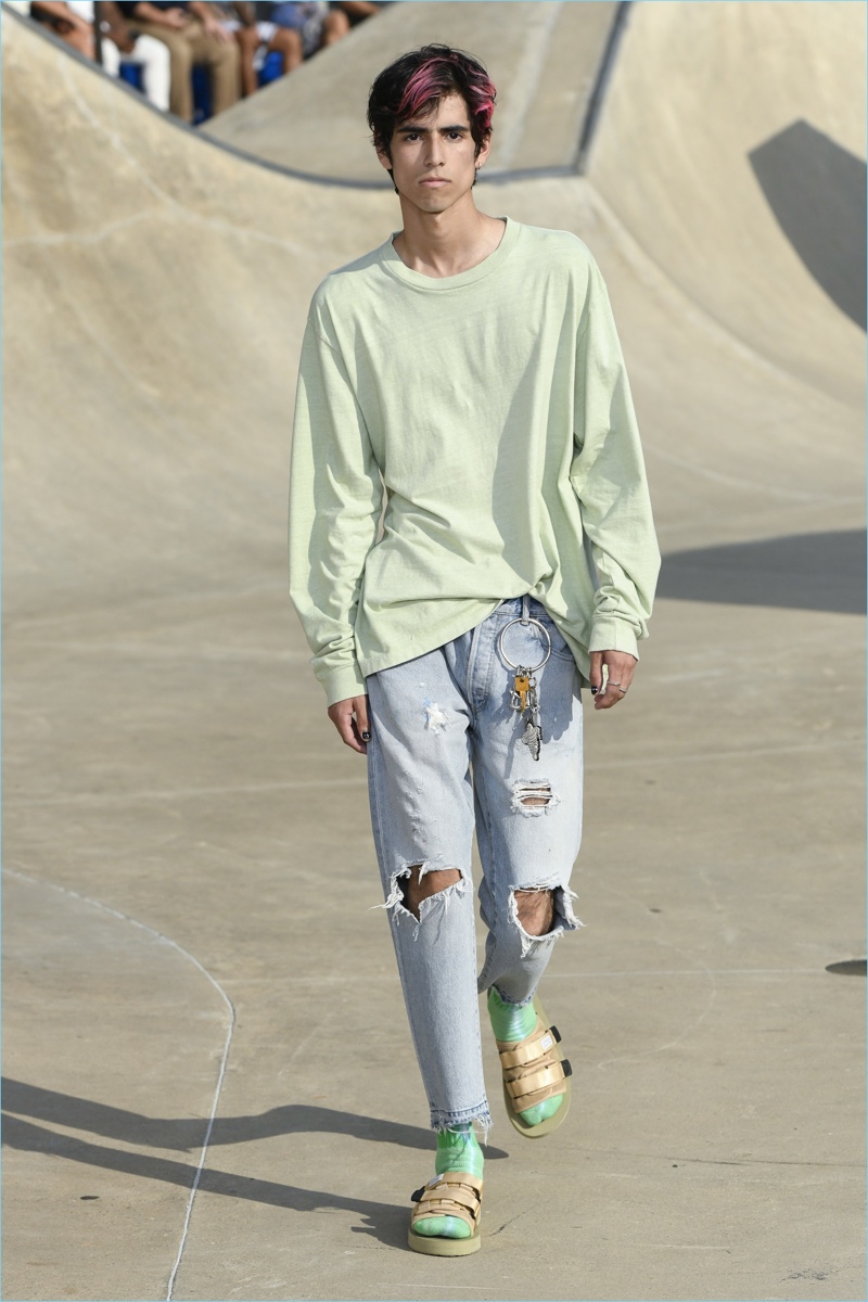 John Elliott captures the spirit of his own personal Los Angeles for spring-summer 2019. The designer took to a New York skatepark to showcase his latest designs. Taking in his own surroundings, Elliott discovered inspiration in everything from oil slicks in the street to sun-faded clothes. The nuances of life complement Elliott’s approach to menswear. A streetwear vibe meets a fashionable narrative as the designer tackles a practical wardrobe. The season takes shape with a sun-kissed color palette juxtaposed with the everyday ease of black. Highlights include slouchy cardigans, short-sleeve hooded tops, relaxed pants, ripped denim, and light parkas.