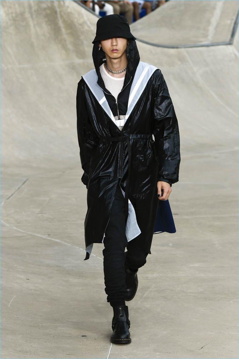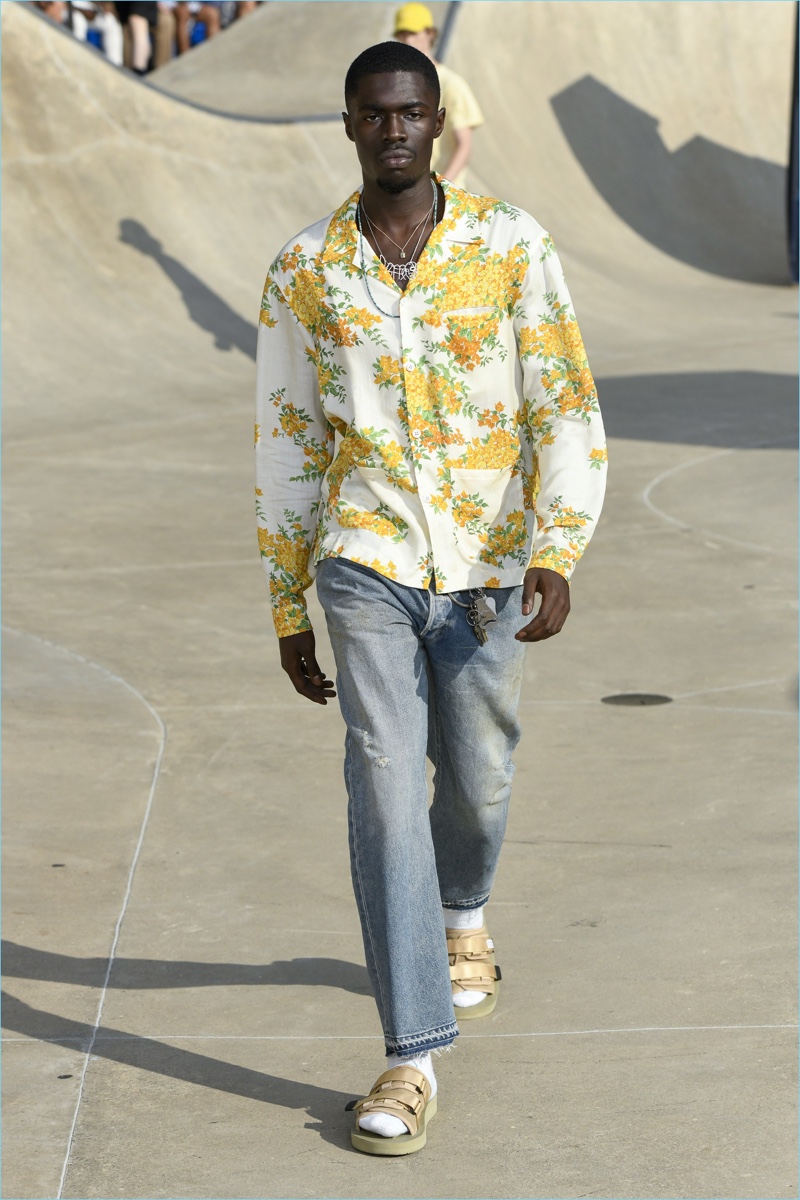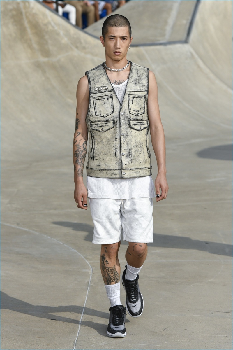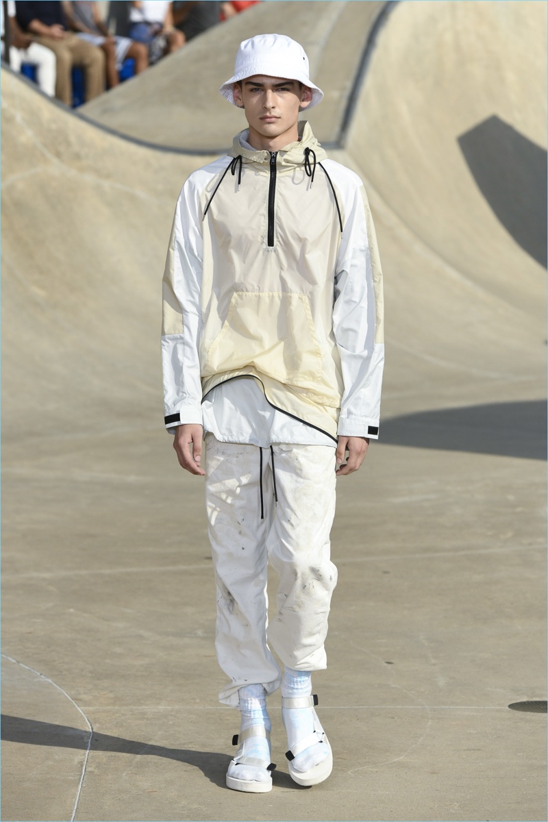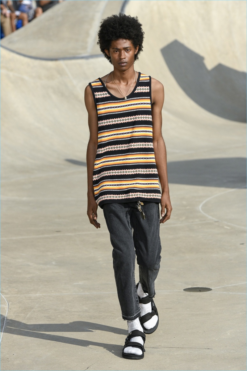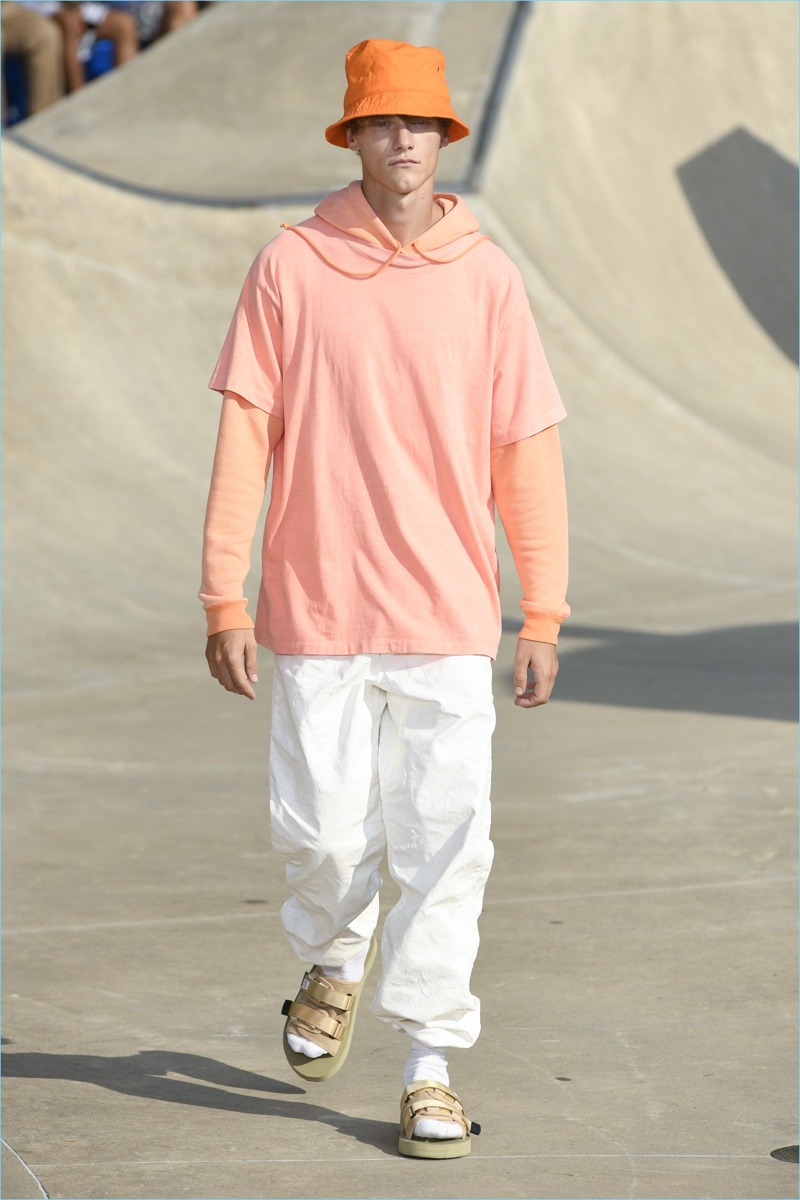 John Elliott captures the spirit of his own personal Los Angeles for spring-summer 2019. The designer took to a New York skatepark to showcase his latest designs. Taking in his own surroundings, Elliott discovered inspiration in everything from oil slicks in the street to sun-faded clothes. The nuances of life complement Elliott’s approach to menswear. A streetwear vibe meets a fashionable narrative as the designer tackles a practical wardrobe. The season takes shape with a sun-kissed color palette juxtaposed with the everyday ease of black. Highlights include slouchy cardigans, short-sleeve hooded tops, relaxed pants, ripped denim, and light parkas.
