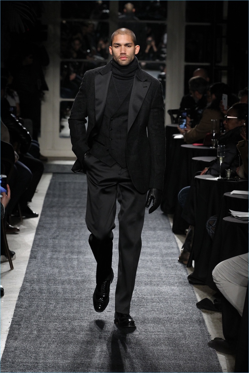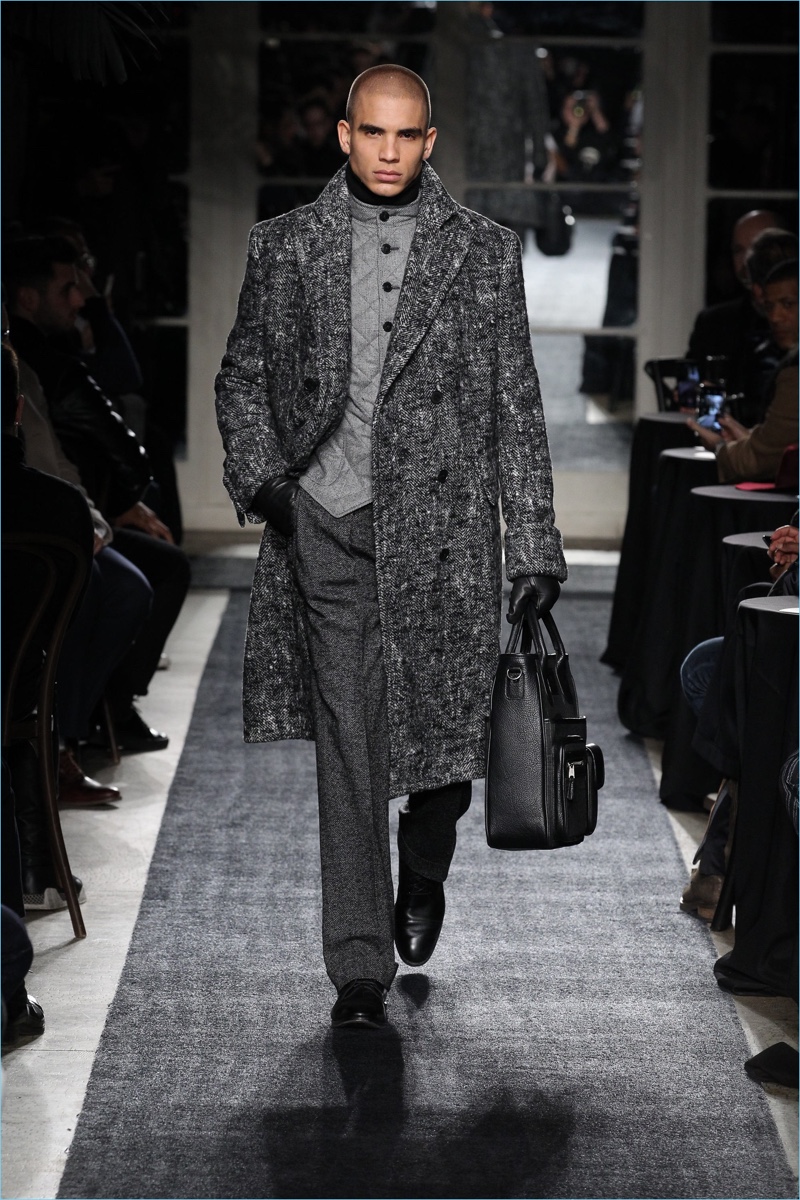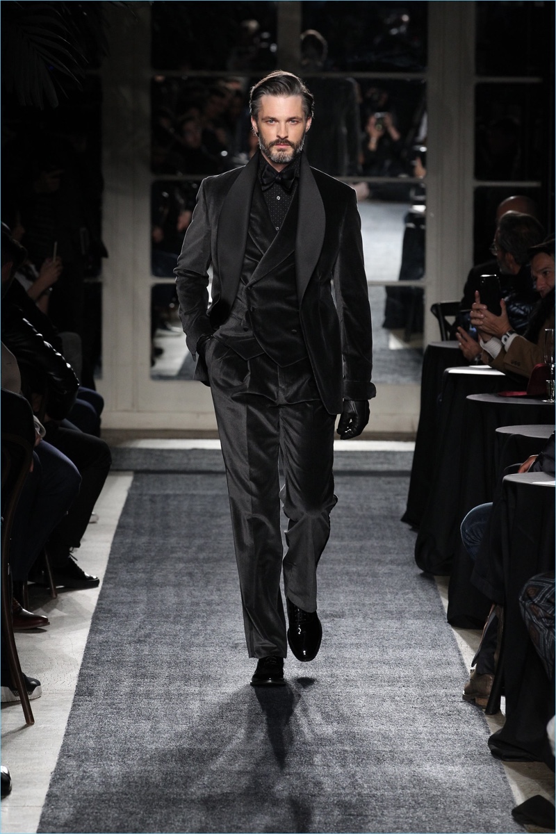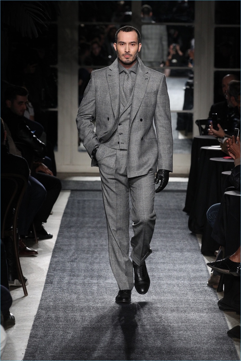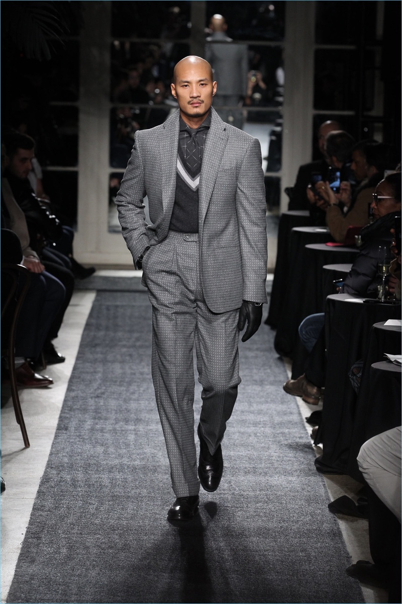 Looking to old Hollywood for inspiration, Abboud presents glamour in the vein of custom suits. Celebrating the art of tailoring, shades of black and grey come together with red accents. Hand-finished products shine with an impeccable wardrobe of plunging v-neck sweaters, pleated trousers, sport coats, and a bold abundance of quilting.