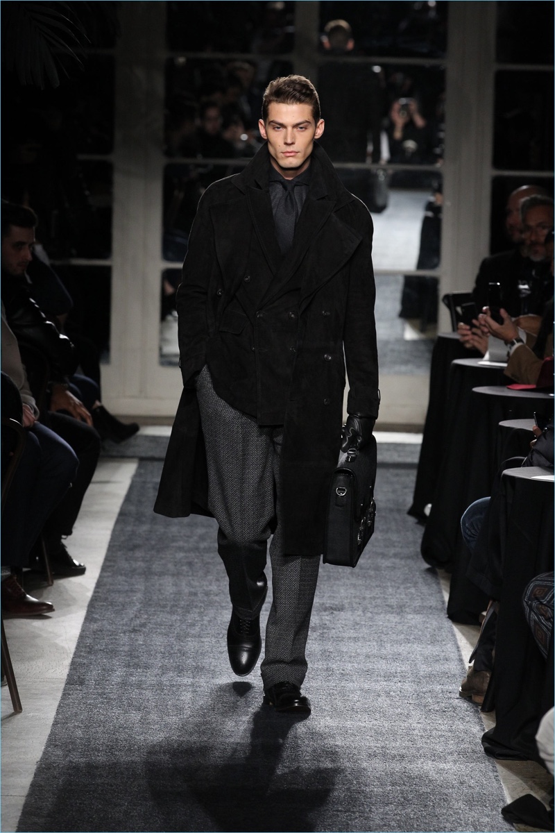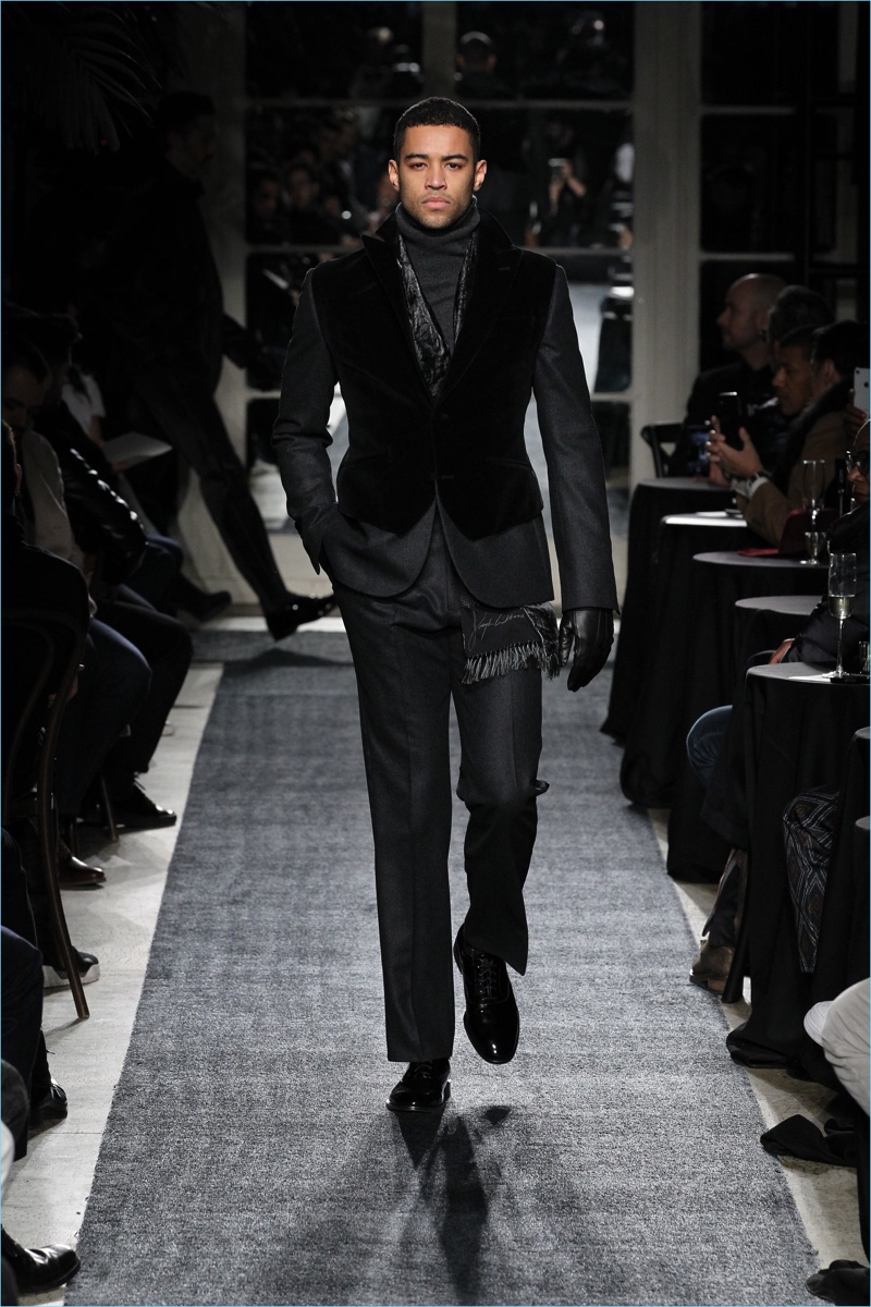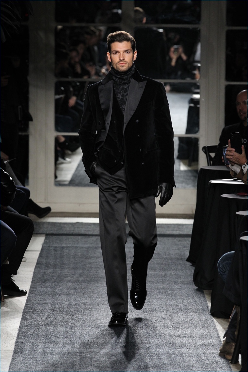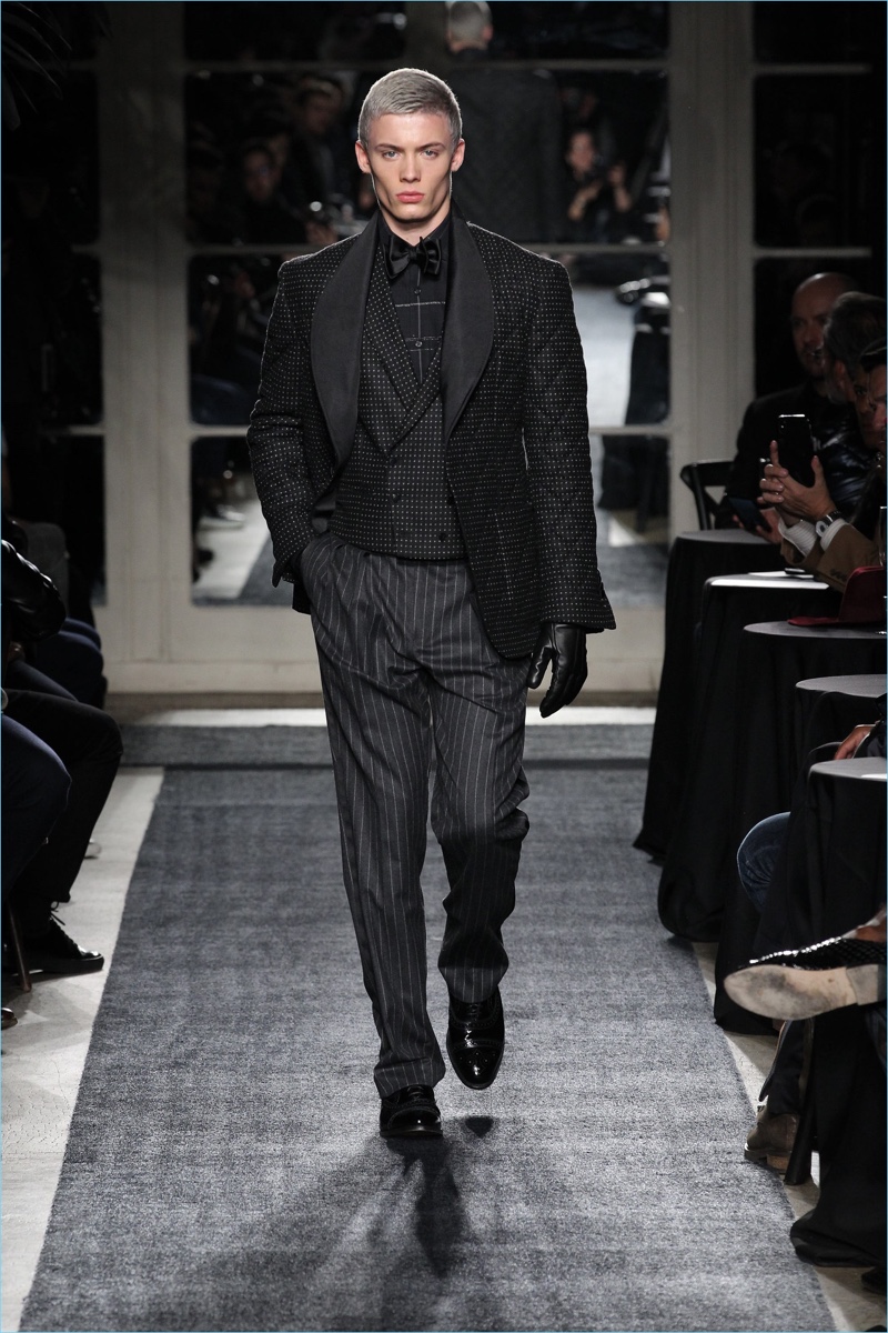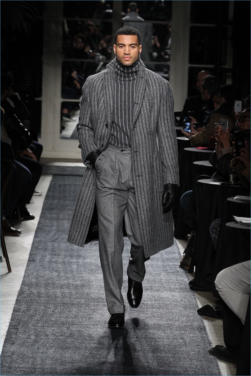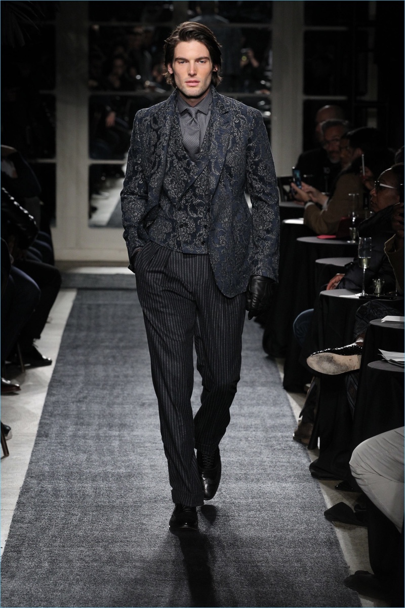 Looking to old Hollywood for inspiration, Abboud presents glamour in the vein of custom suits. Celebrating the art of tailoring, shades of black and grey come together with red accents. Hand-finished products shine with an impeccable wardrobe of plunging v-neck sweaters, pleated trousers, sport coats, and a bold abundance of quilting.