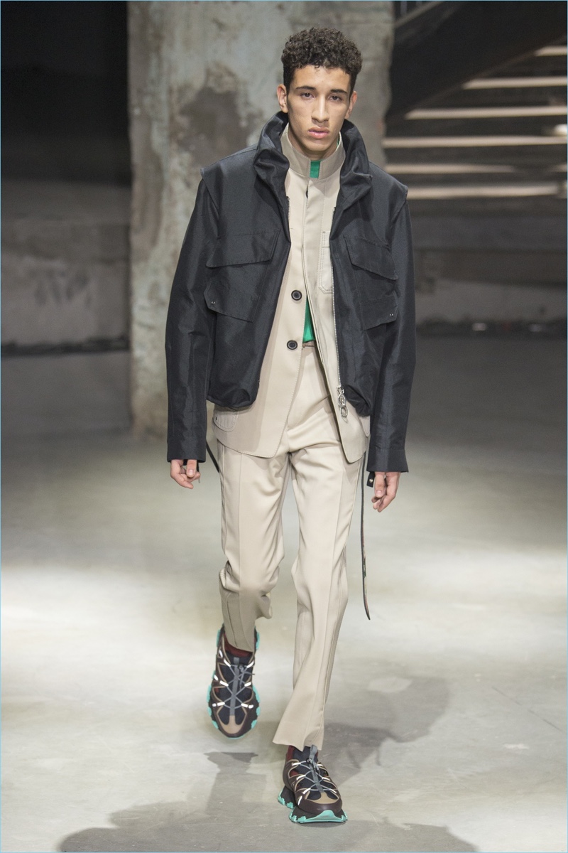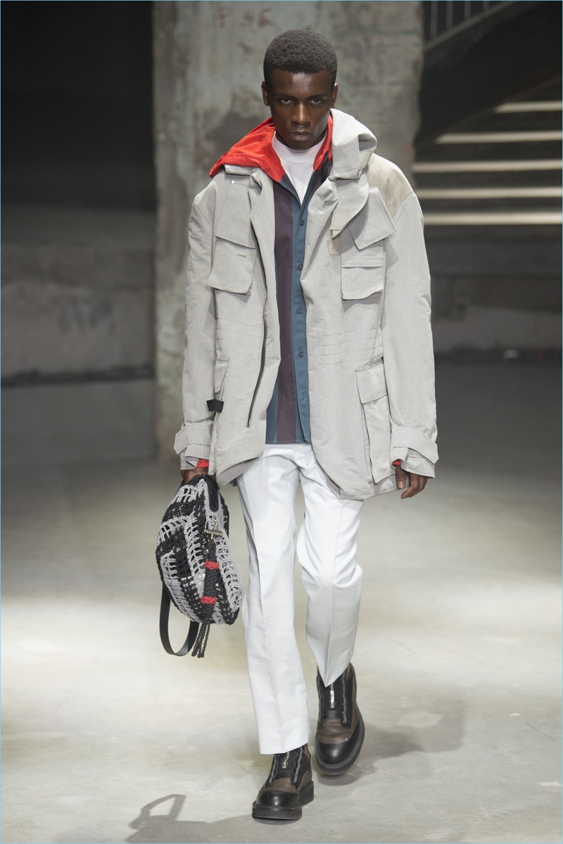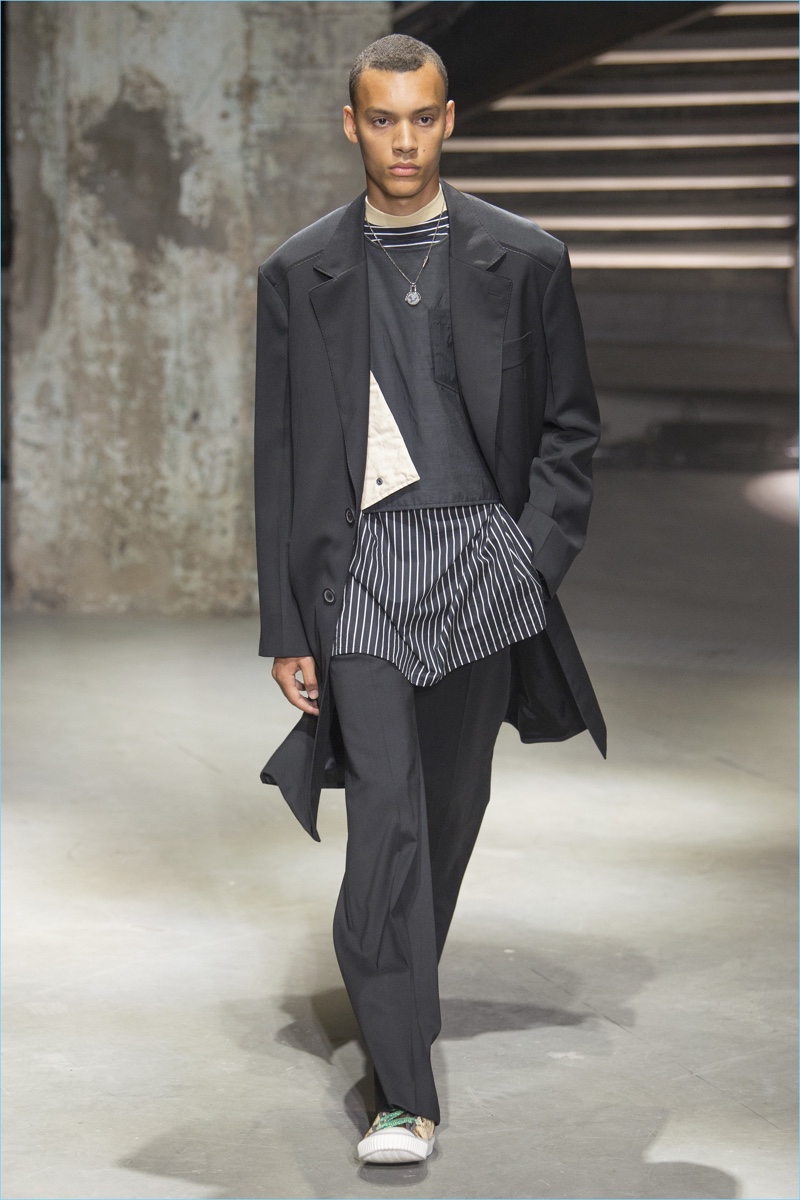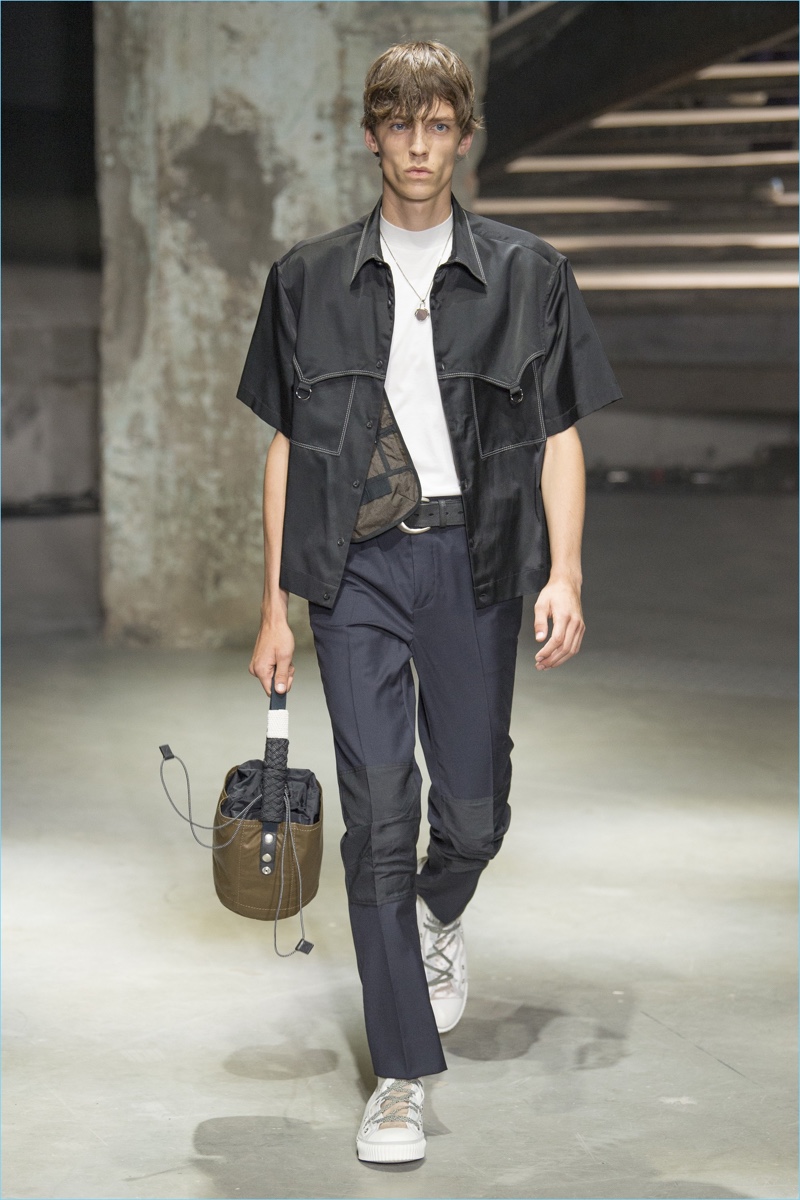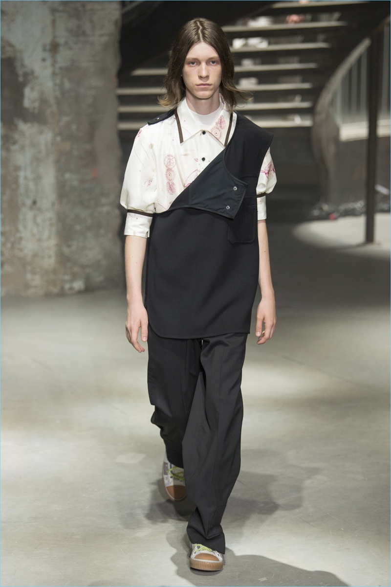 Lucas Ossendrijver explores a series of contrasts for Lanvin’s spring-summer 2019 collection. The Dutch designer references contrast such as night and day or soft and hard. Proposing a juxtaposition of casual and formal, Ossendrijver delivers a collection with strengths that rest in the details. Revisiting clothing items such as a pair of cargo pants, Ossendrijver transferred its pockets to a pair of pleated trousers. Meanwhile, shirts were elongated and turned backward for a fresh approach. Lanvin’s man also found his inner fisherman with utilitarian coats and jackets that were outfitted with pockets of various sizes. Another highlight of the season, vests and polos were shrunken down and layered with shirts of enlarged proportions.