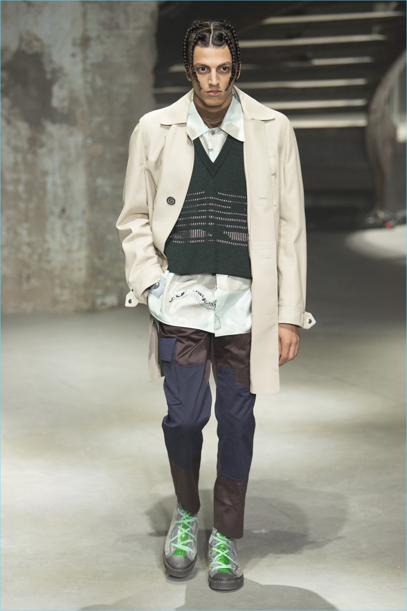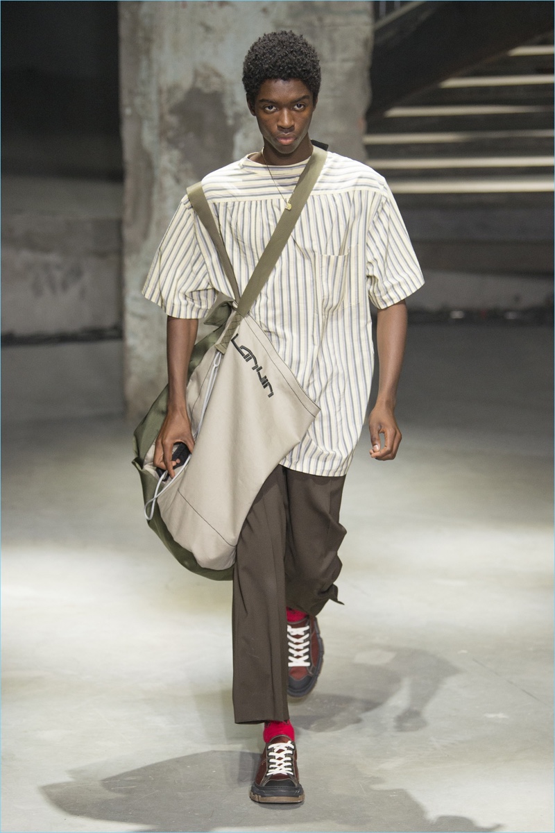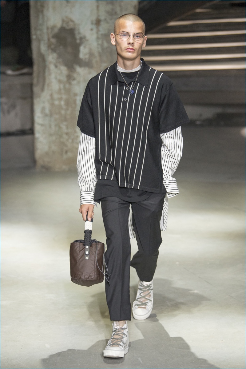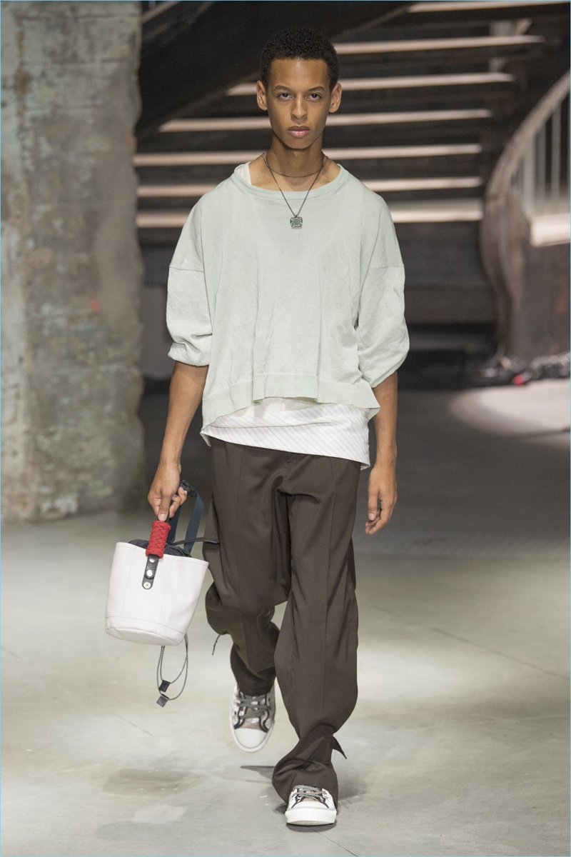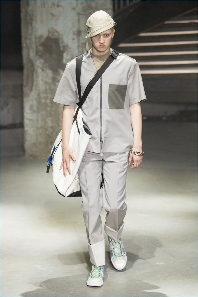 Lucas Ossendrijver explores a series of contrasts for Lanvin’s spring-summer 2019 collection. The Dutch designer references contrast such as night and day or soft and hard. Proposing a juxtaposition of casual and formal, Ossendrijver delivers a collection with strengths that rest in the details. Revisiting clothing items such as a pair of cargo pants, Ossendrijver transferred its pockets to a pair of pleated trousers. Meanwhile, shirts were elongated and turned backward for a fresh approach. Lanvin’s man also found his inner fisherman with utilitarian coats and jackets that were outfitted with pockets of various sizes. Another highlight of the season, vests and polos were shrunken down and layered with shirts of enlarged proportions.