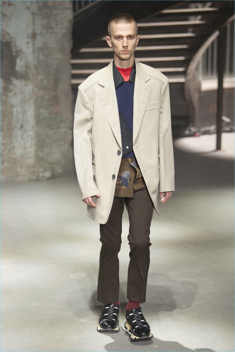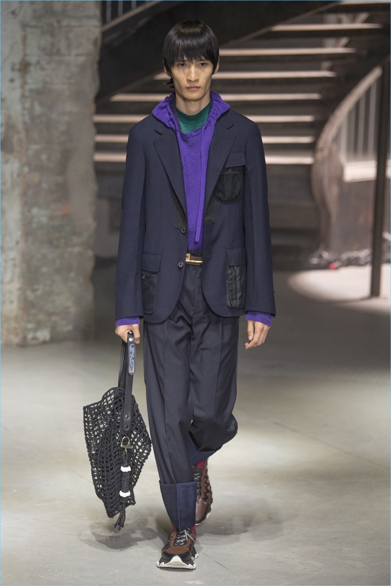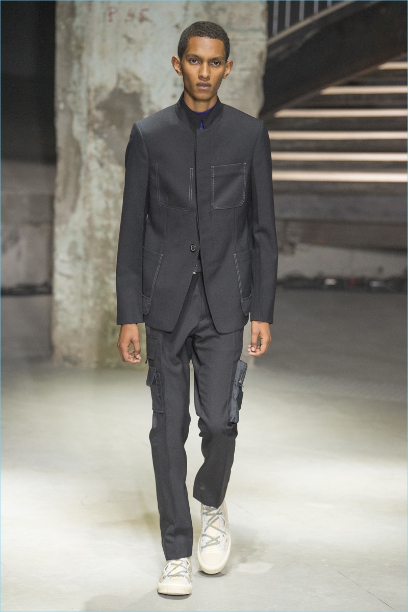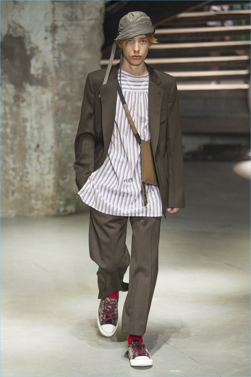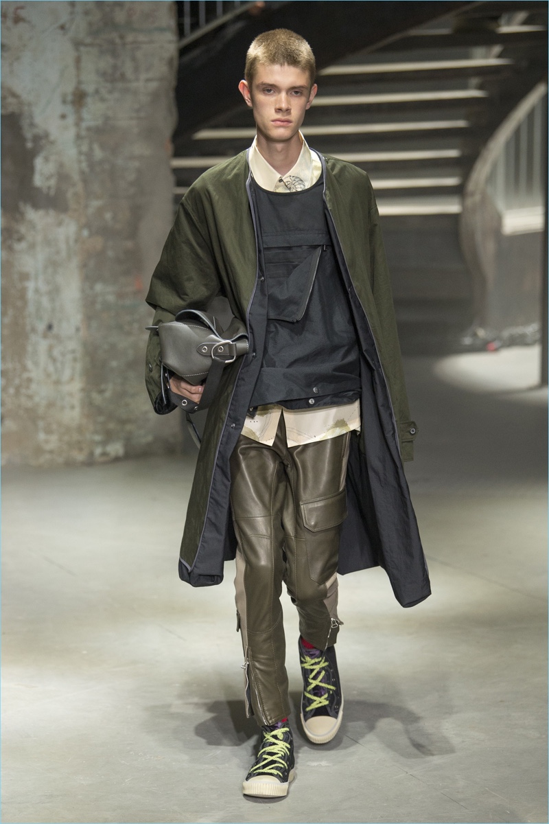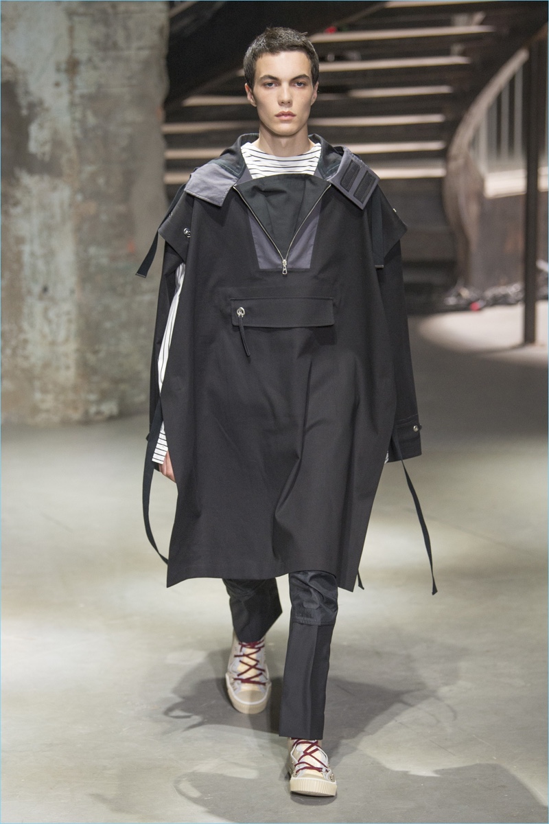 Lucas Ossendrijver explores a series of contrasts for Lanvin’s spring-summer 2019 collection. The Dutch designer references contrast such as night and day or soft and hard. Proposing a juxtaposition of casual and formal, Ossendrijver delivers a collection with strengths that rest in the details. Revisiting clothing items such as a pair of cargo pants, Ossendrijver transferred its pockets to a pair of pleated trousers. Meanwhile, shirts were elongated and turned backward for a fresh approach. Lanvin’s man also found his inner fisherman with utilitarian coats and jackets that were outfitted with pockets of various sizes. Another highlight of the season, vests and polos were shrunken down and layered with shirts of enlarged proportions.