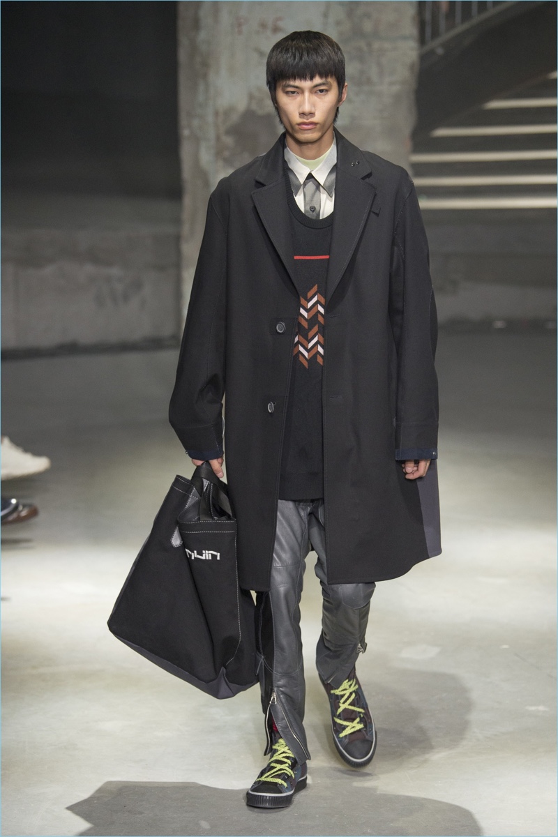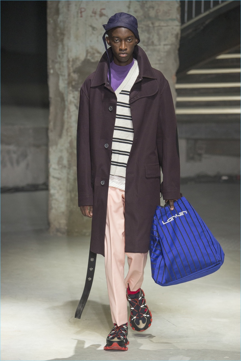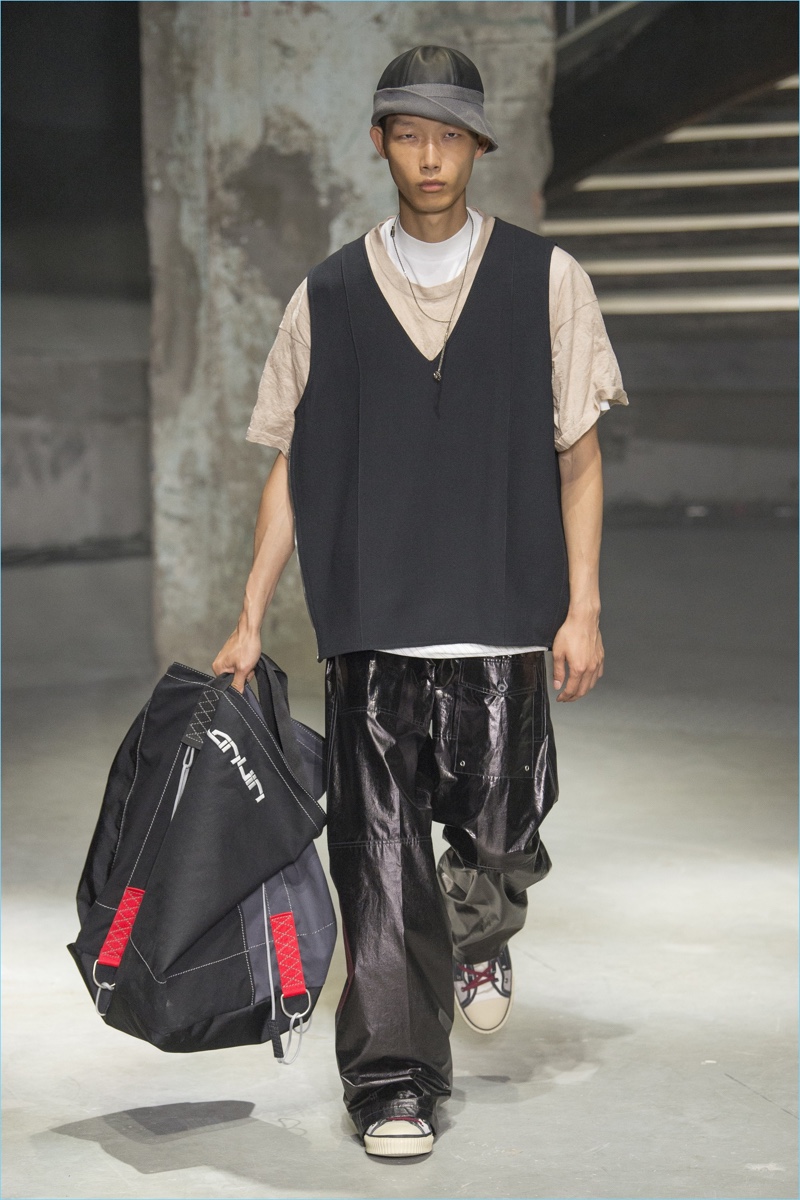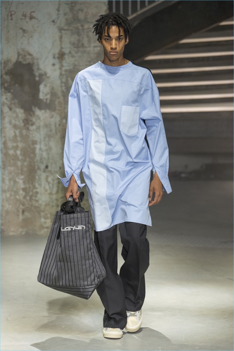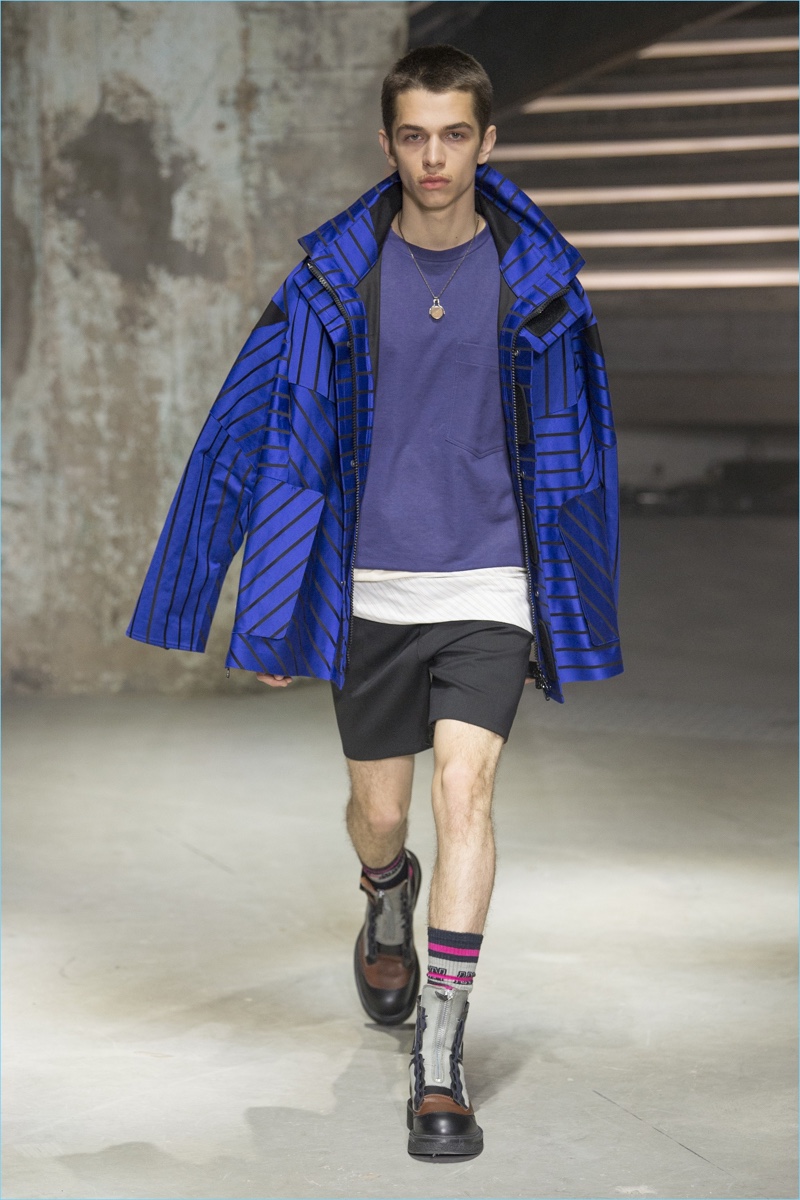 Lucas Ossendrijver explores a series of contrasts for Lanvin’s spring-summer 2019 collection. The Dutch designer references contrast such as night and day or soft and hard. Proposing a juxtaposition of casual and formal, Ossendrijver delivers a collection with strengths that rest in the details. Revisiting clothing items such as a pair of cargo pants, Ossendrijver transferred its pockets to a pair of pleated trousers. Meanwhile, shirts were elongated and turned backward for a fresh approach. Lanvin’s man also found his inner fisherman with utilitarian coats and jackets that were outfitted with pockets of various sizes. Another highlight of the season, vests and polos were shrunken down and layered with shirts of enlarged proportions.