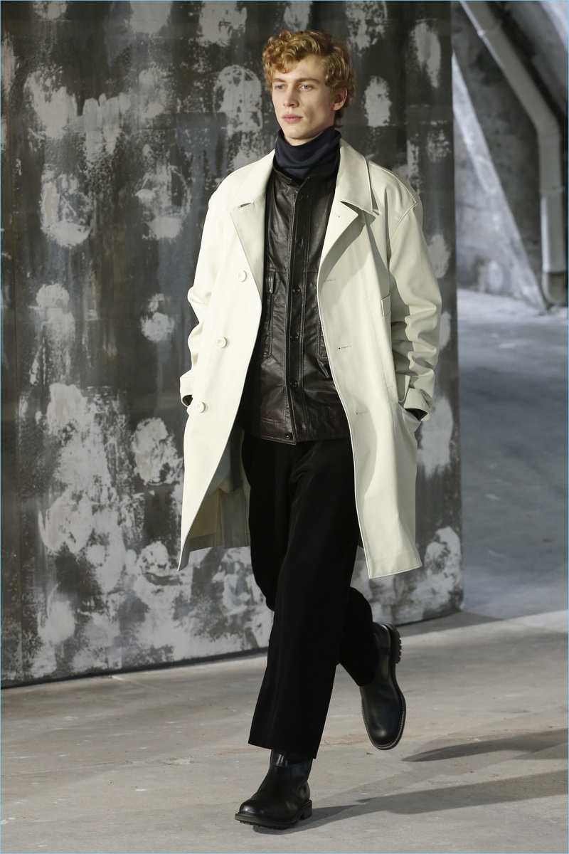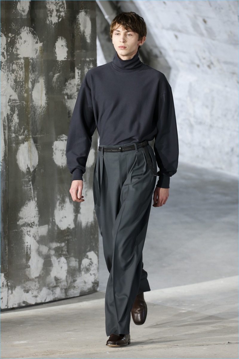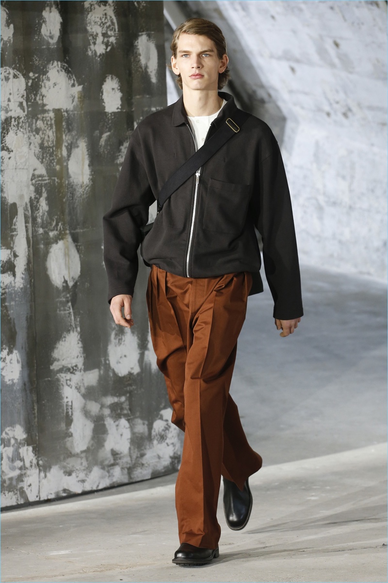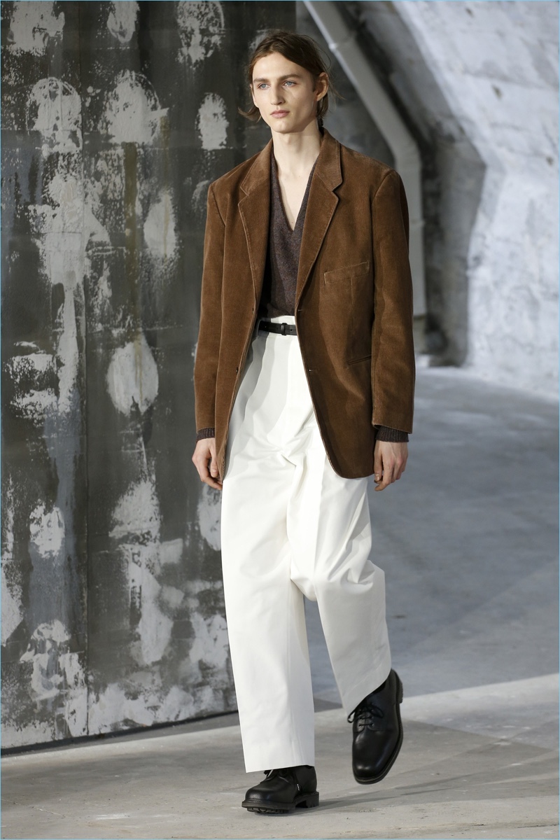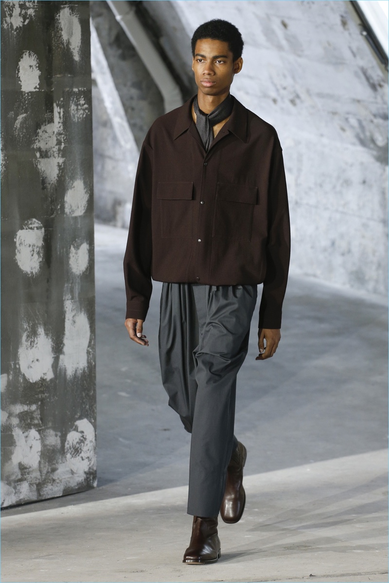 Lemaire takes a page from the great works of Leo Tolstoy for its fall-winter 2018 collection. Designer Christophe Lemaire looks to Russian folk culture to inform his spin on the season. However, for Lemaire, this is minimal in nature. The charm in the designer’s approach to menswear is found in modest details but modern silhouettes. The new collection features oversized coats, elongated tops, mock neck tops, and cropped trousers. Adding prints to the narrative, Lemaire embraces paisley prints. Meanwhile, the color palette keeps the selection grounded with somber and dusty hues.