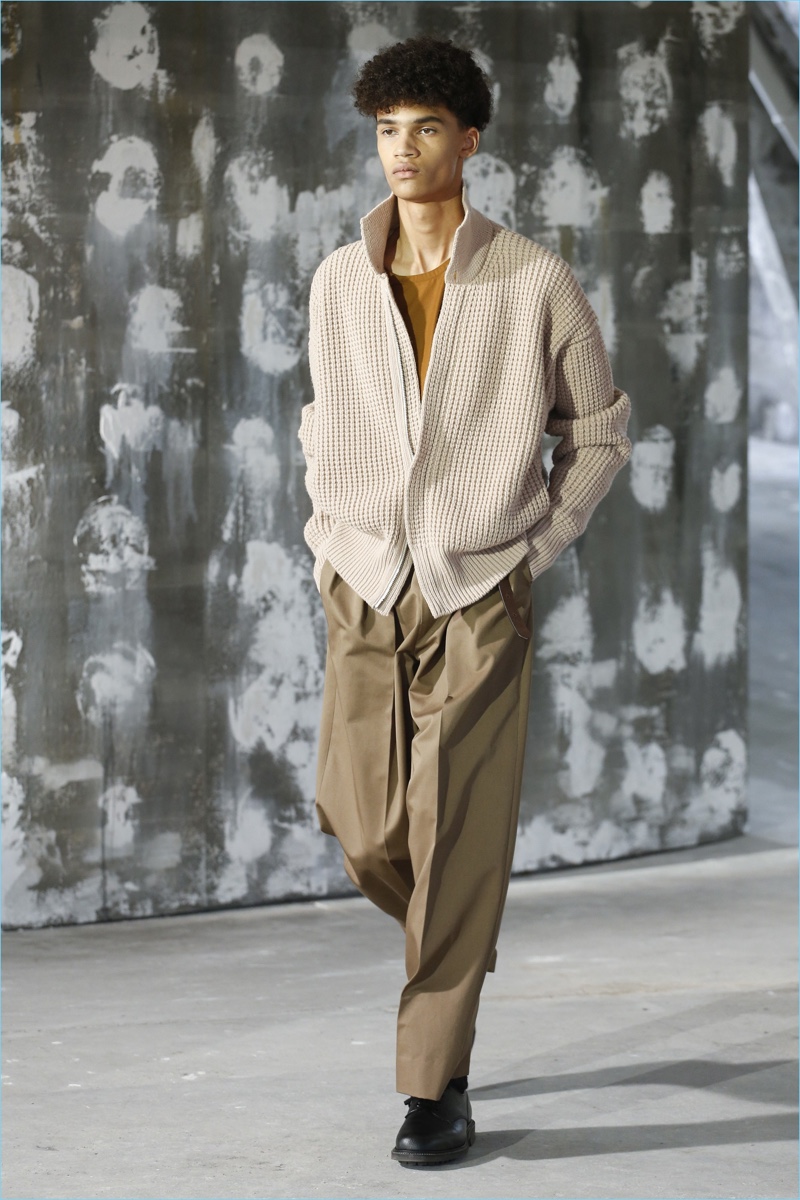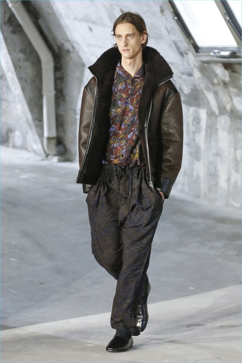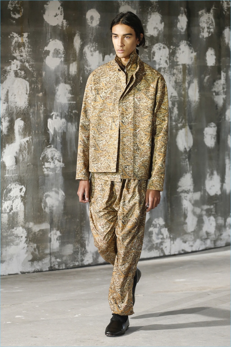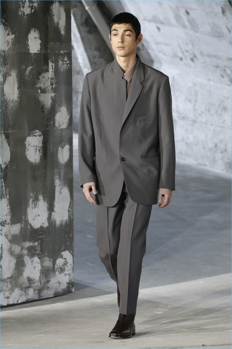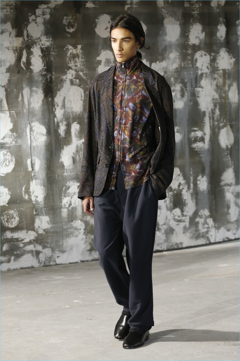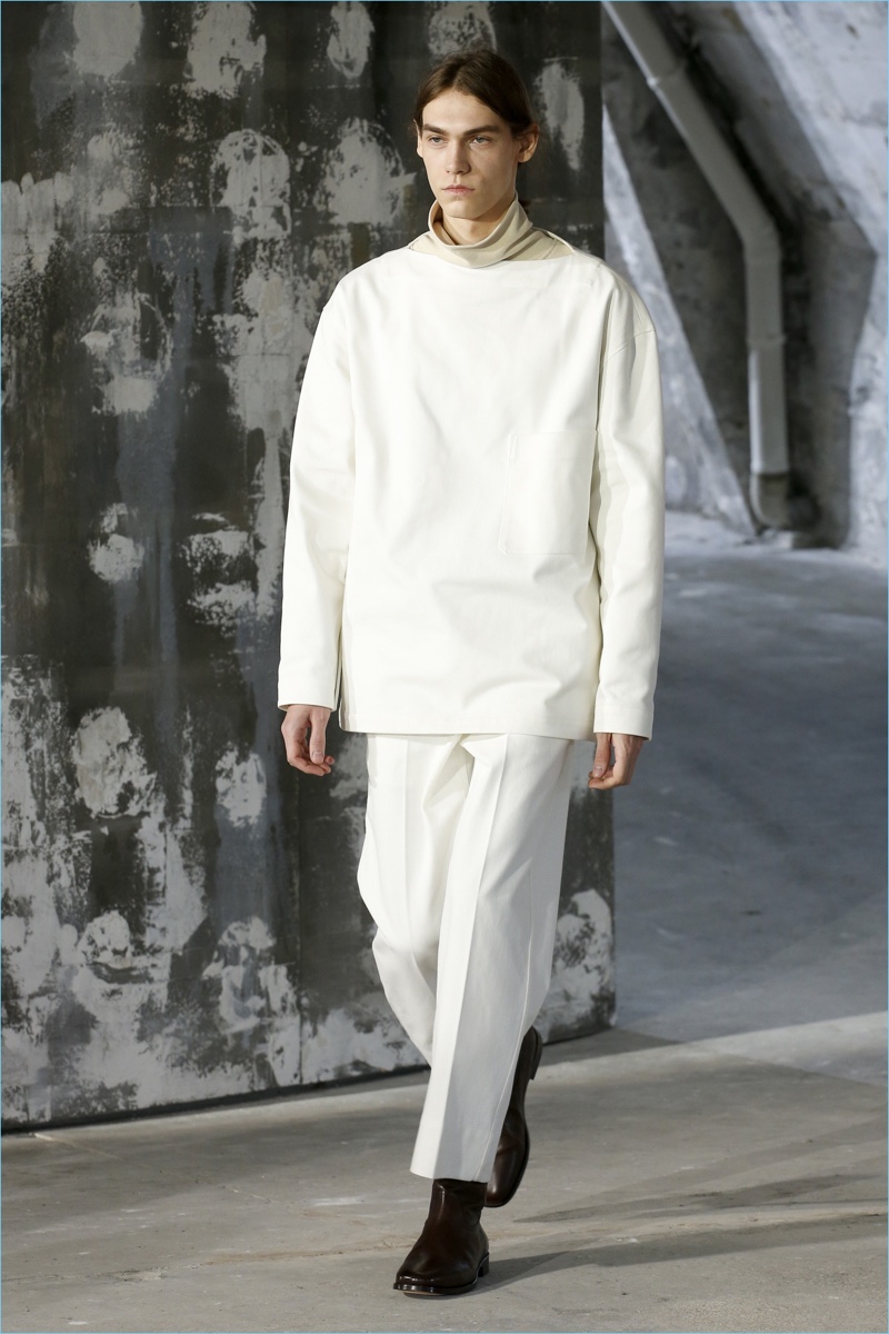 Lemaire takes a page from the great works of Leo Tolstoy for its fall-winter 2018 collection. Designer Christophe Lemaire looks to Russian folk culture to inform his spin on the season. However, for Lemaire, this is minimal in nature. The charm in the designer’s approach to menswear is found in modest details but modern silhouettes. The new collection features oversized coats, elongated tops, mock neck tops, and cropped trousers. Adding prints to the narrative, Lemaire embraces paisley prints. Meanwhile, the color palette keeps the selection grounded with somber and dusty hues.