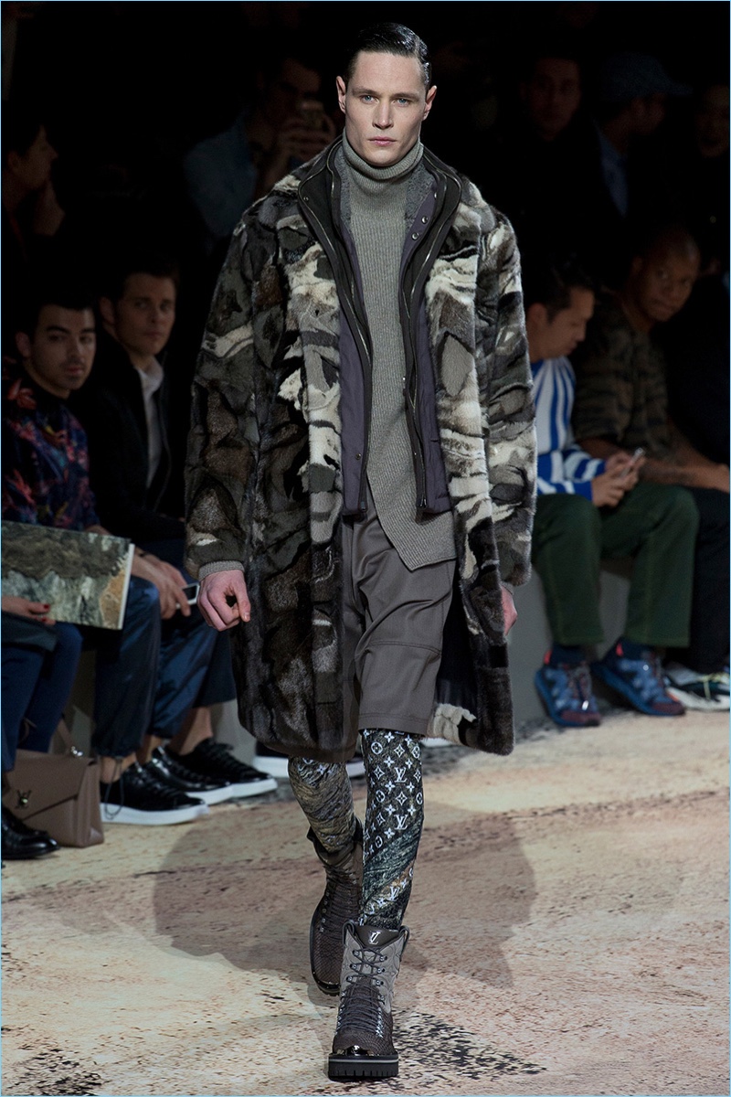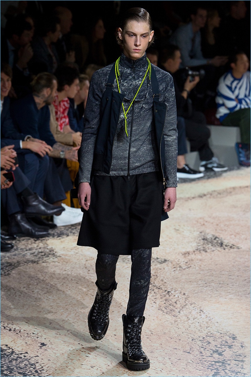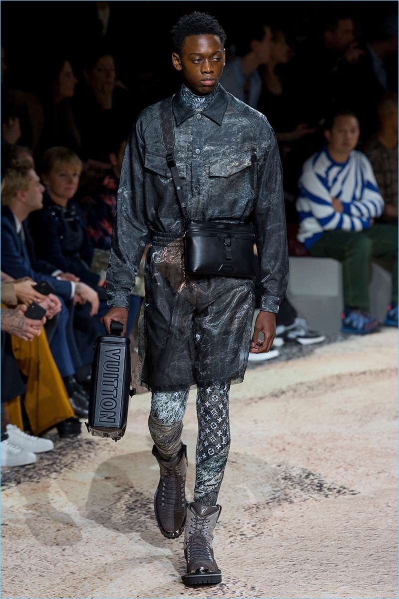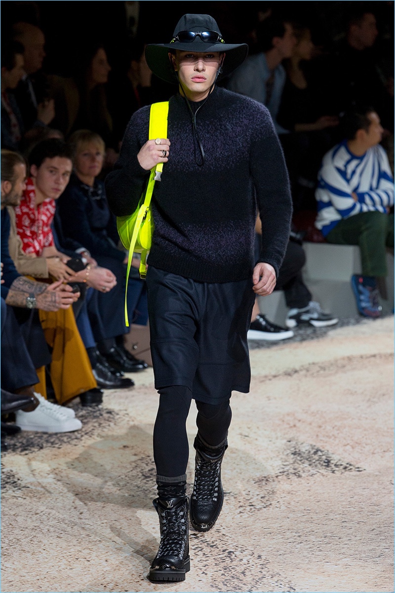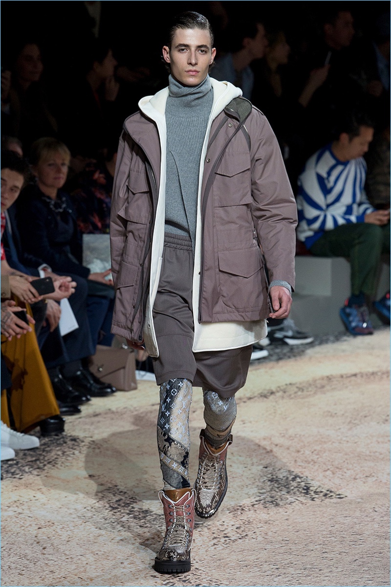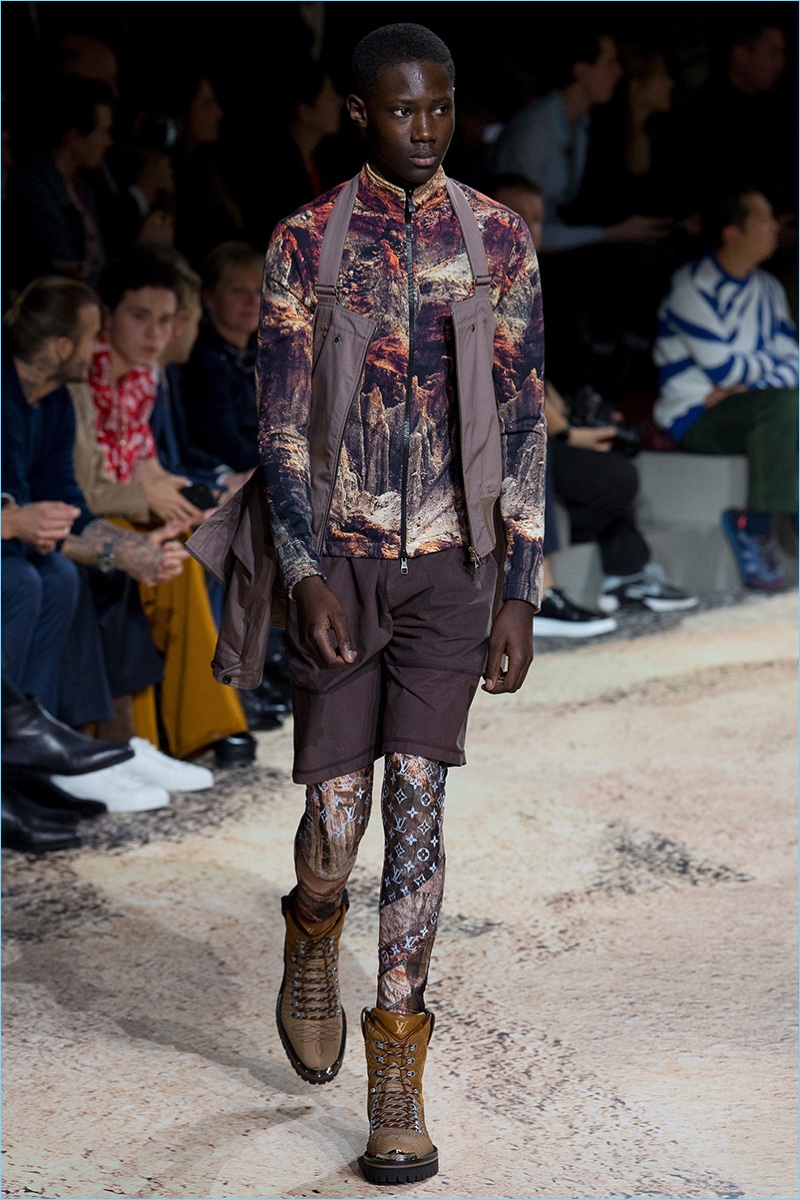 After nearly a decade as Louis Vuitton men’s artistic director, Kim Jones bids farewell to the fashion house with his fall-winter 2018 collection. Since taking the creative reigns of Louis Vuitton in 2011, Jones has celebrated the brand’s storied heritage with grand visions of travel and this season is no different. The English designer entitled his final collection “Overview” and looked at aerial images of Kenya for inspiration. The results revolve around the idea of the modern explorer, clad in prints and earthy tones. Embracing an active spirit, models took to the catwalk in layered shorts, leggings, and trousers. Hiking boots complemented the ruggedness of dark LV logo prints and aerial graphics. Meanwhile, pops of color decorated outerwear and covetable knits. Closing out the show, Jones celebrated the end of a cherished era with friends Kate Moss and Naomi Campbell.