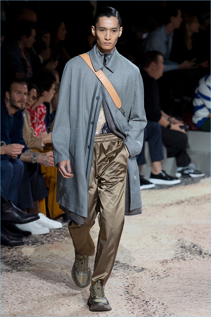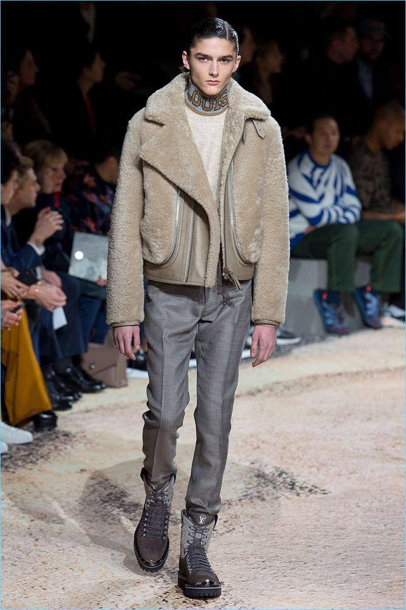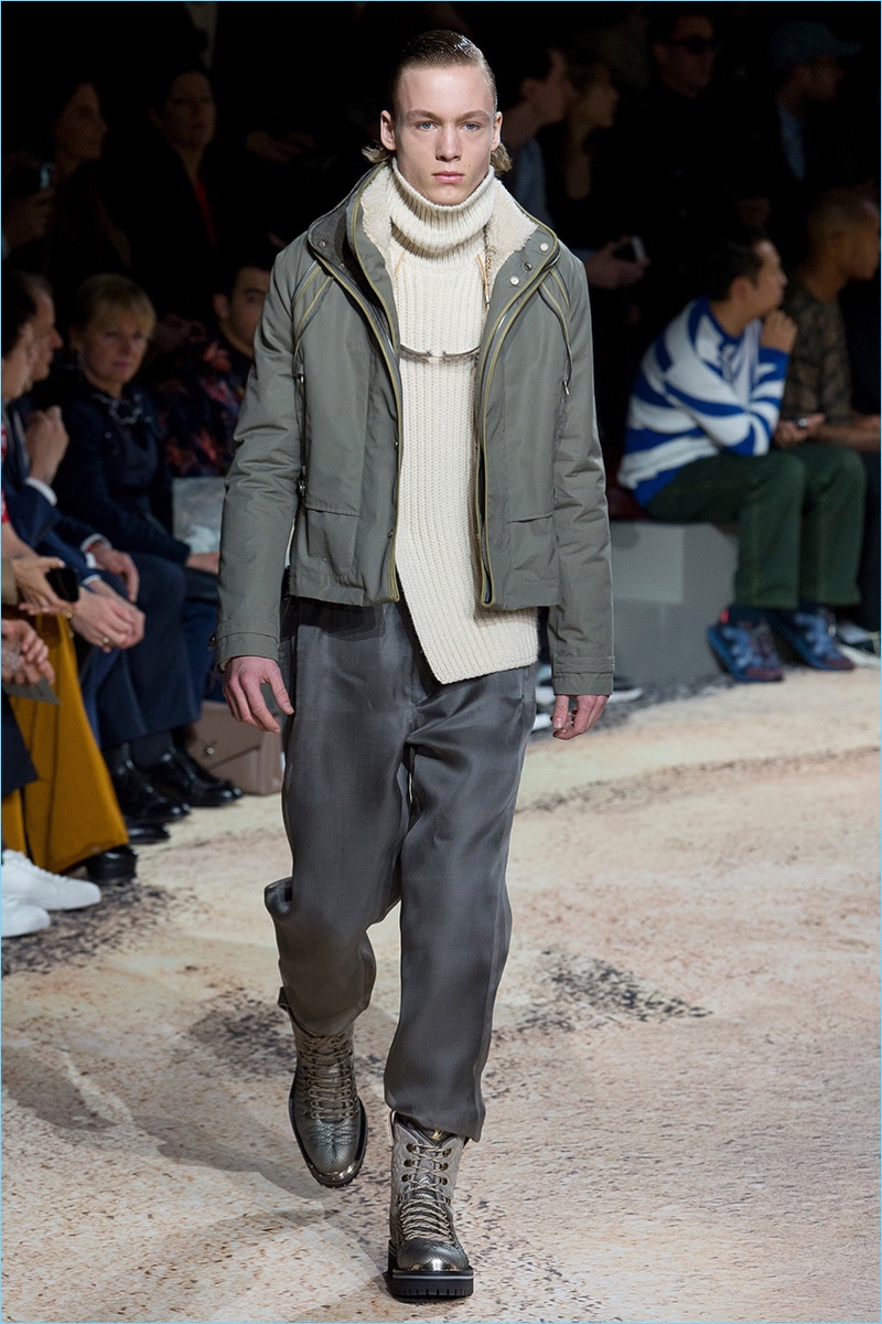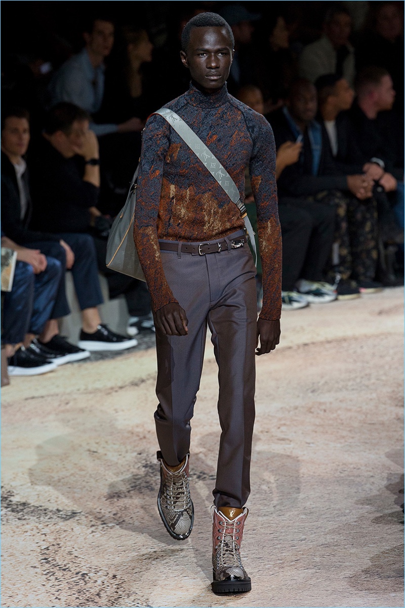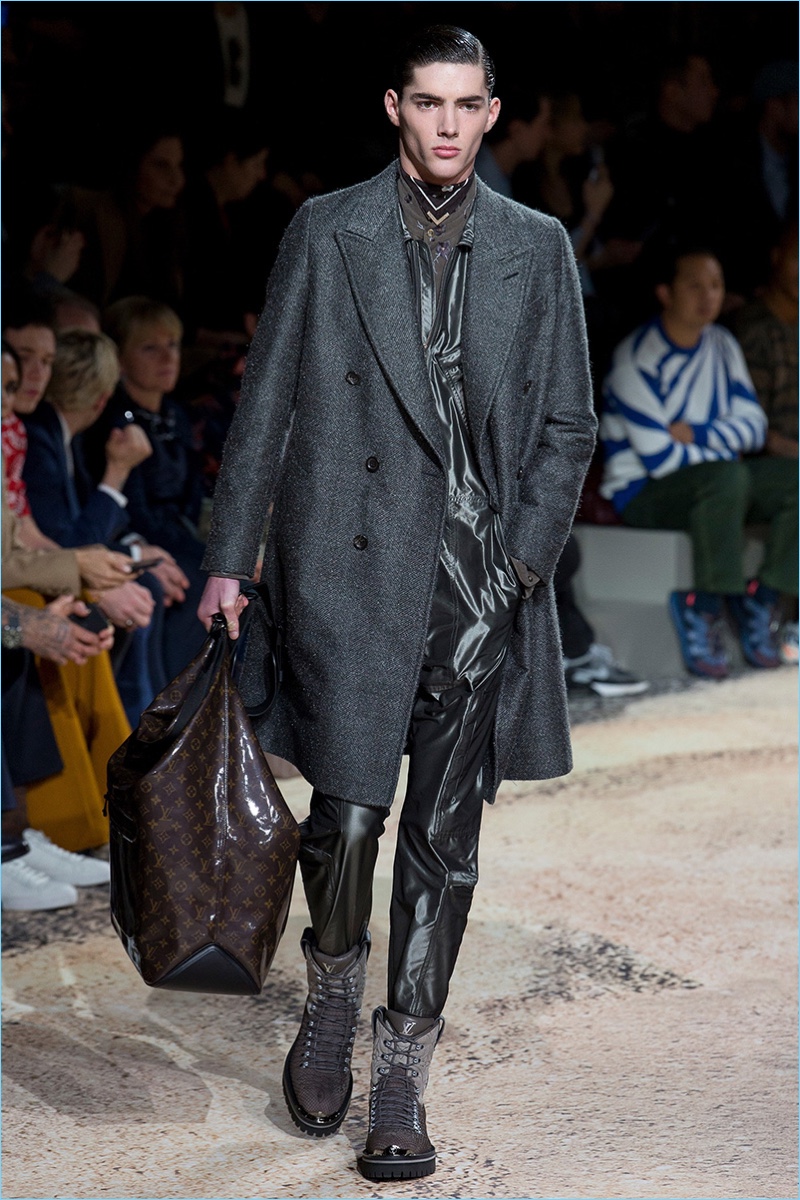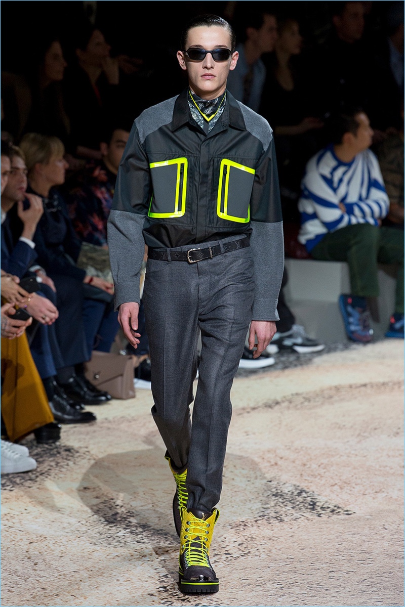 After nearly a decade as Louis Vuitton men’s artistic director, Kim Jones bids farewell to the fashion house with his fall-winter 2018 collection. Since taking the creative reigns of Louis Vuitton in 2011, Jones has celebrated the brand’s storied heritage with grand visions of travel and this season is no different. The English designer entitled his final collection “Overview” and looked at aerial images of Kenya for inspiration. The results revolve around the idea of the modern explorer, clad in prints and earthy tones. Embracing an active spirit, models took to the catwalk in layered shorts, leggings, and trousers. Hiking boots complemented the ruggedness of dark LV logo prints and aerial graphics. Meanwhile, pops of color decorated outerwear and covetable knits. Closing out the show, Jones celebrated the end of a cherished era with friends Kate Moss and Naomi Campbell.