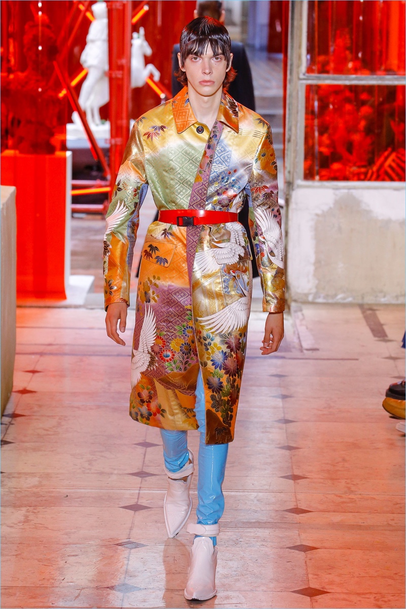 A fearless lineup includes sharply tailored jackets, pastel cigarette pants, corsets, and kimono-inspired outerwear. Bringing nontraditional elements such as sheer details into menswear, Galliano forces a discussion on masculinity. Forced to confront the collection and dissect each look, Galliano’s designs easily become more personal.