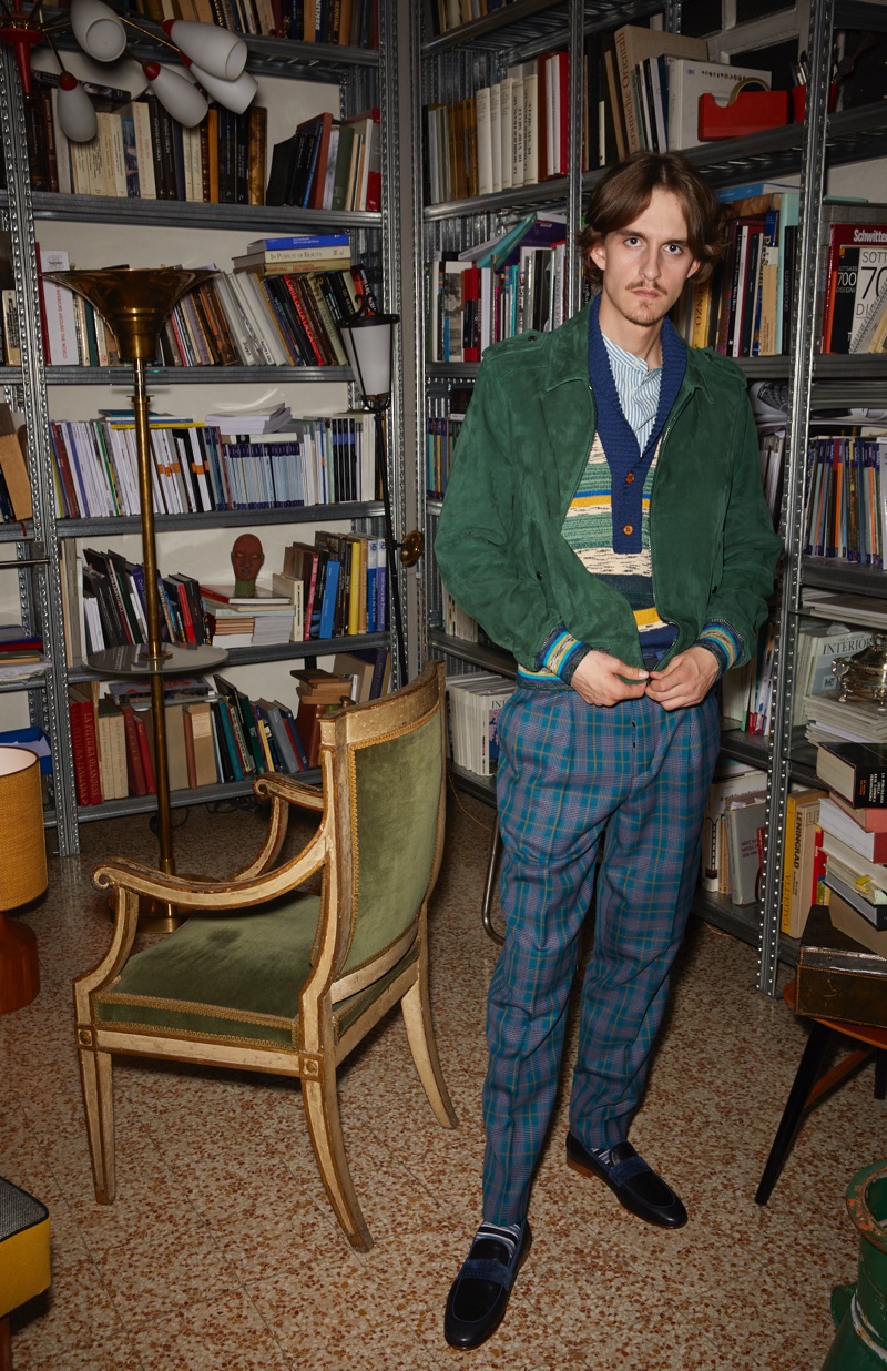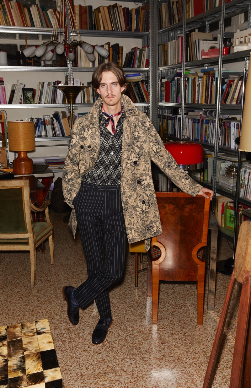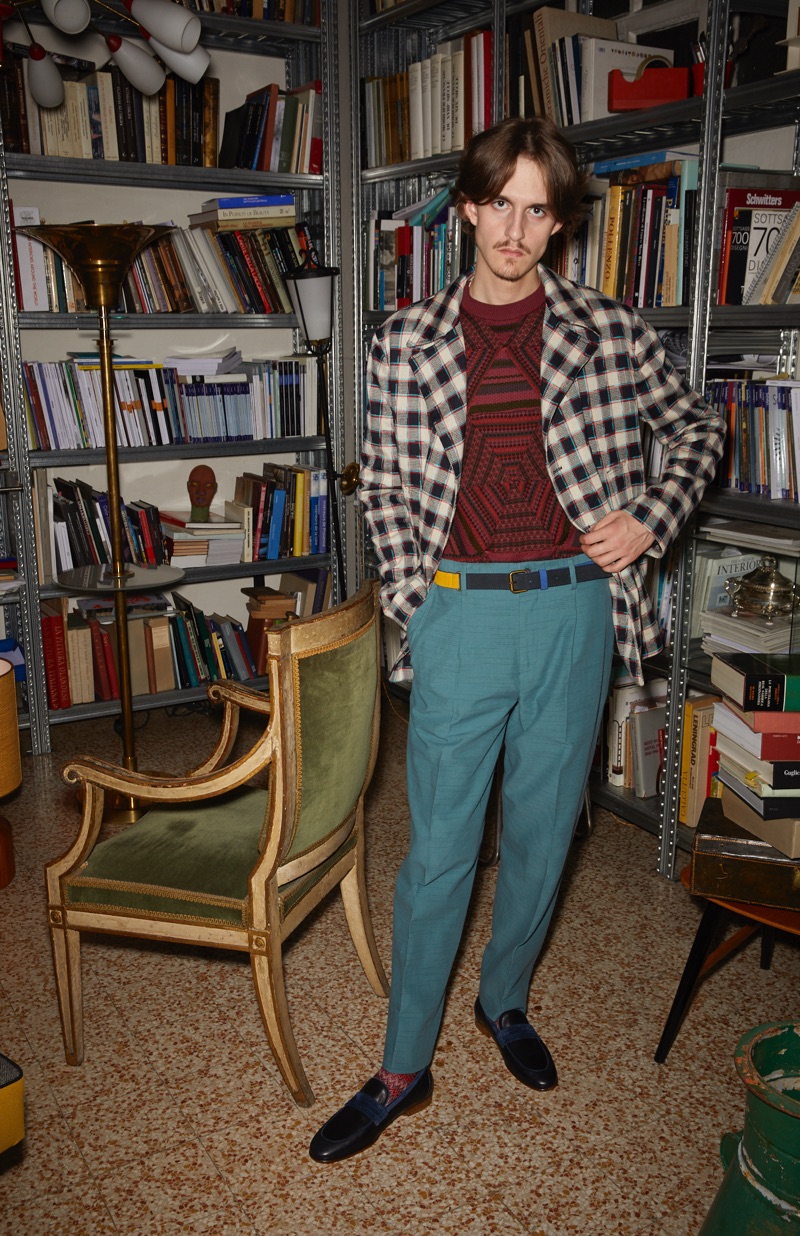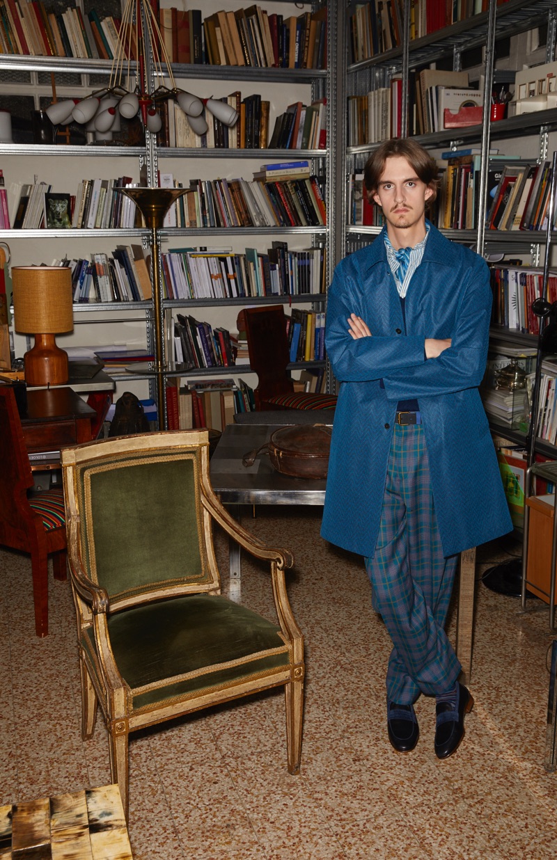The fashion house’s prints come together with a color palette of turquoise, jungle green, blue, sunflower yellow, bordeaux, pink, and tobacco. Relaxed silhouettes take shape in the form of a wardrobe, which includes double-breasted blazers, checked trousers, lightweight knits, and unstructured pea coats.