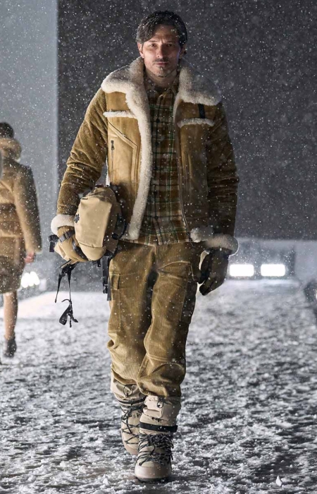 The clothes built a new alpine vernacular, ditching the traditional confines of ski gear in favor of city-slope hybrids. Ribbed turtlenecks were tucked into technical trousers; shearling bombers sat over plaid shirting; oversized scarves trailed beneath long trench-style coats.