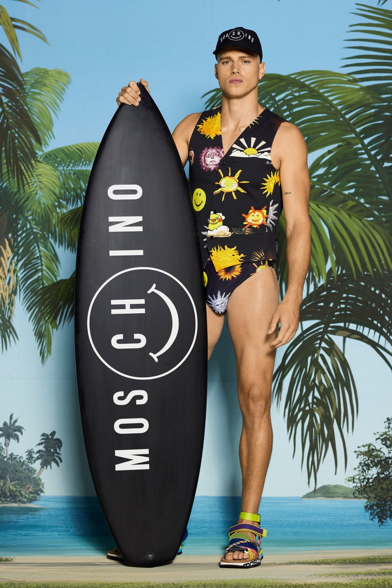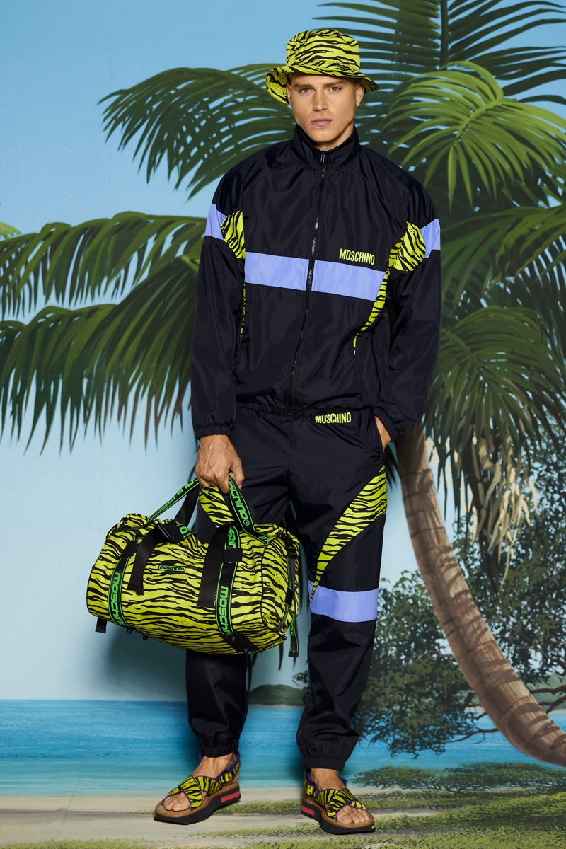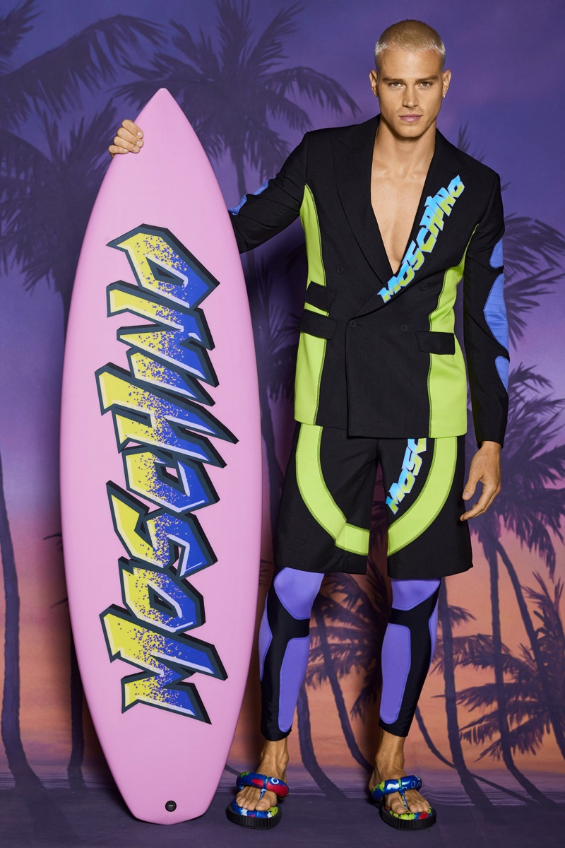 Dreams of Venice Beach and summer bods inform Jeremy Scott’s latest vision for Moschino. Scott unveils Moschino’s resort 2022 collection with a penchant for scuba material. The creative director delivers escapism with his unique blend of electric prints and bold colors.